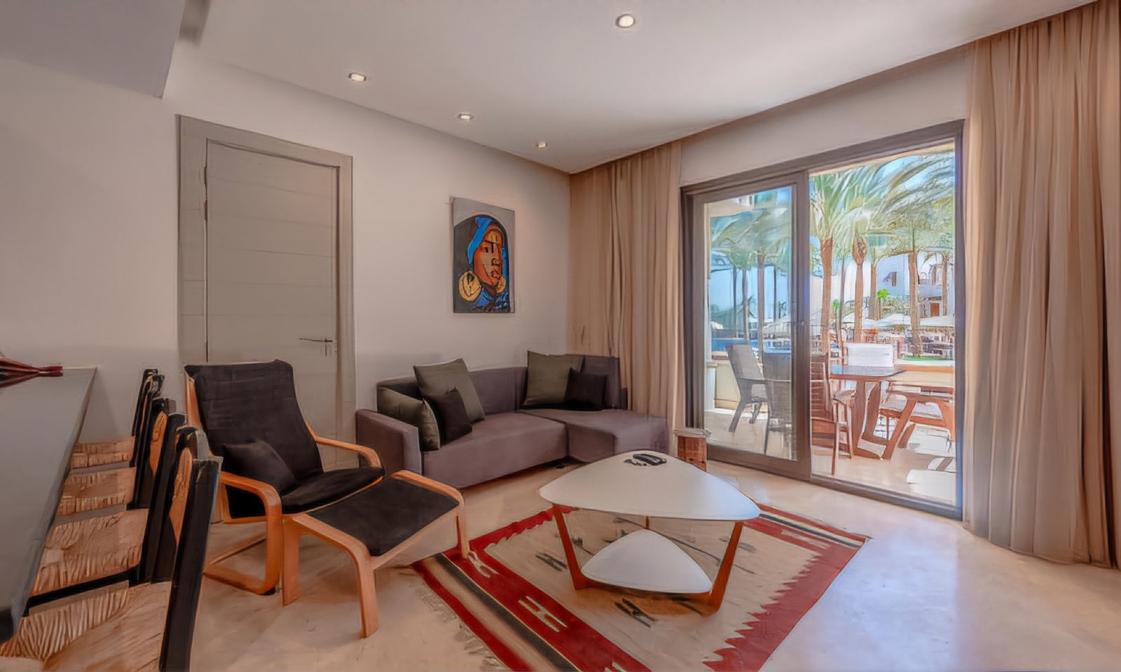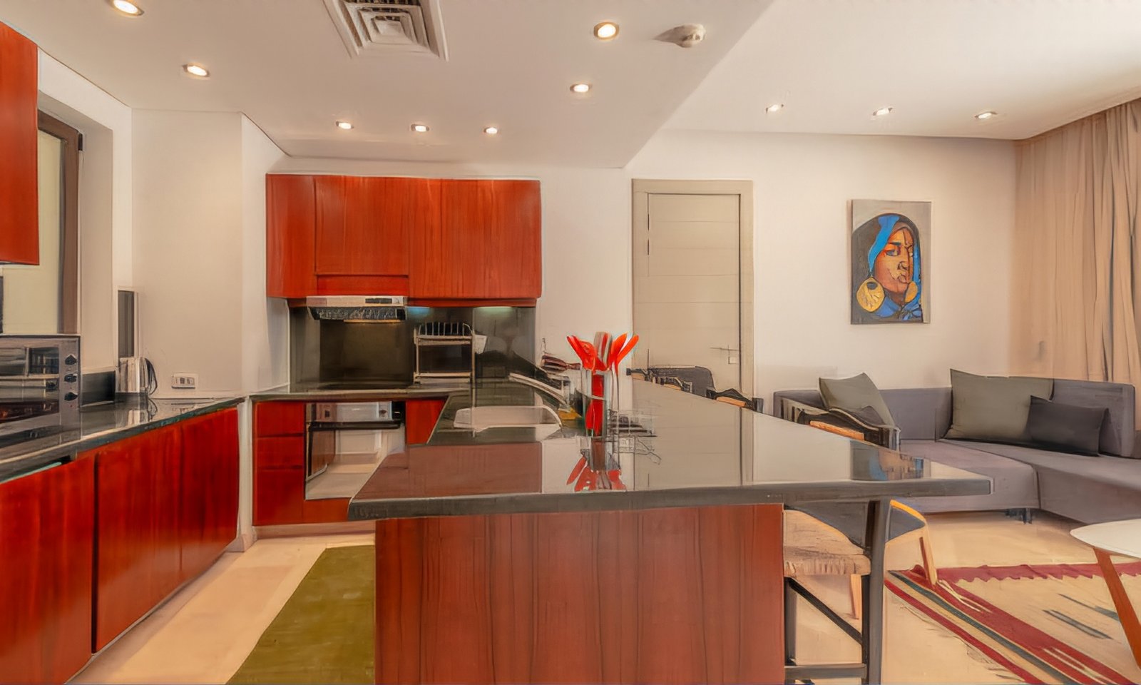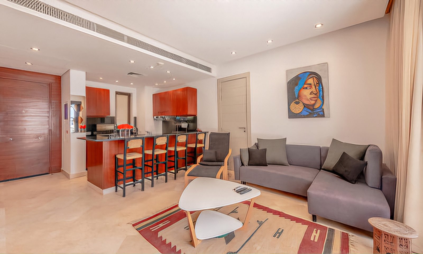 Classy, 1-Bedroom apartment in Ancient Sands, El Gouna. Unique space featuring double bed bedroom, a bathroom with shower (optional bath), living room with sofa-bed for 2, fully-equipped kitchen and spacious terrace with outdoor furniture set. Stylish and consistent interior design intrigues and encourages to stay in it. Though if you decide to explore the outdoors, the swimming pool is just a few meters away. Ancient Sands Golf Resort is perched on top of a 40-foot hill that looks over the shimmering lagoons with azure waters of the Red Sea as the backdrop.