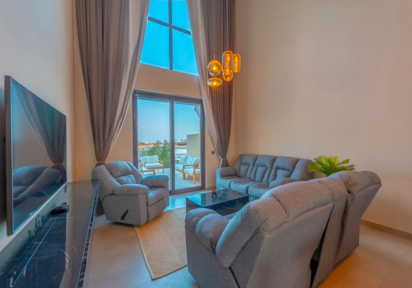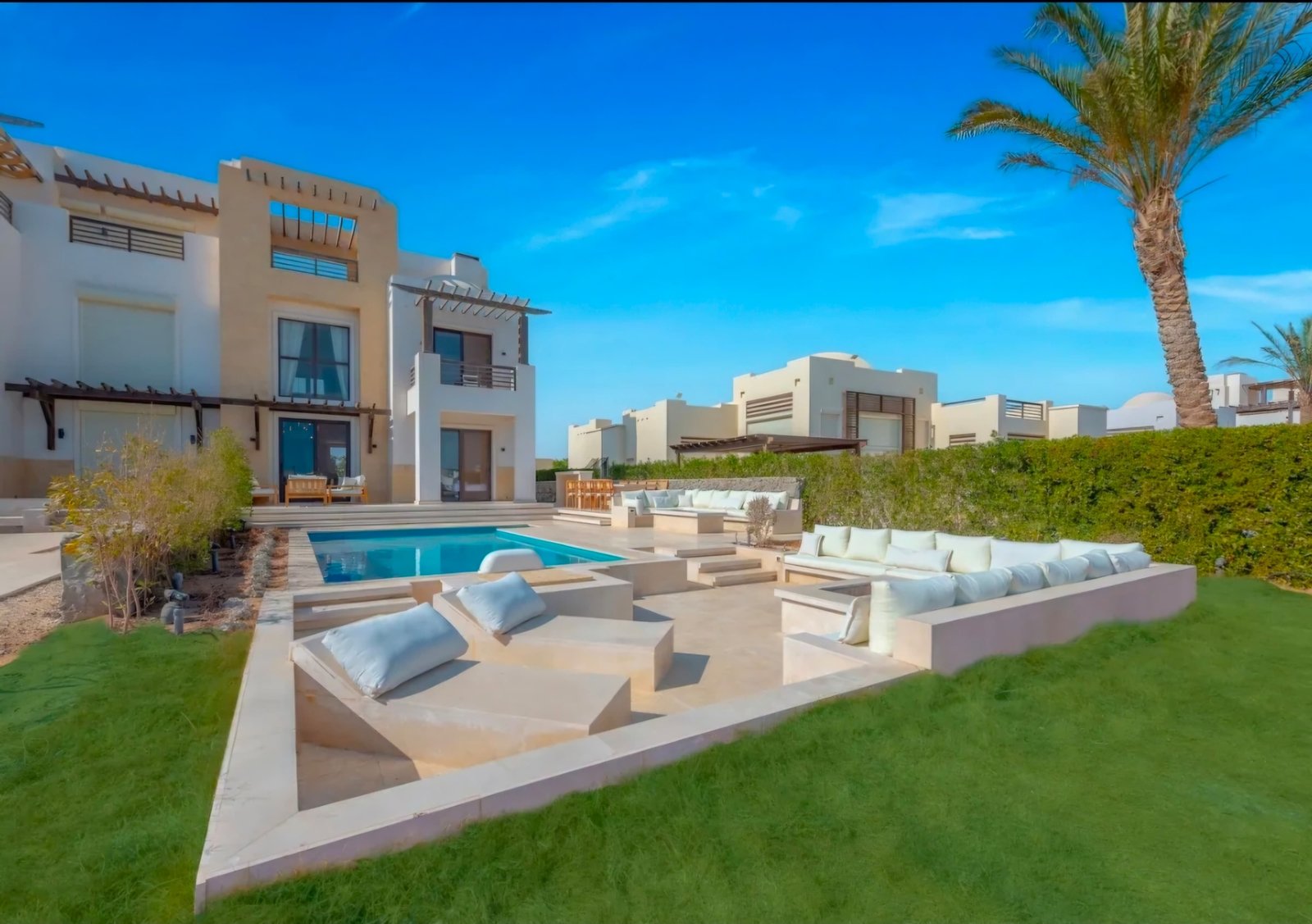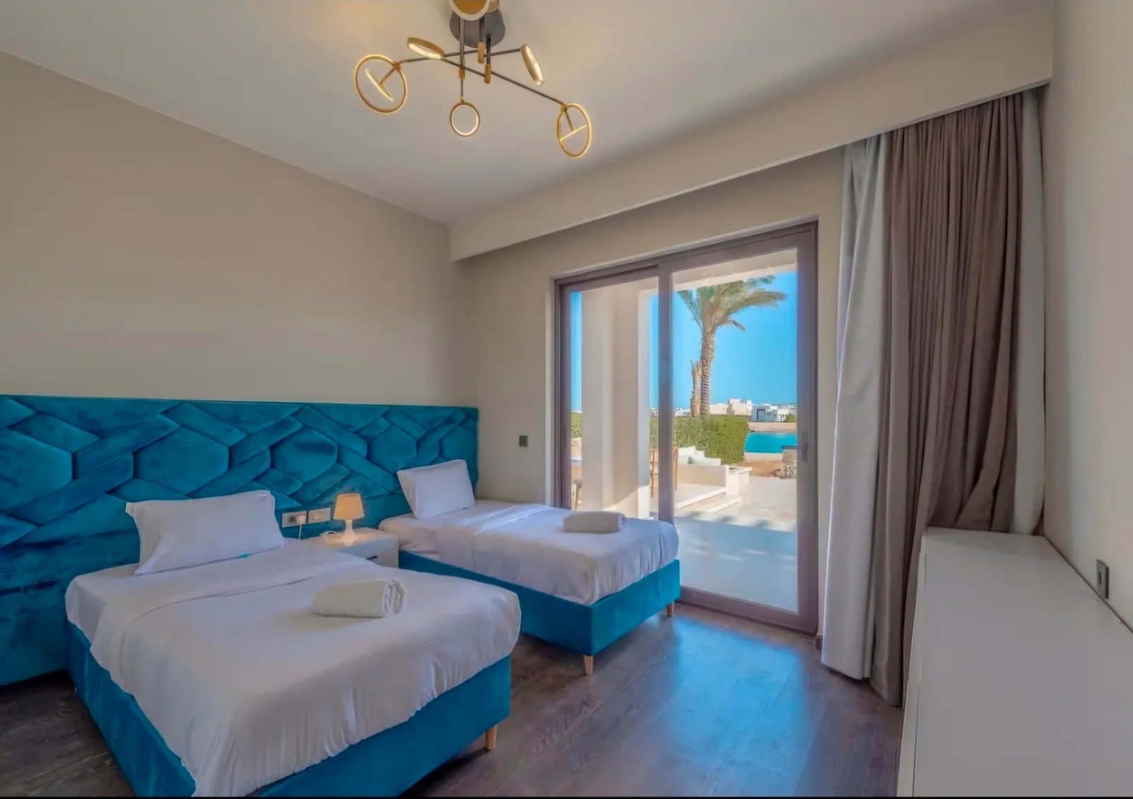 A comfortable and stylish 3-bedroom twin villa located in one of El Gouna’s newest developments: Ancient Sands Villas. This property offers serene lagoon views and a private patio with a swimming pool, ideal for a relaxing getaway. Prime Location: Ancient Sands Villas, El Gouna, Private Backyard, Private Heated Swimming Pool, Lagoon-front Balcony, Stunning Views, 3 bedroom, 3 Full Bathrooms with a shower, Guest toilet, Guest room with a bunk bad (suitable for 2), Washing Machine & Ironing Facilities, Air conditioning, Bright & elegant interior design, Fully fitted kitchen equipped with appliances like: oven, fridge & freezer, microwave, stove, kettle, Spacious, Open-plan Living Room, Dining Area, Smart TV, Free Wi-Fi, Swimmable lagoon access, Free parking on premises, Independent entrance 24h,