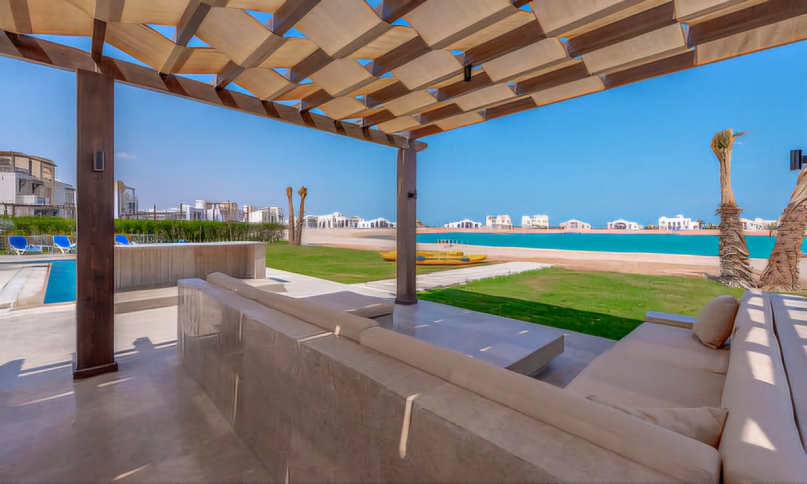 Escape to luxury and tranquility in this exquisite 4-bedroom villa nestled in Ancient Sands, El Gouna. Boasting a private heated* pool, direct lagoon access, and elegant interiors, this villa is the perfect retreat for families and friends seeking both relaxation and adventure. Step into a beautifully designed open-concept living area, where high ceilings and floor-to-ceiling windows flood the space with natural light, offering breathtaking lagoon views. The fully equipped kitchen makes home-cooked meals a breeze, while the spacious dining and lounge areas provide the ideal setting for gatherings. Each of the four stylish bedrooms is designed for comfort, with premium linens, en-suite bathrooms, and either terrace or balcony access to soak in the serene surroundings. Outdoors, the private heated pool invites you to unwind, while the large patio with outdoor seating and dining areas sets the scene for unforgettable evenings under the stars. For those looking to explore, this villa offers direct access to the lagoon and a quiet sandy beach. El Gouna’s vibrant marina, top-rated restaurants, and lively entertainment spots are just a short drive away. Property Highlights: ▶ Airy Living Room – Double-height ceilings, plush sofas, large TV, and floor-to-ceiling windows for natural light & stunning views. ▶ 4 Elegant Bedrooms – Three rooms with queen beds and one with twin beds, all with high-quality linens, en-suite bathrooms, and access to balconies or terraces with serene views. ▶ 4.5 Bathrooms – Modern, stylish, and equipped with walk-in showers and premium fixtures ▶ Fully Equipped Kitchen – Includes fridge, freezer, oven, microwave, stove, dishwasher, kettle, and all essentials for home-cooked meals. ▶ Outdoor Paradise – A private heated pool with lounge chairs, outdoor shower, a spacious patio with dining furniture, large table, meal prep zone with sink & tap, various seating options and a covered pergola seating area for relaxation ▶ Direct Lagoon & Lagoon Beach Access – Enjoy a sandy beachfront right from your backyard, perfect for swimming, sunbathing, or water sports. ▶ Additional Amenities – Washer, Free Wi-Fi, AC, mosquito nets, iron, Free parking. ▶ Prime location offering peace & privacy. Whether you’re looking for a peaceful escape or an adventure-filled getaway, this villa provides the ultimate El Gouna experience.