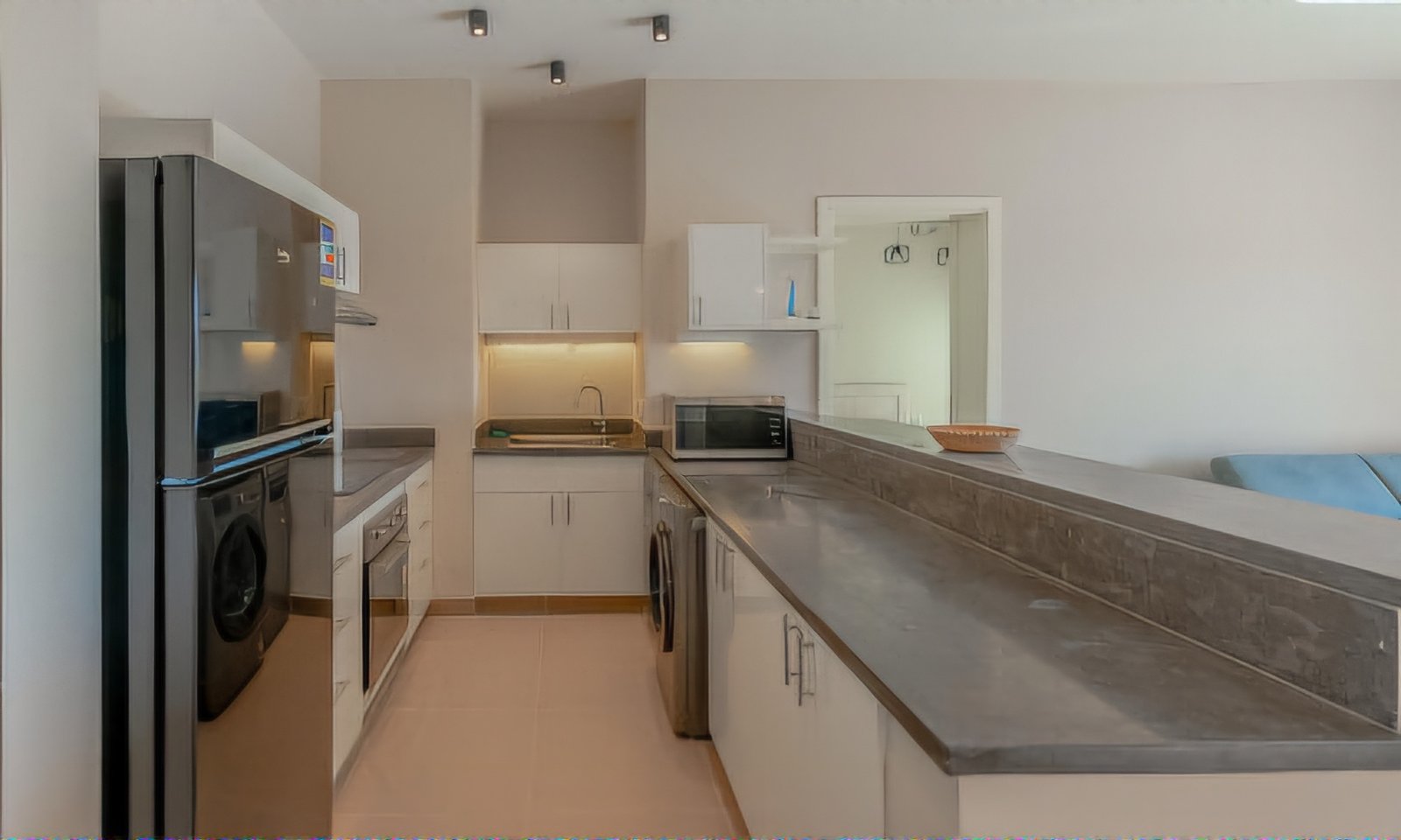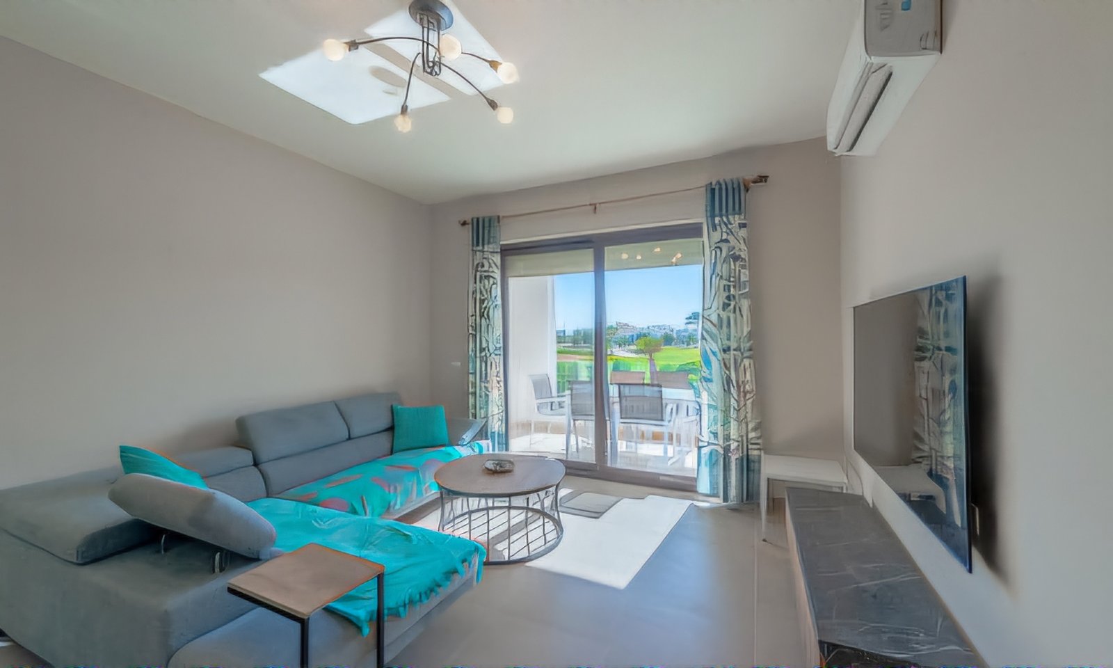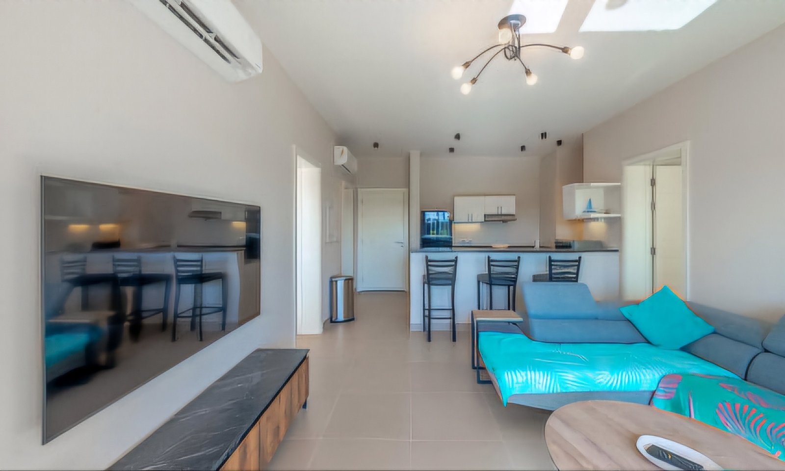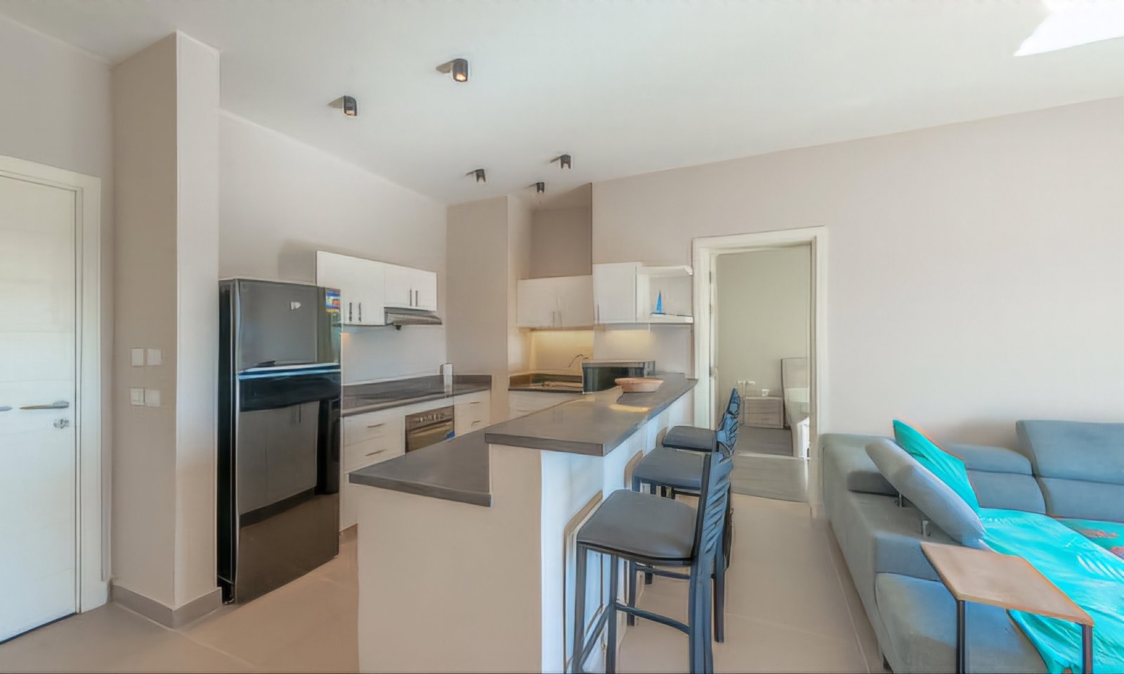 High-standard 2-Bedroom apartment in one of the latest Orascom Development projects in El Gouna – Cyan. A place where simplicity meets innovative solutions and beautiful finishings. Cyan is surrounded by the vibrant greens of 9-holes golf course, lakes and magnificent landscapes. The apartment is on the first floor and faces the golf course directly, you can admire views from the balcony. The outdoor dining area is enriched with a view-both on the golf course and the shared swimming pool. Indoor space features 2 master bedrooms, both ensuite, 1 double bed and 2 single beds in the other. Both bedrooms are equipped with AC and have their own access to the balcony. The living area is far away from any common overwhelming crowded interior, everything here is fresh, simple and ready to deliver top quality experiences. Open plan kitchen has an oven, a stove, microwave, fridge & freezer, kitchenware and washer. It’s enhanced by a bar with 3 high chairs. In the living room there is a big, flat screen smart TV situated in front of the comfortable L-shaped sofa. All property is Wi-Fi covered. Additionally, there is a guest toilet connected to the middle room for your convenience. Brand-new Cyan’s shared pool is for your use. Cyan is positioned minutes away from the Abu Tig Marina, home to El Gouna’s finest restaurants and bars. Downtown is just 2 minutes drive away. The Red Sea and closest kitesurfing centers are located less than 1.5km from the apartment.
