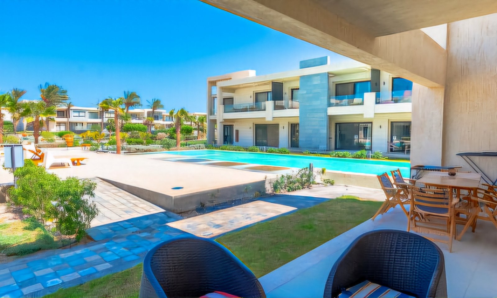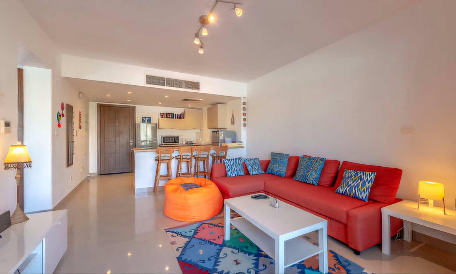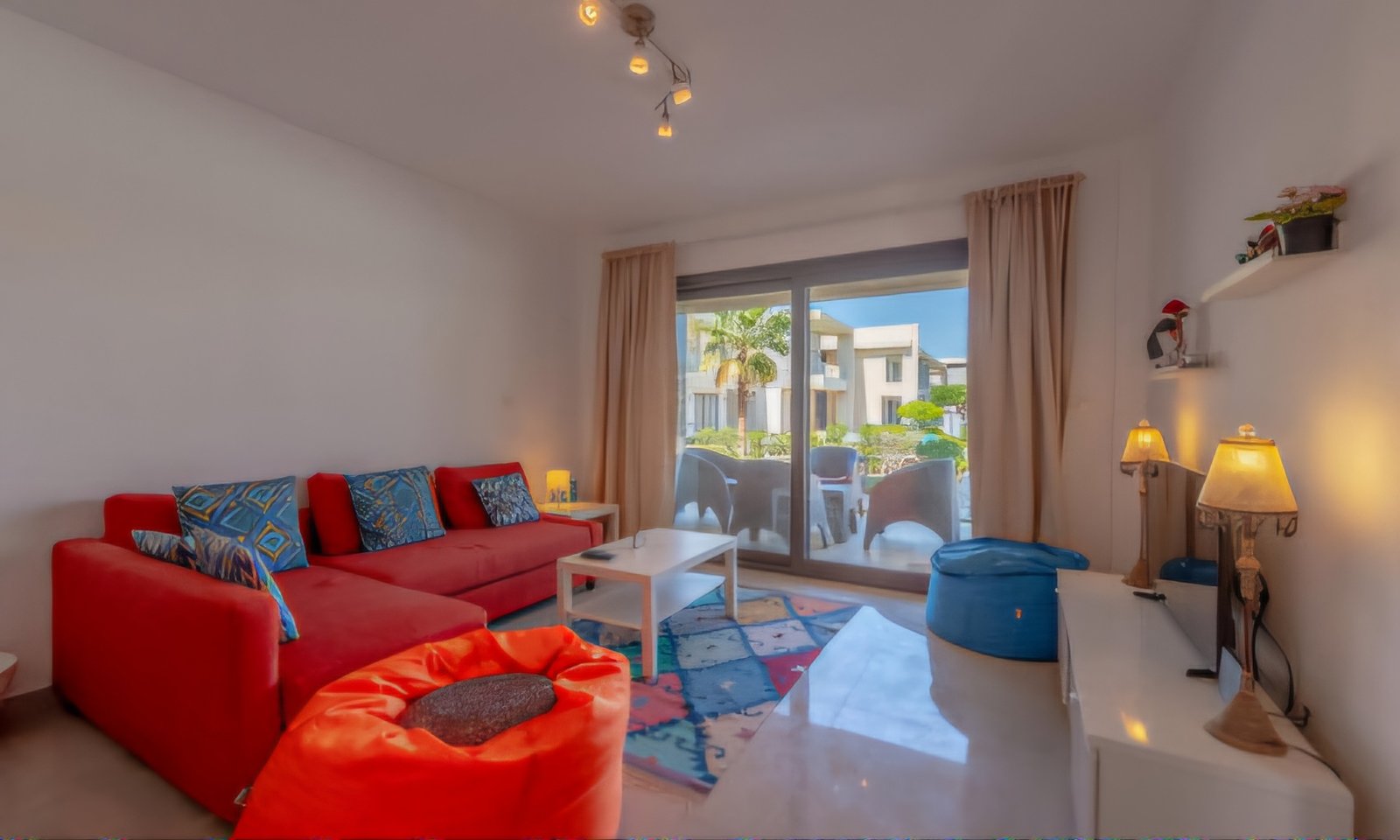 Homey atmosphere and over basic amenities. That 2-Bedroom apartment is perfect for family stays or friends gatherings. Located on the ground floor in one of the newest projects in El Gouna, G-Cribs. Shared pool, all for you to jump in is located just few meters away. You can enjoy self prepared meals in the comfortable outdoor dining area or by the bar equipped in high chairs. There is a double bed in the master bedroom and 1 single & bunk bed, to host 3 guests in the second bedroom. There is a shower in each out of 2 bathrooms. Kitchen is well equipped, you will find there an oven, a fridge, mini dishwasher, kettle, blender… The stove is installed in the bar/island, so the cooking can become a real spectacle. Enjoy a deep rest on the comfy sofa by the TV or pick one of the outdoor seating spaces. Located in the suburban area of El Gouna called Mansions. Right next to Sholan and Bali compounds.The place is is located approximately 4.5 km from Marina Abu Tig and Downtown – the center of Gouna. Please note that the road to Mansions is sandy – kindly check the location on the map before you confirm the booking. To move around the town without the car we recommend tuc tuc, taxi or a bicycle provided in the apartment.