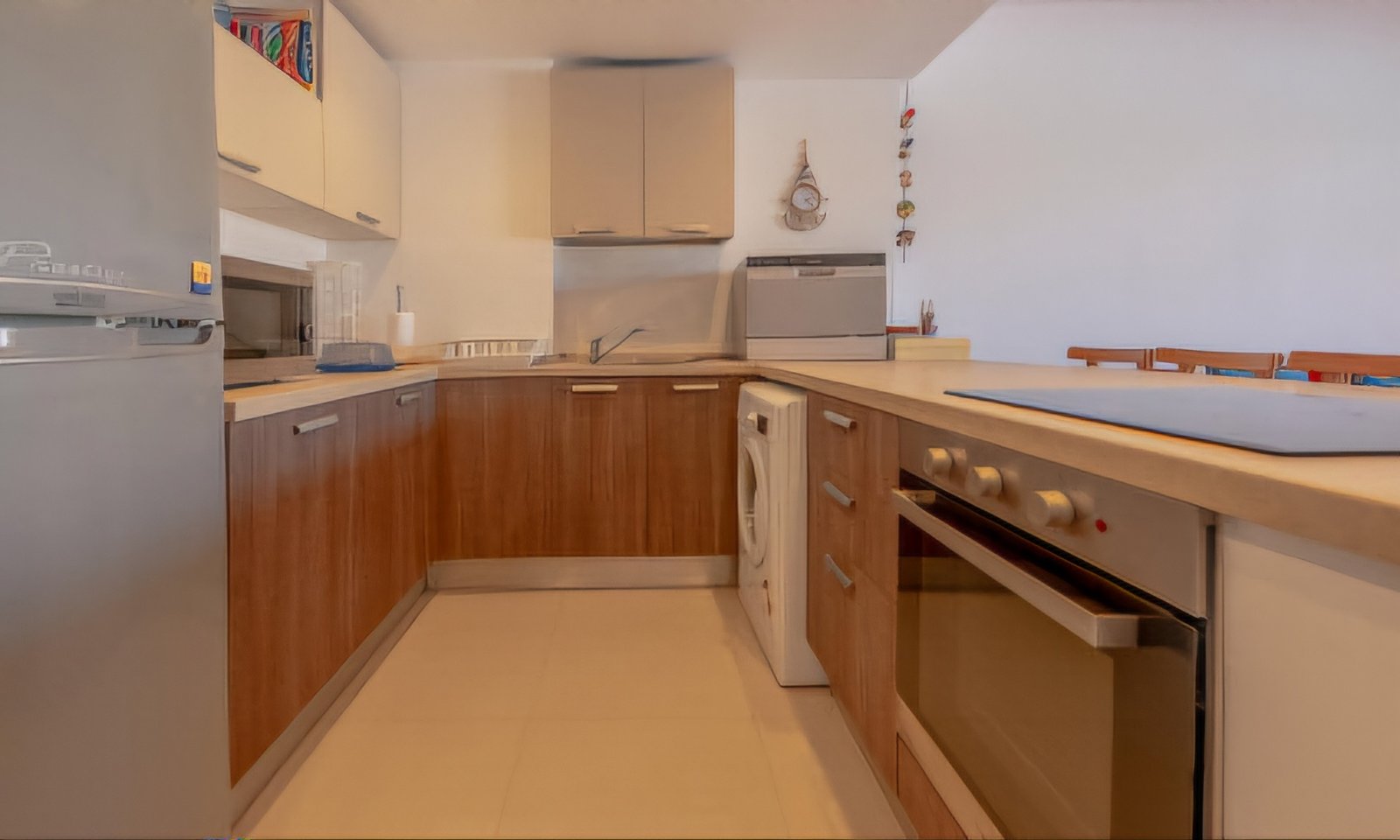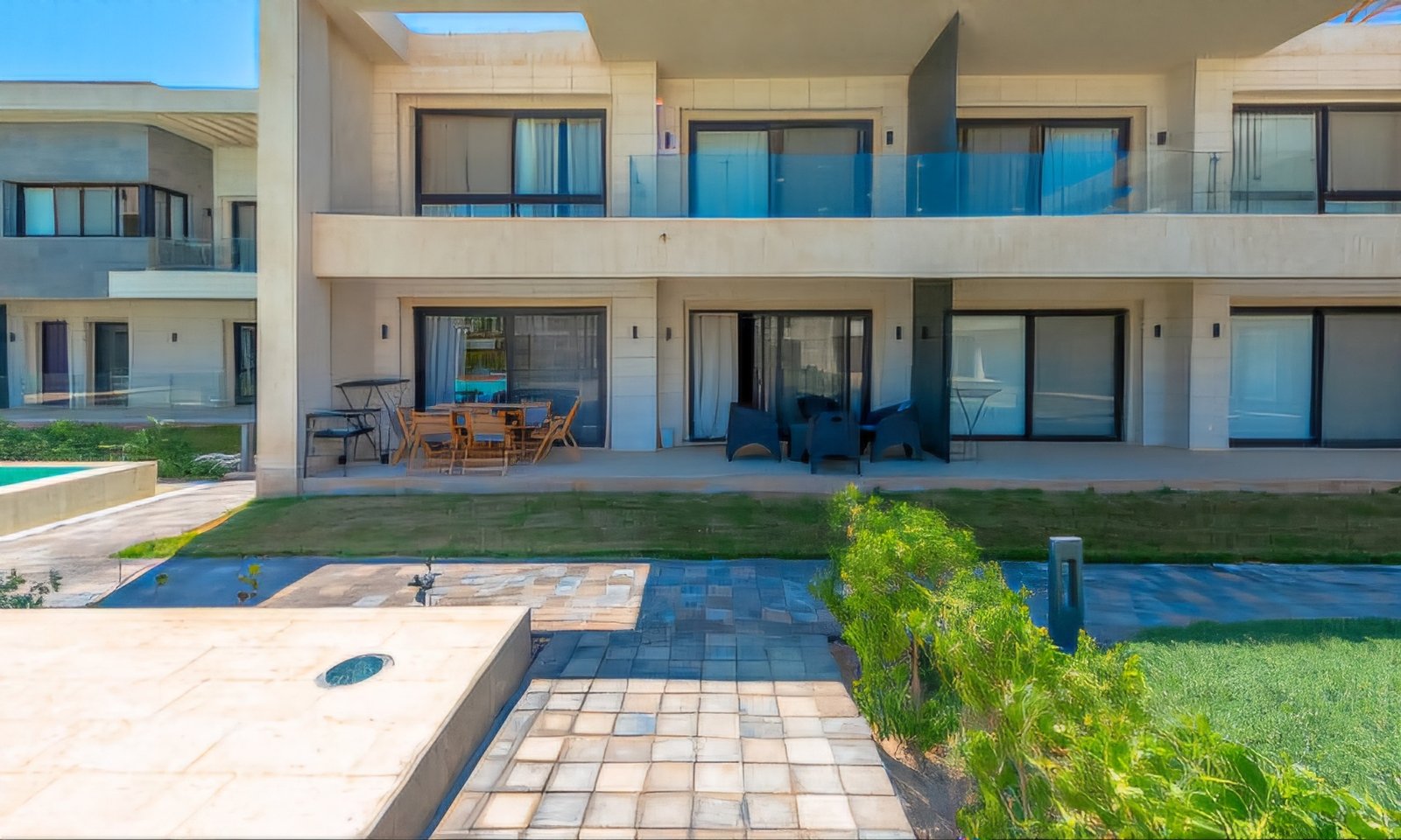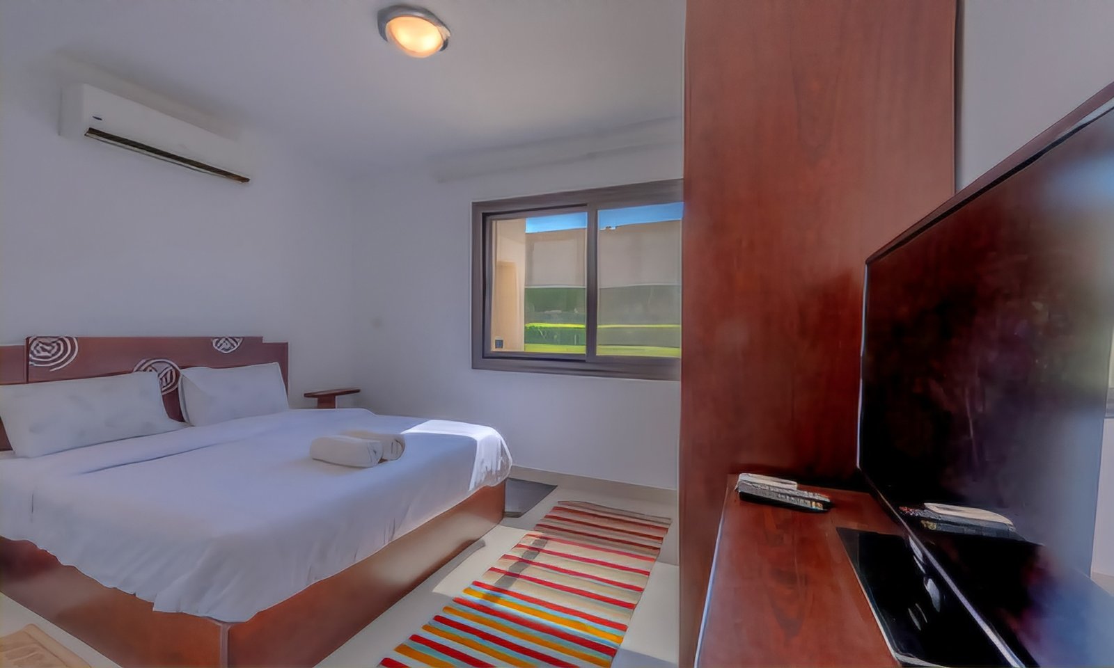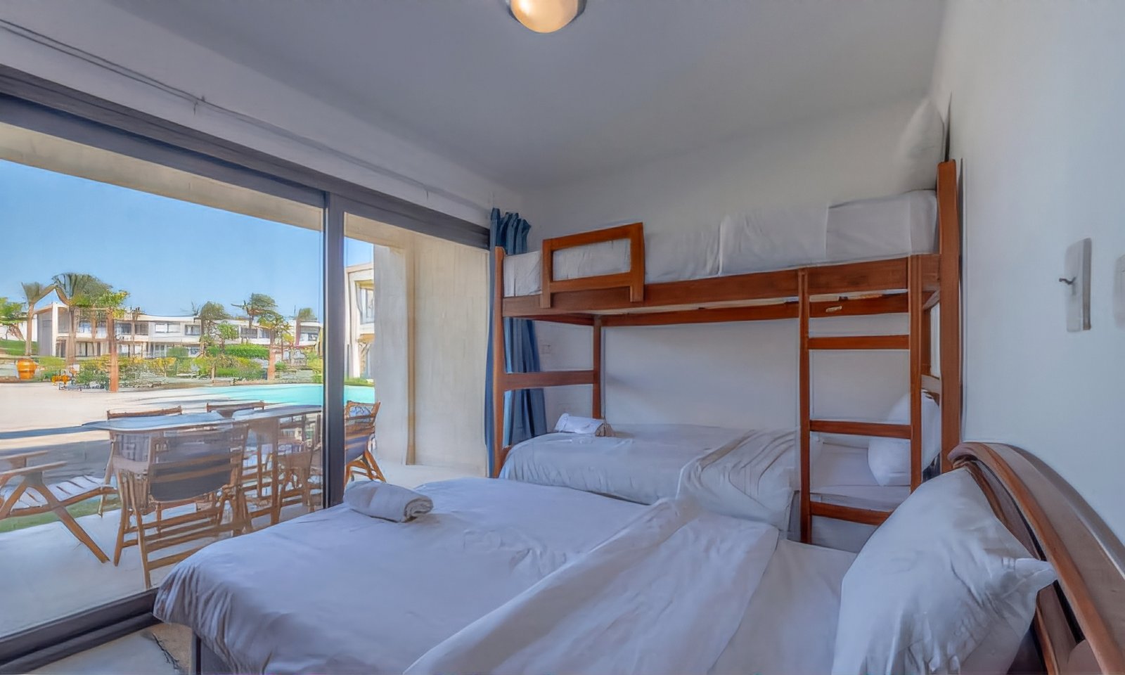 Homey atmosphere and over basic amenities. That 2-Bedroom apartment is perfect for family stays or friends gatherings. Located on the ground floor in one of the newest projects in El Gouna, G-Cribs. Shared pool, all for you to jump in is located just few meters away. You can enjoy self prepared meals in the comfortable outdoor dining area or by the bar equipped in high chairs. There is a double bed in the master bedroom and 1 single & bunk bed, to host 3 guests in the second bedroom. There is a shower in each out of 2 bathrooms. Kitchen is well equipped, you will find there an oven, a fridge, mini dishwasher, kettle, blender… The stove is installed in the bar/island, so the cooking can become a real spectacle. Enjoy a deep rest on the comfy sofa by the TV or pick one of the outdoor seating spaces. Located in the suburban area of El Gouna called Mansions. Right next to Sholan and Bali compounds.The place is is located approximately 4.5 km from Marina Abu Tig and Downtown – the center of Gouna. Please note that the road to Mansions is sandy – kindly check the location on the map before you confirm the booking. To move around the town without the car we recommend tuc tuc, taxi or a bicycle provided in the apartment.