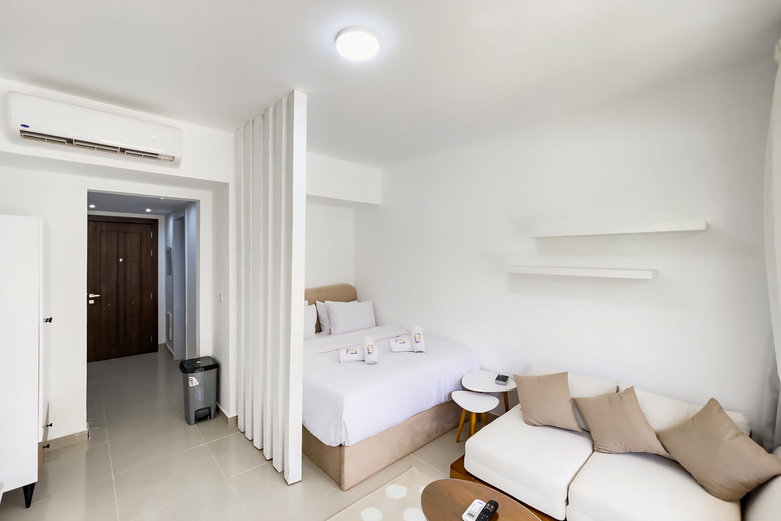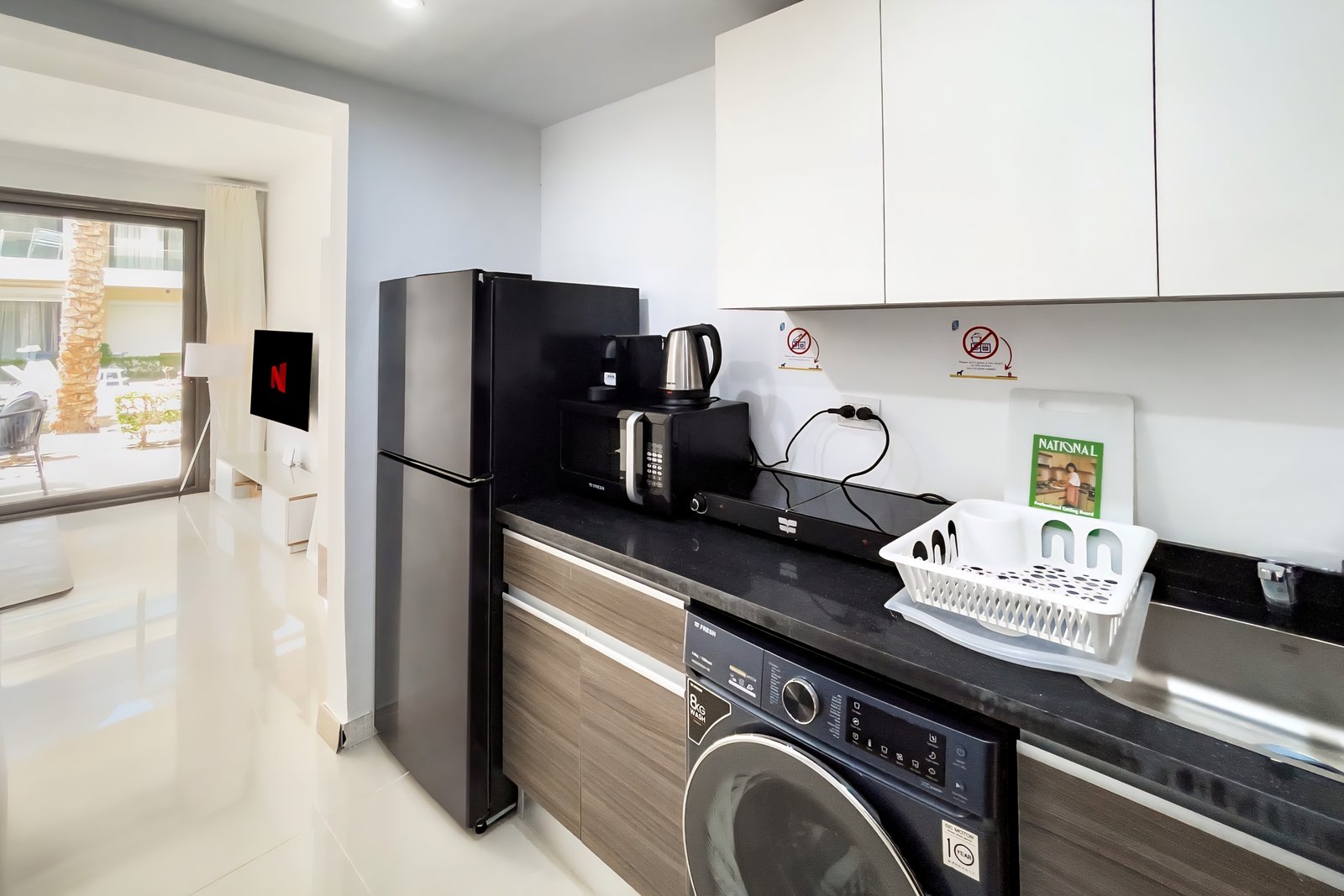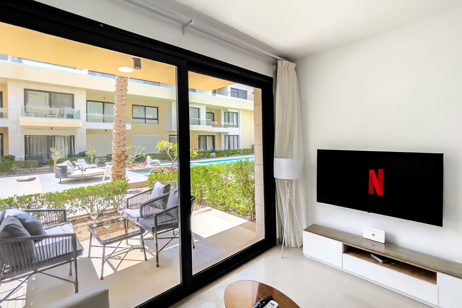 This cozy 1 bedroom studio is located in G-cribs with free pool access. The 1 bedroom studio comes with an open plan fully equipped kitchen, 1 full bathroom. It also features a 55 inch smart TV with Airplay and cable channels, a Nespresso machine, kettle and a microwave. The styling is made with a modish and calming taste to ensure guests have a wonderful and relaxing experience. Neighborhood: G Cribs is the comfort zone for those who want to discover more. Each unit receives full access to all facilities and services G Cribs provides. Transit: Free outdoor parking is available. Tuktuks are available to take you anywhere in El Gouna.