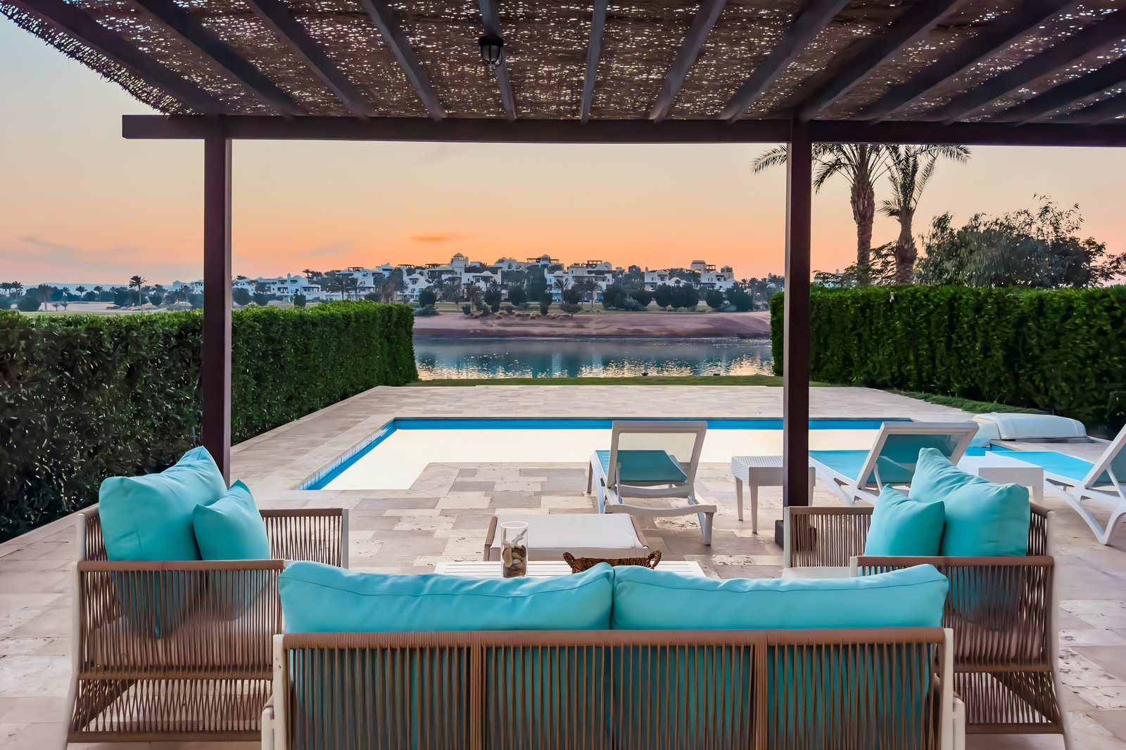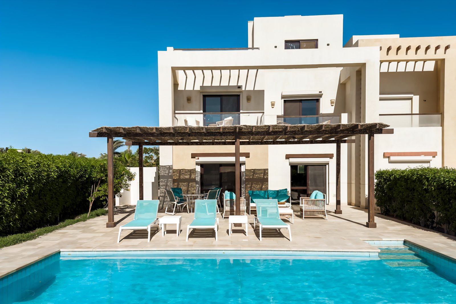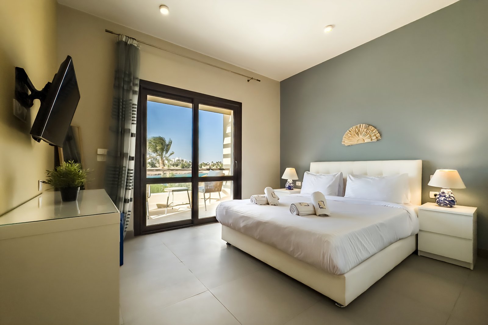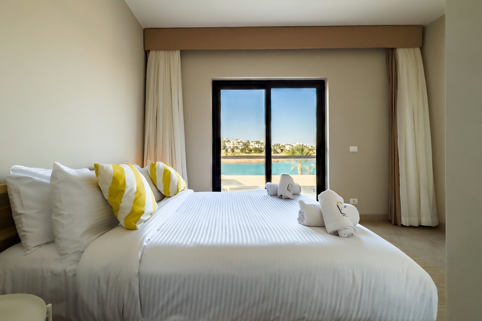This lagoon front 4 bedroom villa is located in Gouna’s beloved Joubal community and features a private pool along with a guest / maid’s bedroom. The ground level features an open plan fully equipped kitchen, maid’s room, dining area and a living room. It also features a 65 inch smart TV with Airplay and cable channels, washing machine, a Nespresso machine, kettle and a microwave. The first level features 4 separate beautifully decorated bedrooms with king size beds. Additionally there are a total of 4 full bathrooms. The styling of the villa is tailored to give the guests a relaxing and a unique vibe. Neighborhood: -Joubal is a center point from Abu Tig Marina. – Joubal Lagoon located 35 minutes away from Hurghada international airport. Transit: Free outdoor parking is available. Tuktuks are available to take you anywhere in El Gouna