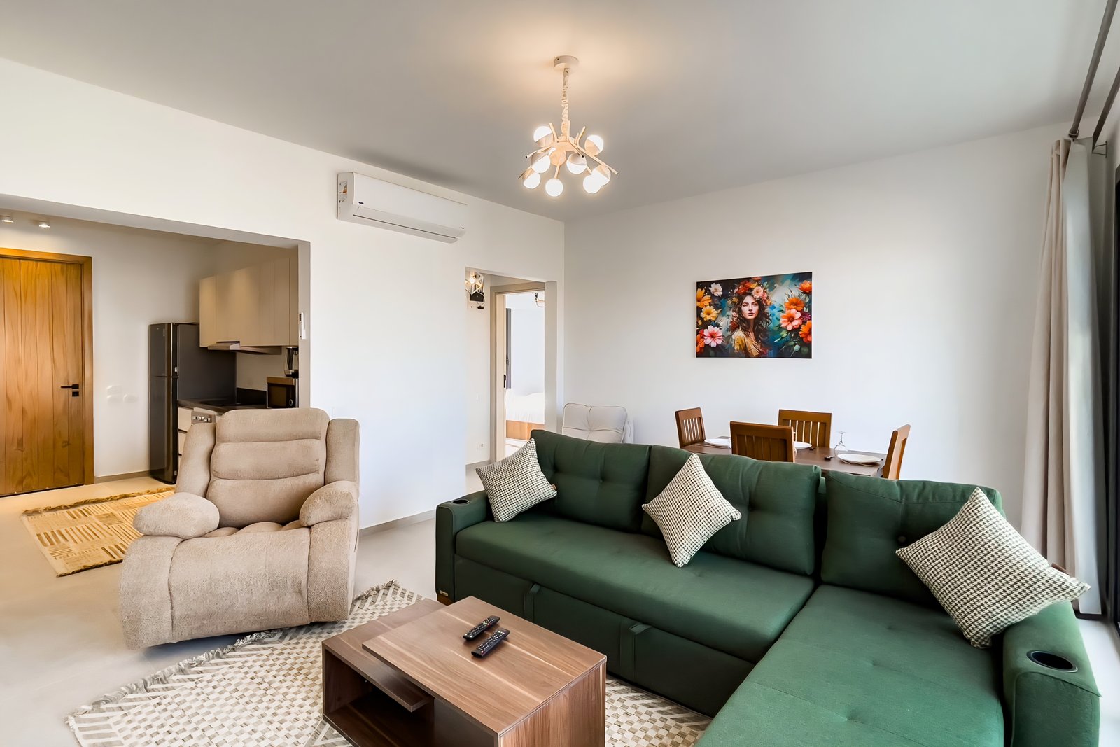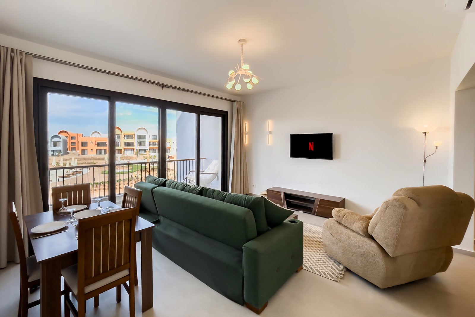 This 1 bedroom apartment is located in Gouna’s Kamaran community. It features a spacious living room overlooking a Pool, a walk in fully equipped kitchen and 1 bedroom and sofa bed that can sleep 3 guests comfortably. It also features a 55 inch smart TV with Airplay and cable channels, washing machine, a Nespresso machine, kettle and a microwave. Neighborhood: Kamaran is a lively family neighborhood that presents multiple lifestyle amenities to explore and enjoy. Transit: Free outdoor parking is available. Tuktuks are available to take you anywhere in El Gouna