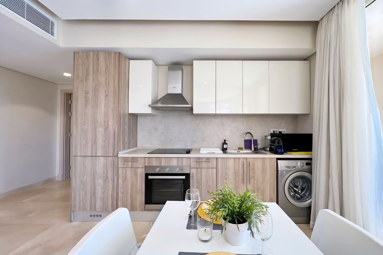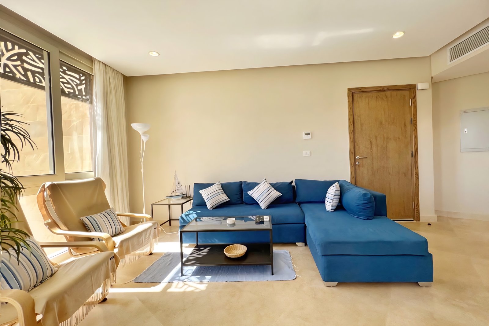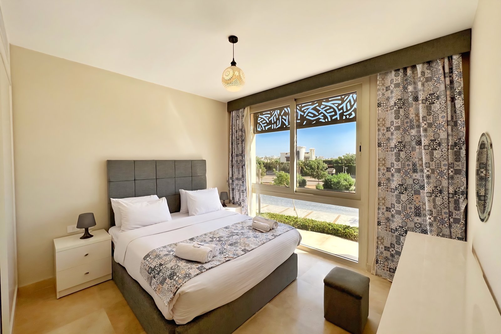 This beautiful 1 bedroom apartment is located in Gouna’s only beachfront residence – Mangroovy with a free pool and beach access. Mangroovy is closest to the Marina (10 min walk). The apartment features a sunny balcony. It also comes with an open plan fully equipped kitchen, a full bathroom and a living room. It also features a 50 inch smart TV with Airplay and cable channels, washing machine, a Nespresso machine, kettle, microwave and a fully functional stove and oven. The apartment is great for couples. The styling of the apartment is meant to be simple, fresh and bright to ensure guests have a calming experience. Neighborhood: -Mangroovy residence is uniquely located 800 meters from Marina El Gouna. Guests will be able to walk 10 minutes and get to it. -‘Bright Star’ supermarket is right in front of the residence towards the Marina. -Mangroovy is home to the famous ‘Noi’ beach lounge (located at Mangroovy’s beach) – ‘The Smokery’, a local favorite is also located 450 meters from the residence.