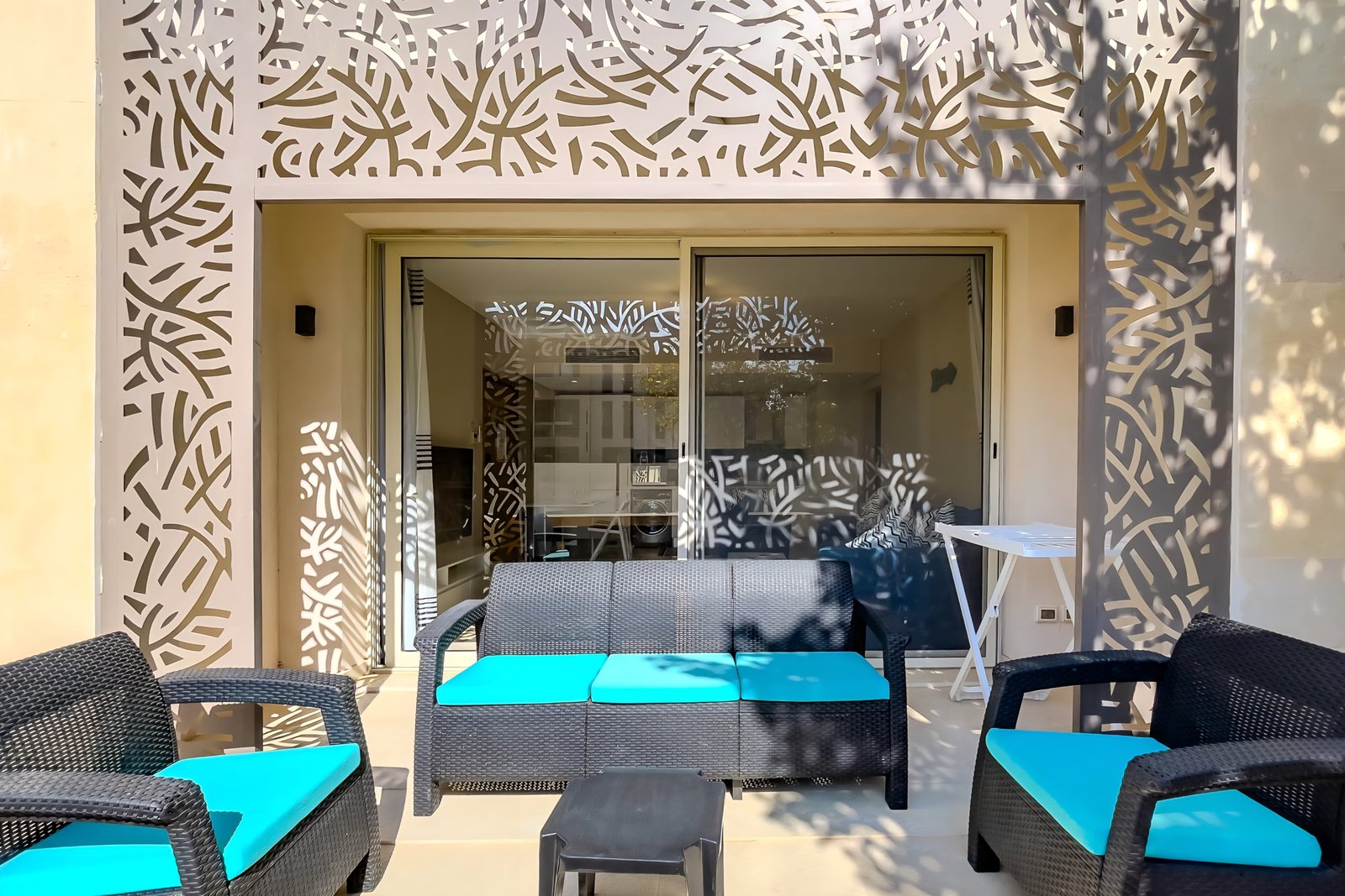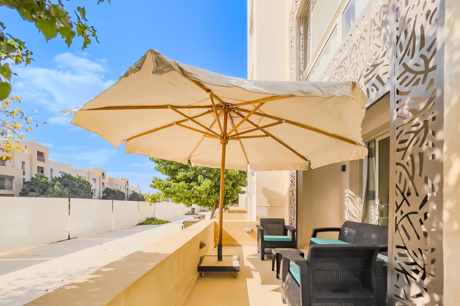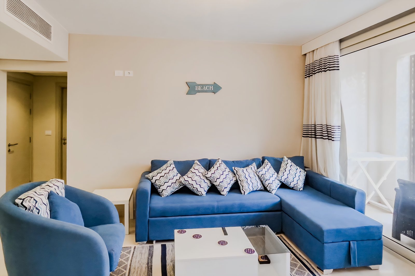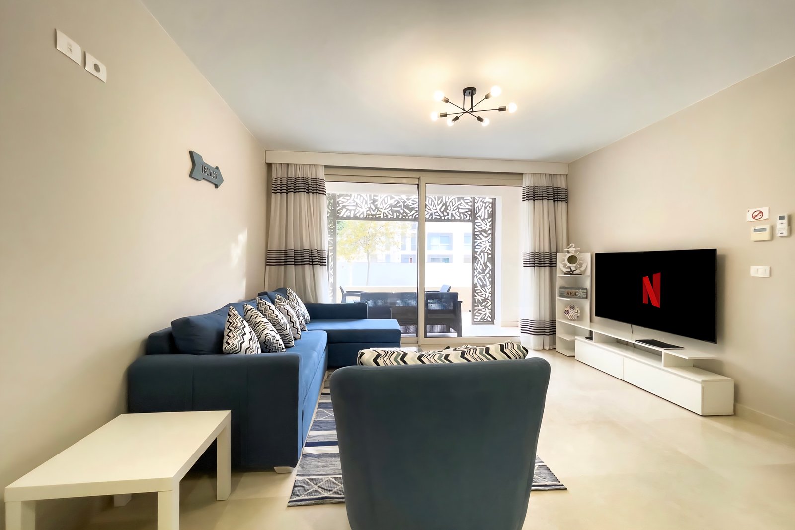 This warm and welcoming 1 bedroom apartment is located in Gouna’s only beachfront residence – Mangroovy with free pool and beach access. Mangroovy is closest to the Marina (10 min walk). The apartment is on the ground floor and features an open plan fully equipped kitchen, bathrooms (one ensuite) and a living room. There is a bright a cosy outdoor furnished terrace, perfect for your morning coffee or late night relaxation. It also features a 55 inch smart TV with Airplay and cable channels, washing machine, a Nespresso machine, kettle and a microwave. The apartment is great for couples & small families. The styling of the apartment is tailored to give the guests a jazzy and happy vibe. Neighborhood: -Mangroovy residence is uniquely located 800 meters from Marina El Gouna. Guests will be able to walk 10 minutes and get to it. -‘Bright Star’ supermarket is right in front of the residence towards the Marina. -Mangroovy is home to the famous ‘Zounii’ beach lounge (located at Mangroovy’s beach) – ‘The Smokery’, a local favorite is also located 450 meters from the residence.