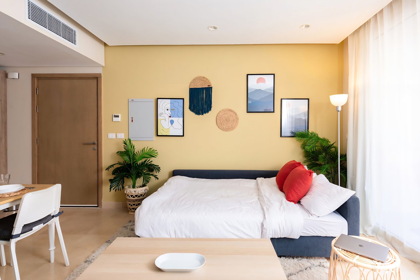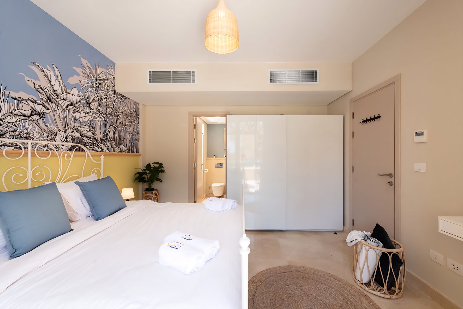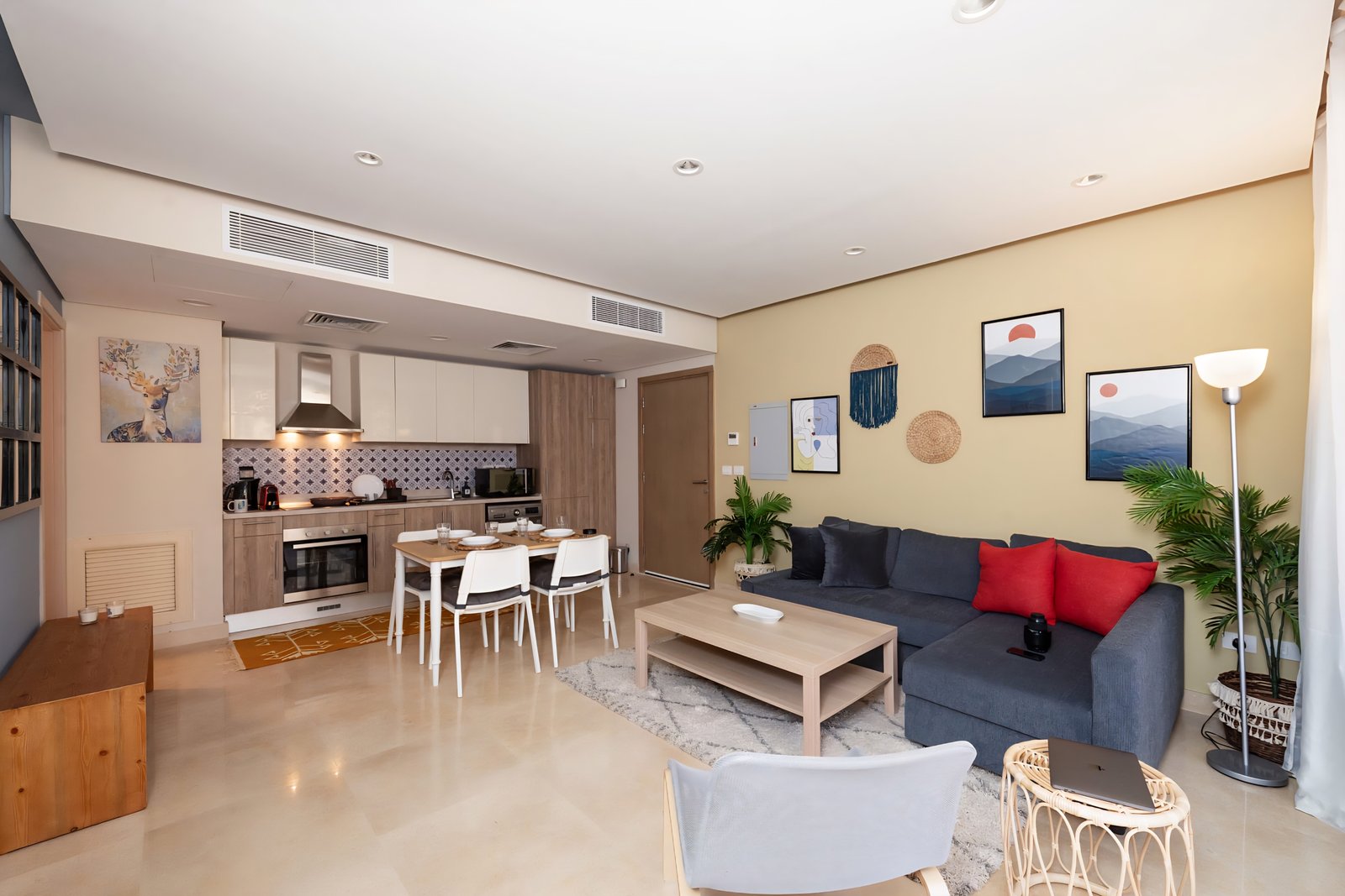 This exotic and colorful 1 bedroom apartment is located in Gouna’s only beachfront residence – Mangroovy with a 24/7 free pool and beach access. Mangroovy is closest to the Marina (10 min walk). The apartment is on the ground floor and features an open plan fully equipped kitchen, 2 bathrooms (one ensuite) and a living room. There is a bright a cosy outdoor furnished terrace, perfect for your morning coffee or late night relaxation. It also features a 55 inch smart TV with Airplay and cable channels, washing machine, a Nespresso machine, kettle and a microwave. The apartment is great for couples & small families. The styling of the apartment is tailored to give the guests an exotic and happy vibe. Neighborhood: -Mangroovy residence is uniquely located 800 meters from Marina El Gouna. Guests will be able to walk 10 minutes and get to it. -‘Bright Star’ supermarket is right in front of the residence towards the Marina. -Mangroovy is home to the famous ‘Noi’ beach lounge (located at Mangroovy’s beach) – ‘The Smokery’, a local favorite is also located 450 meters from the residence.