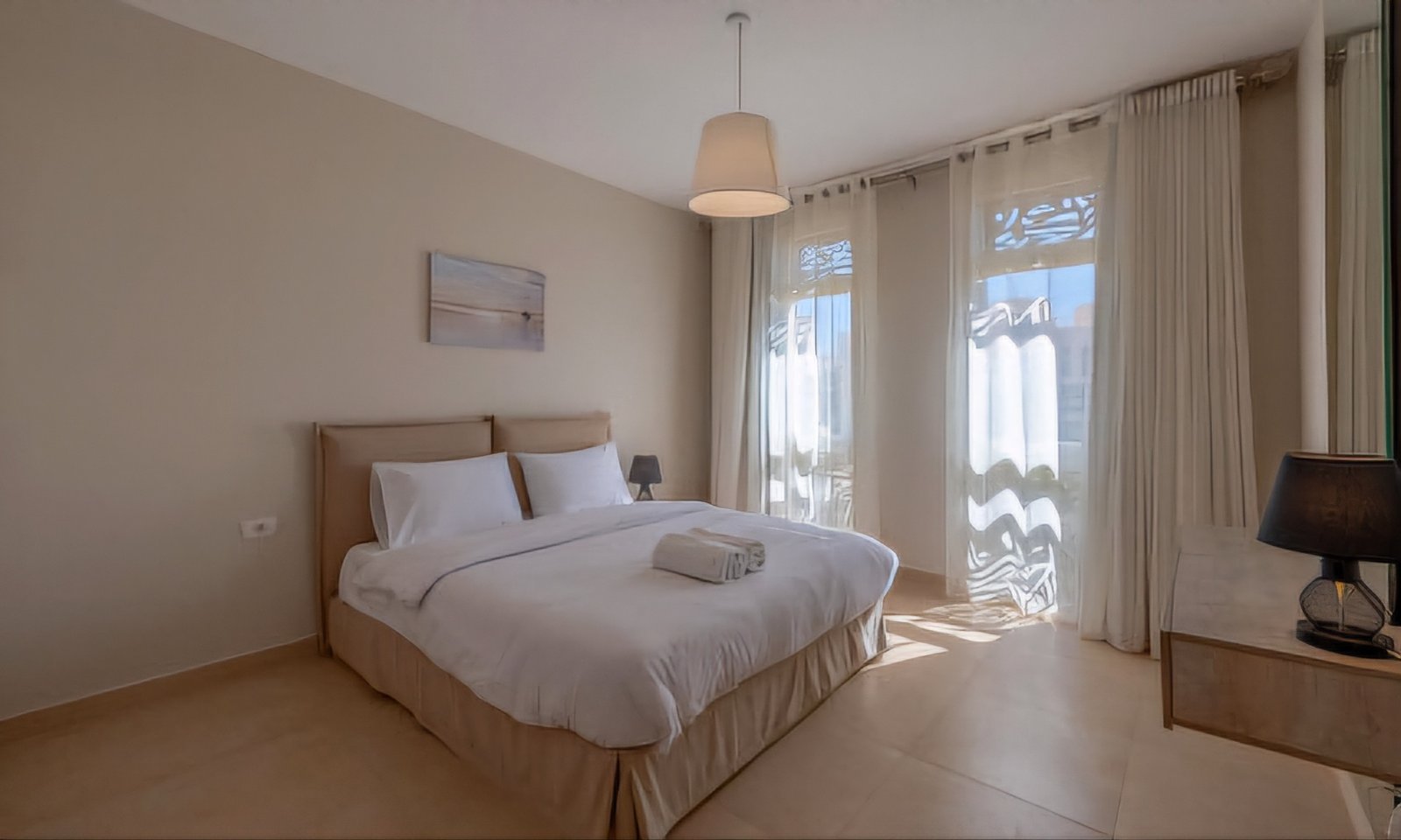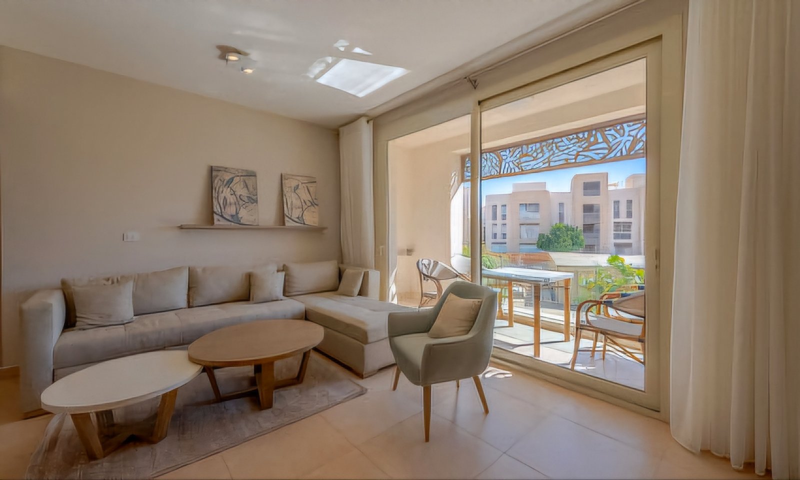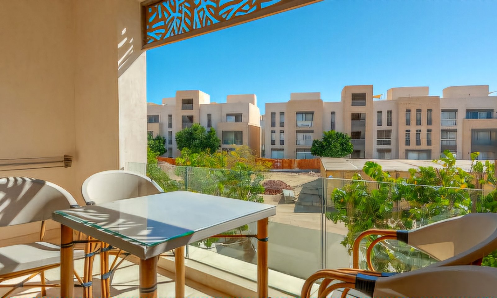 Indulge in a chic and comfortable stay at our centrally-located 1-bedroom apartment in Mangroovy Residence, El Gouna. (Back View) > Balcony >Outdoor furniture > Simple &functional > Cozy master bedroom (Queen-size bed, AC, TV) + Full bathroom with a shower > Guest toilet > Open-concept living room > Kitchen > Dining table > Flat-screen TV > Washing machine > Mangroovy Beach access > Swimming pool access > Free parking Situated in one of the most prominent residential beachfront projects in Gouna, Mangroovy Residence – El Gouna