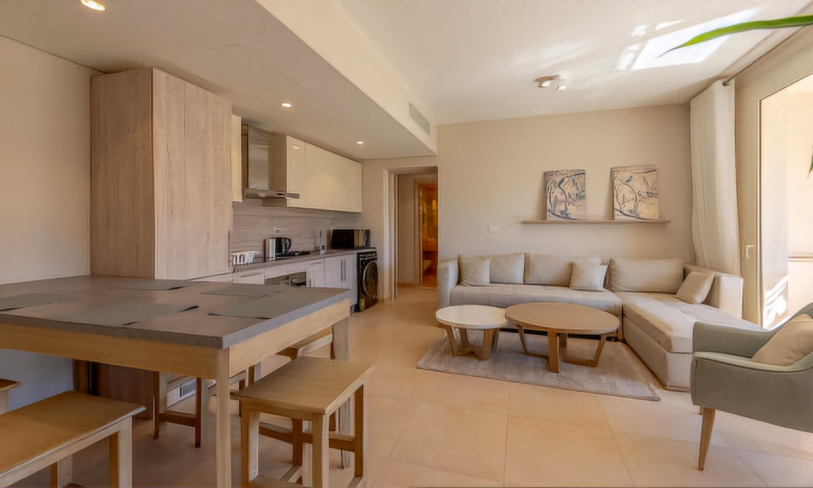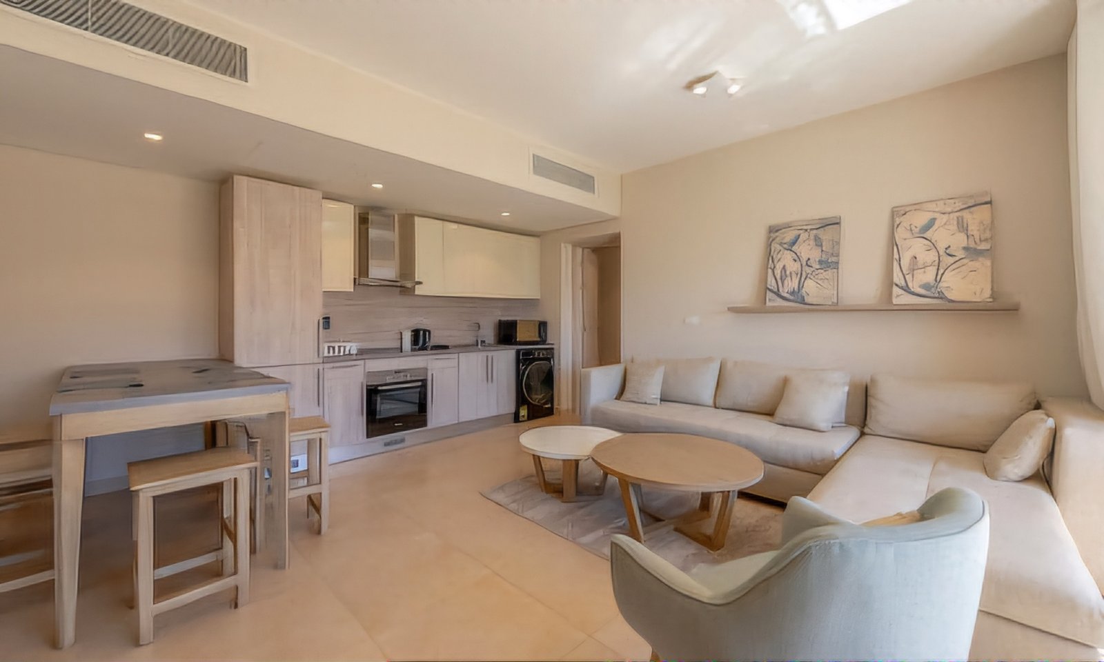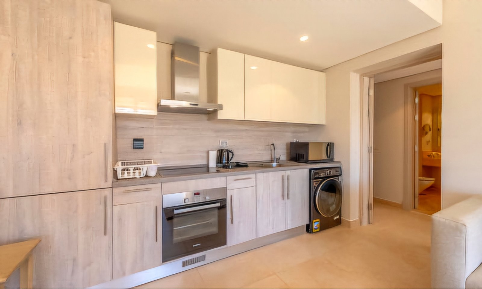 Indulge in a chic and comfortable stay at our centrally-located 1-bedroom apartment in Mangroovy Residence, El Gouna. (Back View) > Balcony >Outdoor furniture > Simple &functional > Cozy master bedroom (Queen-size bed, AC, TV) + Full bathroom with a shower > Guest toilet > Open-concept living room > Kitchen > Dining table > Flat-screen TV > Washing machine > Mangroovy Beach access > Swimming pool access > Free parking Situated in one of the most prominent residential beachfront projects in Gouna, Mangroovy Residence – El Gouna