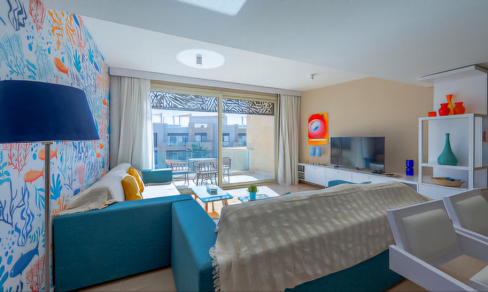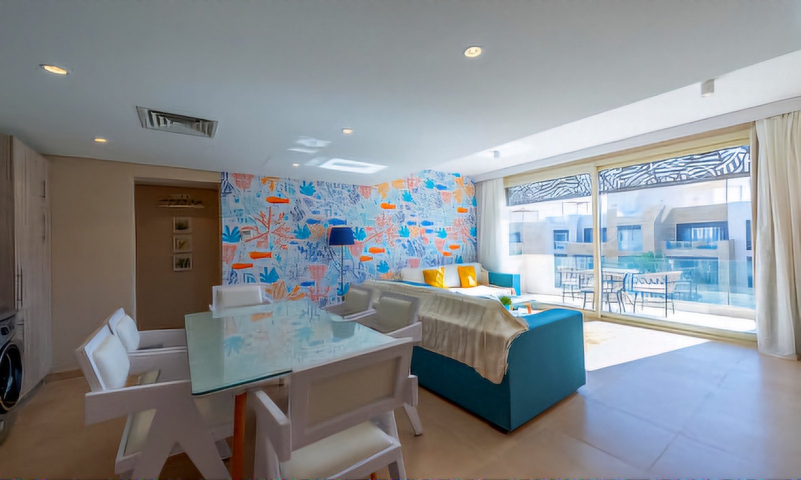 Beach-Inspired, warm 1-Bedroom apartment situated on the 2nd floor with pool & sea view. That delicious space consists of an open-plan living room + kitchen, master bedroom with a bathroom & a guest toilet. There is also an amazing, private furnished balcony. Turquoise and orange color palette energizes and brings sunset at the seaside vibes. Perfect for a couple or solo travellers. -2nd Floor -Sea & Pool View Balcony -Outdoor furniture -Beach-Inspired decor -Open-concept living room -Well-equipped kitchen -Dining table -Cozy master bedroom (Queen-size bed, AC, wardrobes) +Full bathroom with a shower -Guest toilet -Flat-screen TV -Free Wi-Fi -Washing machine -Ironing facilities -Mangroovy Beach access -Swimming pool access -Free parking The apartment is strategically located in Mangroovy Residence project: The Red Sea – only around 100m away Closest kitesurfing centers – Red Sea Zone and KBC – approximately 200m Closest grocery shop – “Bright Start” Supermarket – approximately 250m away Recently built, overbasically equipped “Bestway” Supermarket – approximately 500m away Marina – less than 1km El Gouna’s Downtown – up to 7 minutes drive or with a tuc-tuc.