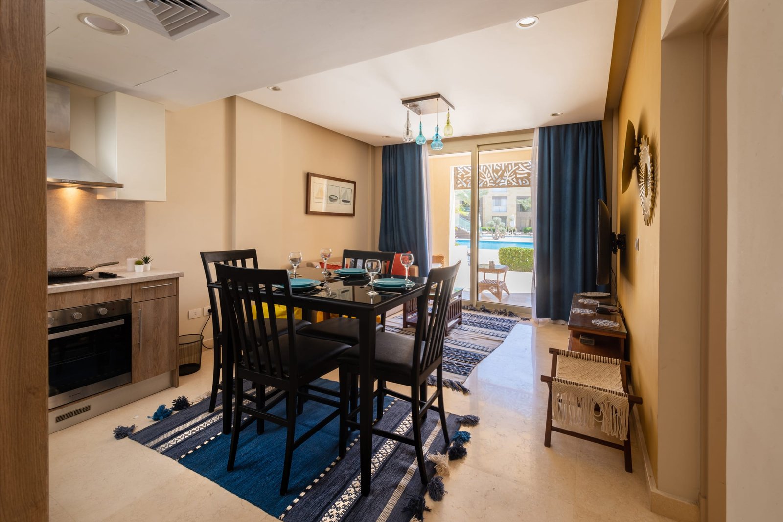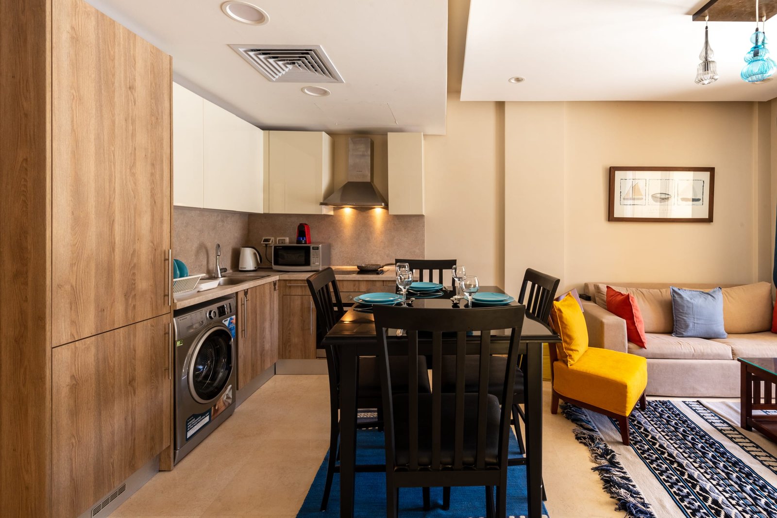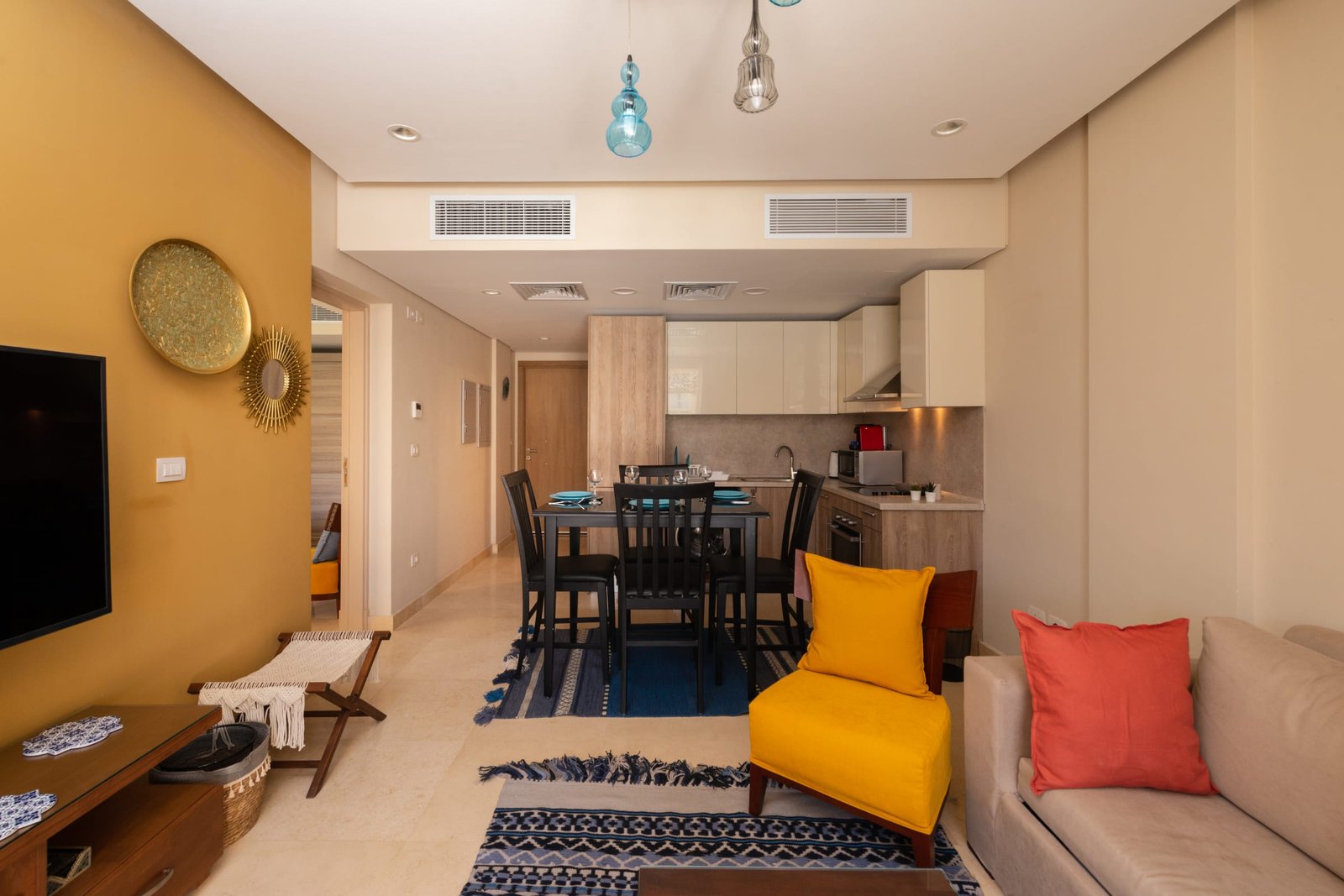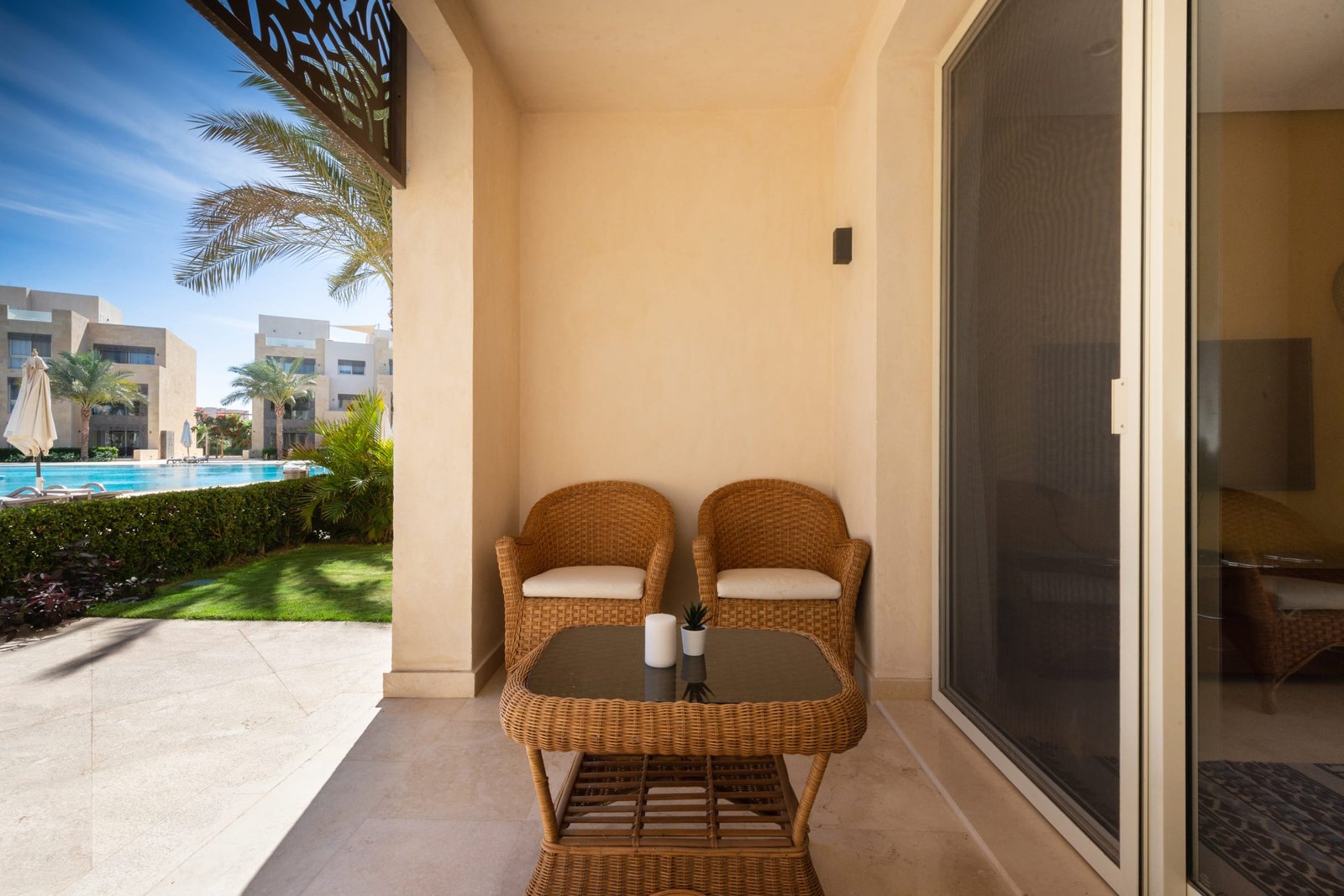 This warm and welcoming 1 bedroom apartment is located in Gouna’s only beachfront residence – Mangroovy with free pool and beach access. Mangroovy is closest to the Marina (10 min walk). The apartment is on the ground floor and features an open plan fully equipped kitchen, 2 bathrooms (one ensuite) and a living room. There is a bright a cosy outdoor furnished terrace, perfect for your morning coffee or late night relaxation. It also features a 55 inch smart TV with Airplay and cable channels, washing machine, a Nespresso machine, kettle and a microwave. The apartment is great for couples & small families. The styling of the apartment is tailored to give the guests a jazzy and happy vibe. Neighborhood: -Mangroovy residence is uniquely located 800 meters from Marina El Gouna. Guests will be able to walk 10 minutes and get to it. -‘Bright Star’ supermarket is right in front of the residence towards the Marina. -Mangroovy is home to the famous ‘Zounii’ beach lounge (located at Mangroovy’s beach) – ‘The Smokery’, a local favorite is also located 450 meters from the residence. Transit: Free outdoor parking is available. Tuktuks are available to take you anywhere in El Gouna