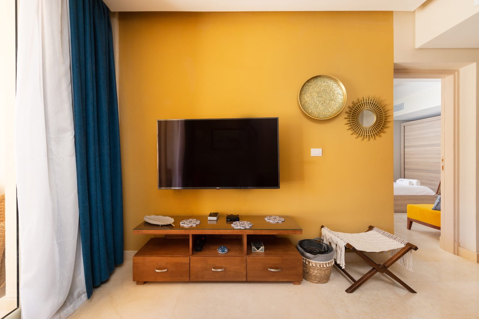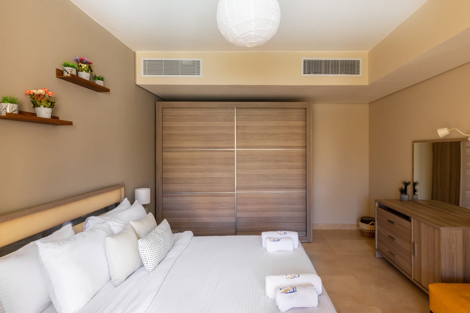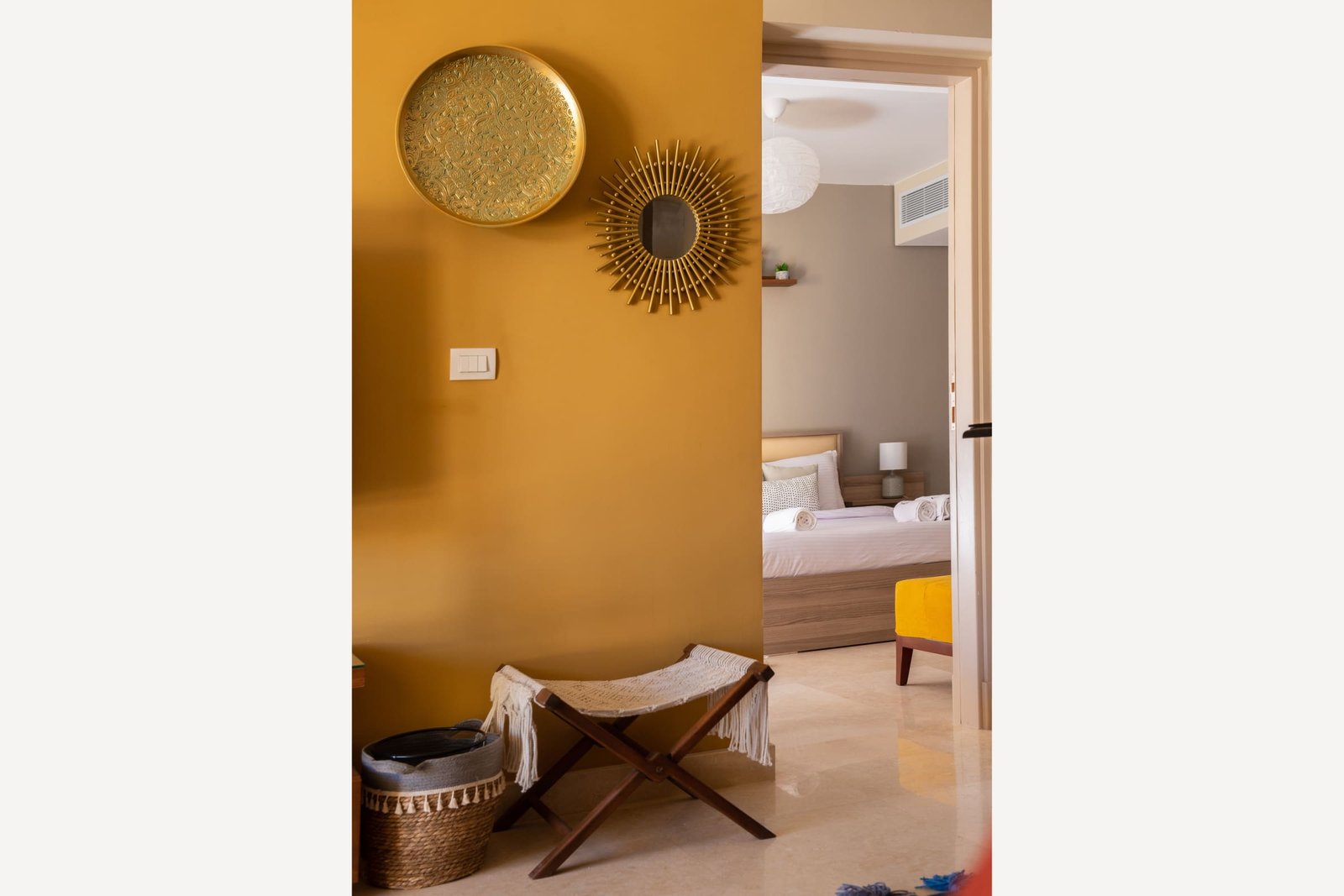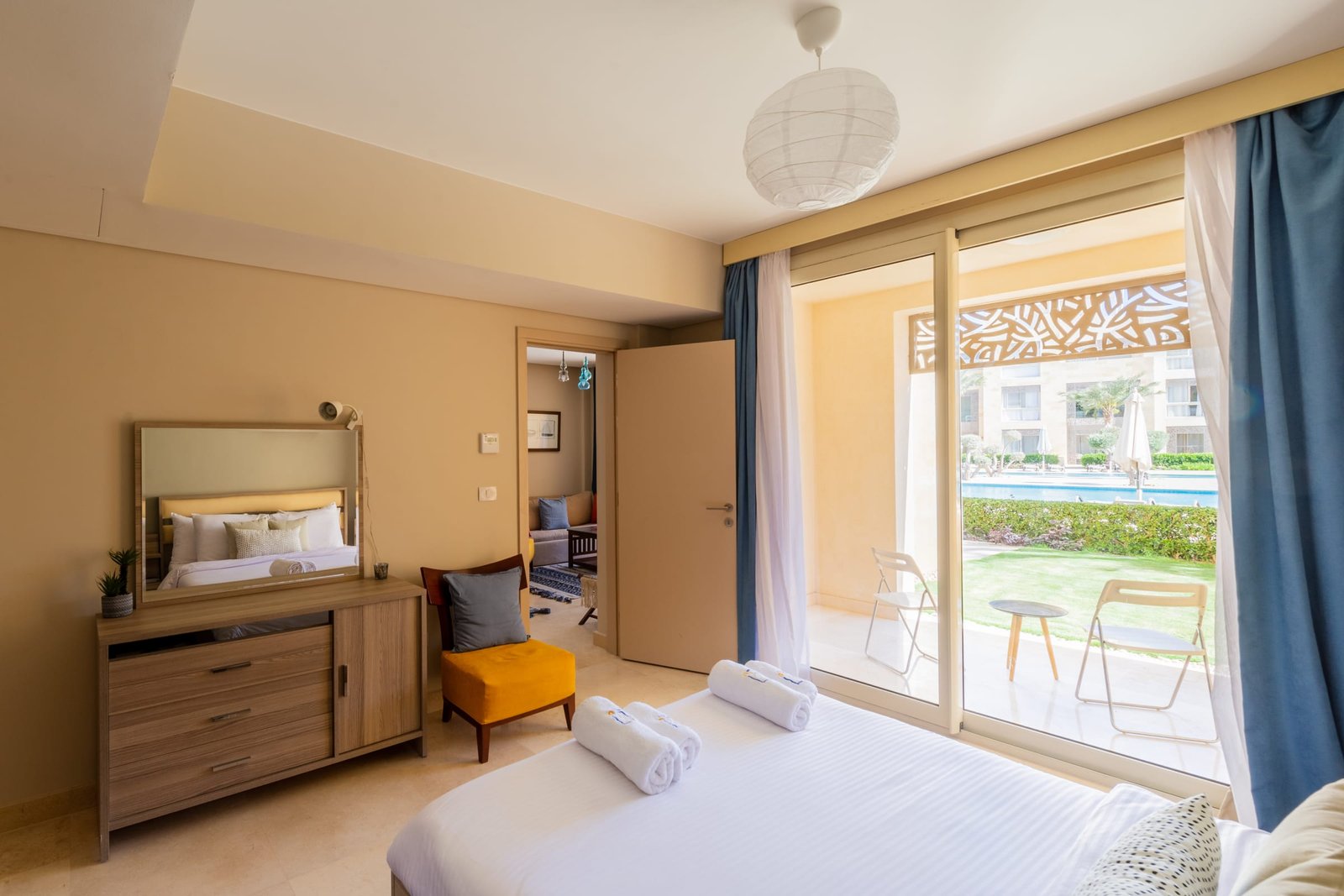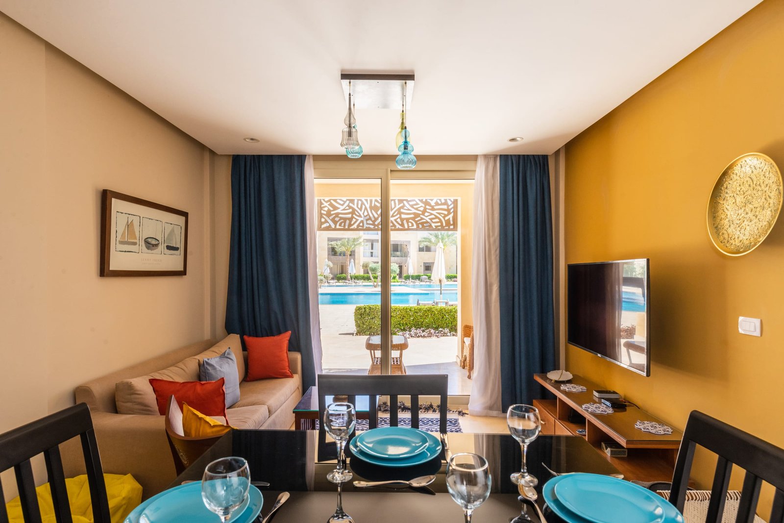 This warm and welcoming 1 bedroom apartment is located in Gouna’s only beachfront residence – Mangroovy with free pool and beach access. Mangroovy is closest to the Marina (10 min walk). The apartment is on the ground floor and features an open plan fully equipped kitchen, 2 bathrooms (one ensuite) and a living room. There is a bright a cosy outdoor furnished terrace, perfect for your morning coffee or late night relaxation. It also features a 55 inch smart TV with Airplay and cable channels, washing machine, a Nespresso machine, kettle and a microwave. The apartment is great for couples & small families. The styling of the apartment is tailored to give the guests a jazzy and happy vibe. Neighborhood: -Mangroovy residence is uniquely located 800 meters from Marina El Gouna. Guests will be able to walk 10 minutes and get to it. -‘Bright Star’ supermarket is right in front of the residence towards the Marina. -Mangroovy is home to the famous ‘Zounii’ beach lounge (located at Mangroovy’s beach) – ‘The Smokery’, a local favorite is also located 450 meters from the residence. Transit: Free outdoor parking is available. Tuktuks are available to take you anywhere in El Gouna