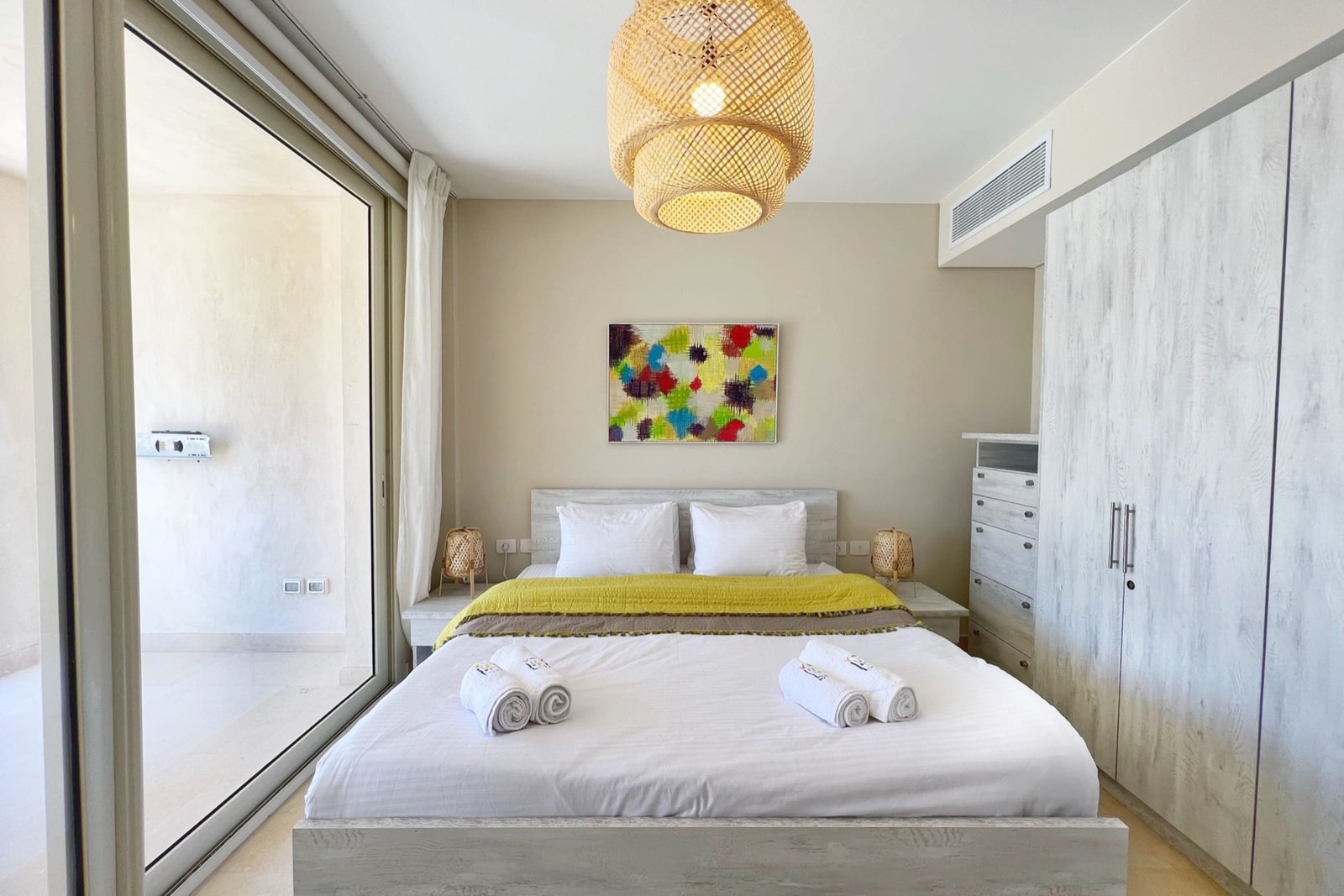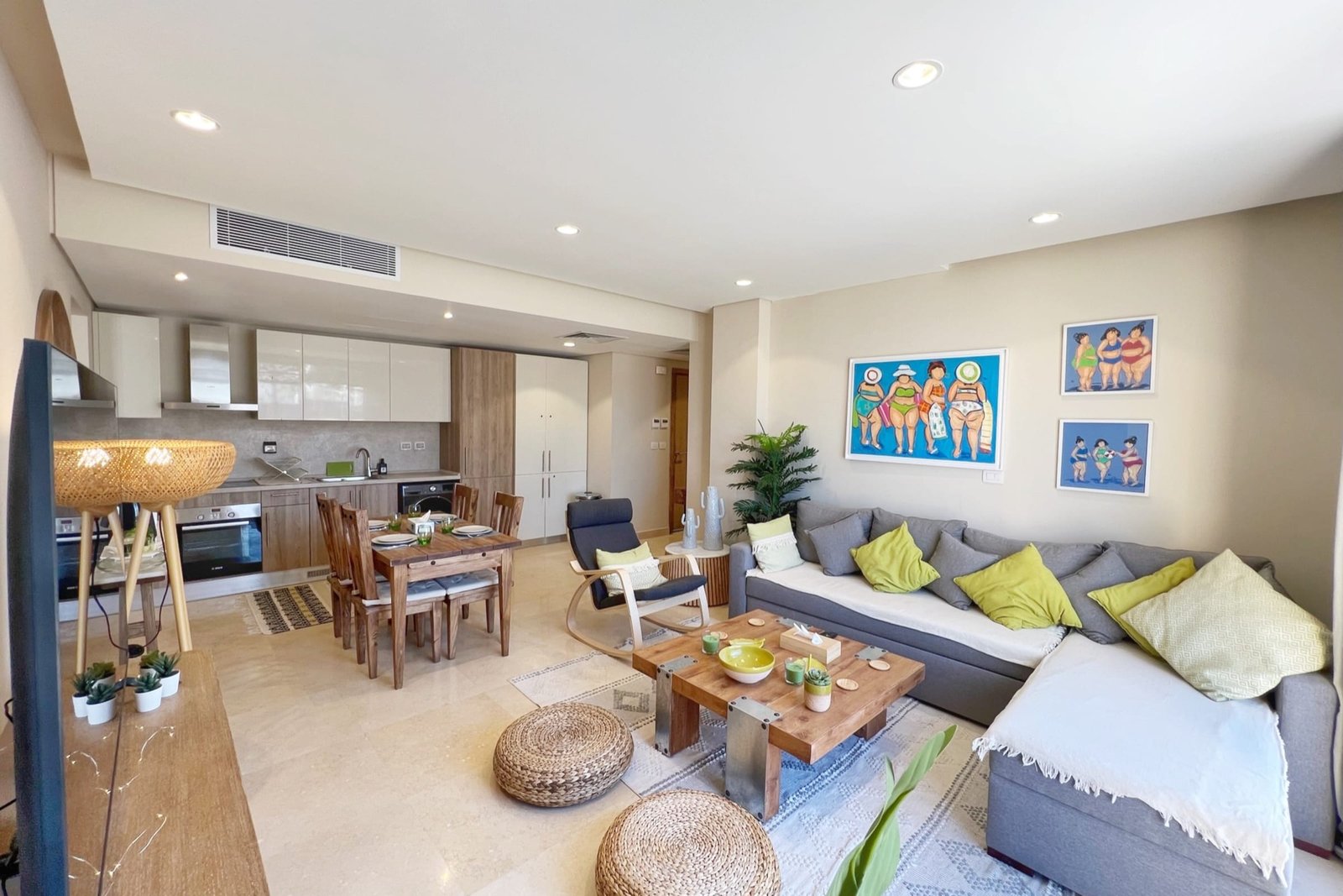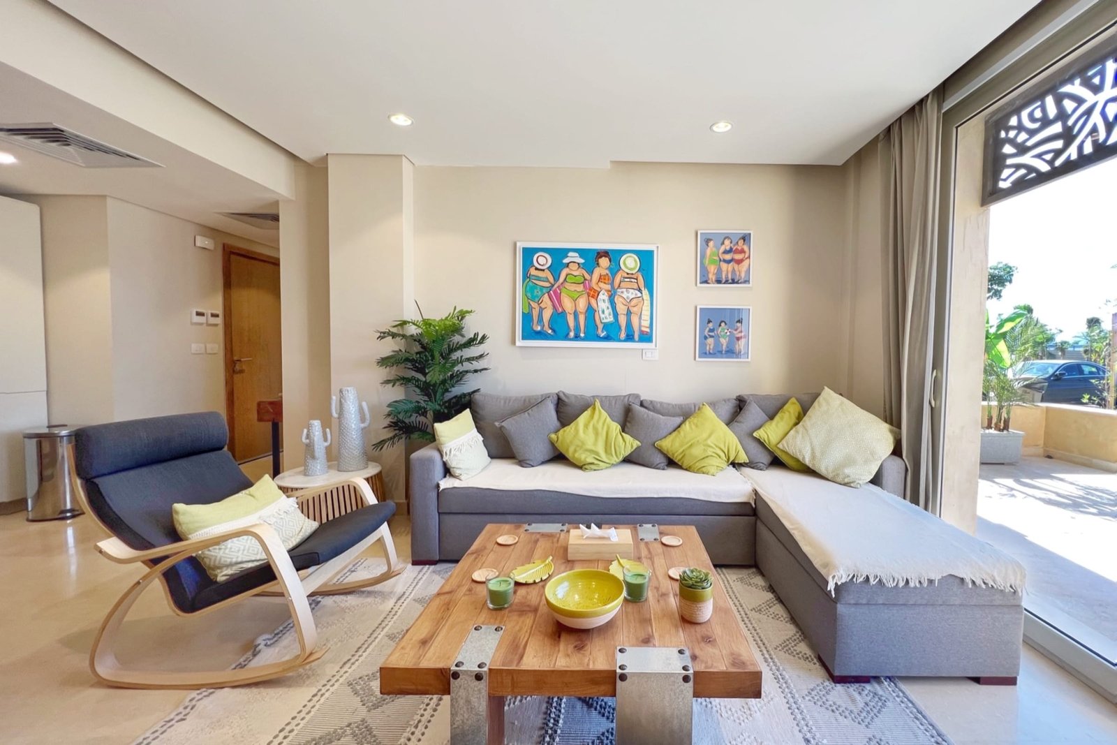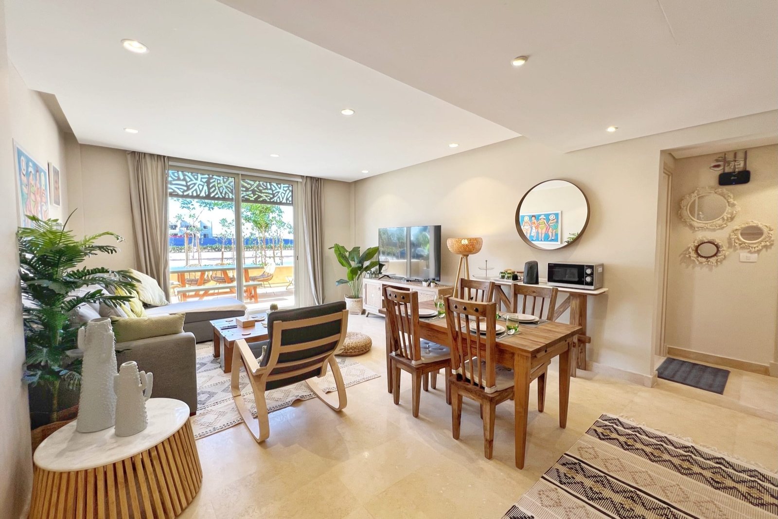 This summery 2 bedroom apartment is located in Gouna’s only beachfront residence – Mangroovy with a free pool and beach access. Mangroovy is closest to the Marina (10 min walk). The apartment is on the ground floor and features an open plan fully equipped kitchen, 1 bathrooms (one ensuite) and a living room. There is also a bright and enjoyable outdoor furnished terrace, perfect for your morning coffee or late night relaxation. The apartment consists of two bedrooms, one with a queen size bed and the other bedroom includes a bunk bed that can sleep two additional guests. It also features a 55 inch smart TV with Airplay and cable channels, washing machine, a Nespresso machine, kettle and a microwave. The apartment is great for couples & small families. The styling of the apartment is tailored to give the guests an exotic and happy vibe. Neighborhood: -Mangroovy residence is uniquely located 800 meters from Marina El Gouna. Guests will be able to walk 10 minutes and get to it. -‘Bright Star’ supermarket is right in front of the residence towards the Marina. -Mangroovy is home to the famous ‘Noi’ beach lounge (located at Mangroovy’s beach) – ‘The Smokery’, a local favorite is also located 450 meters from the residence. Transit: Free outdoor parking is available. Tuktuks are available to take you anywhere in El Gouna