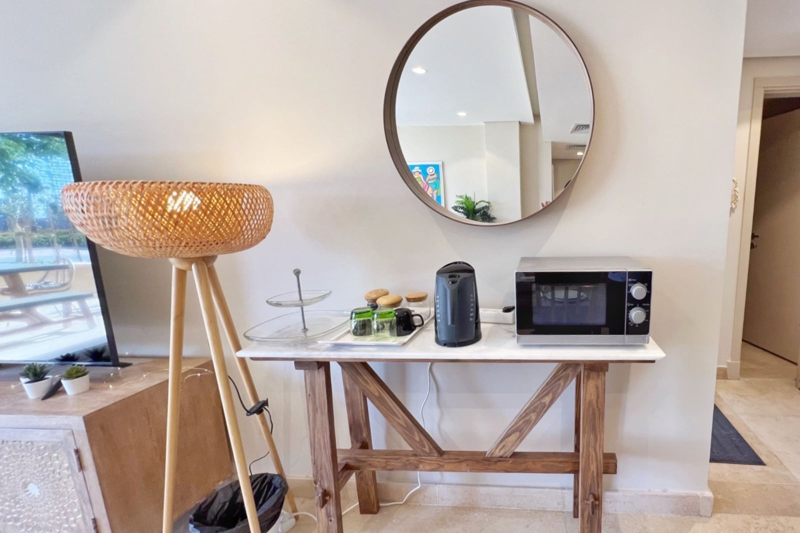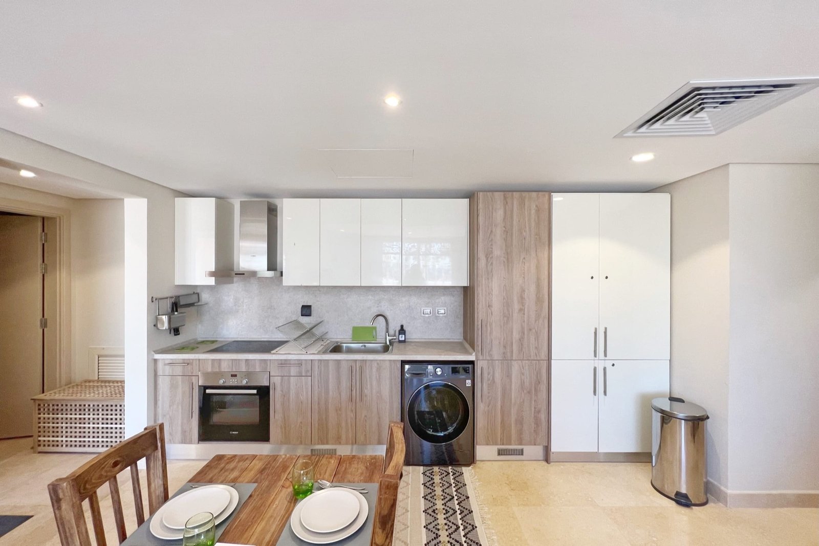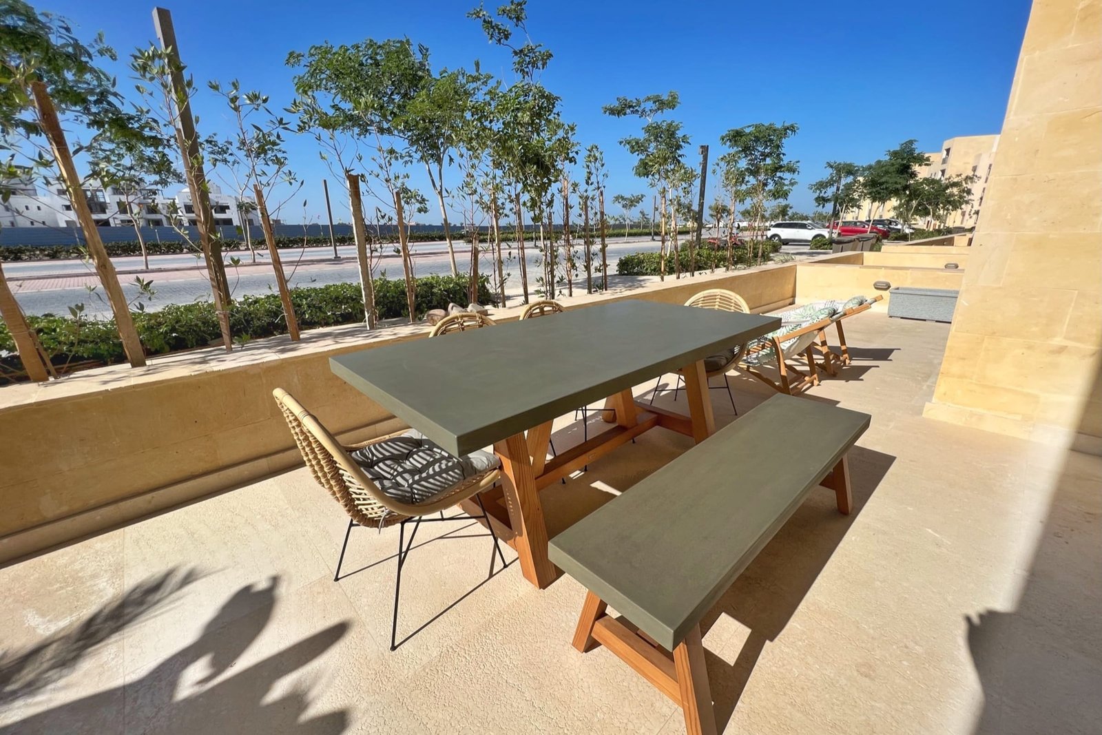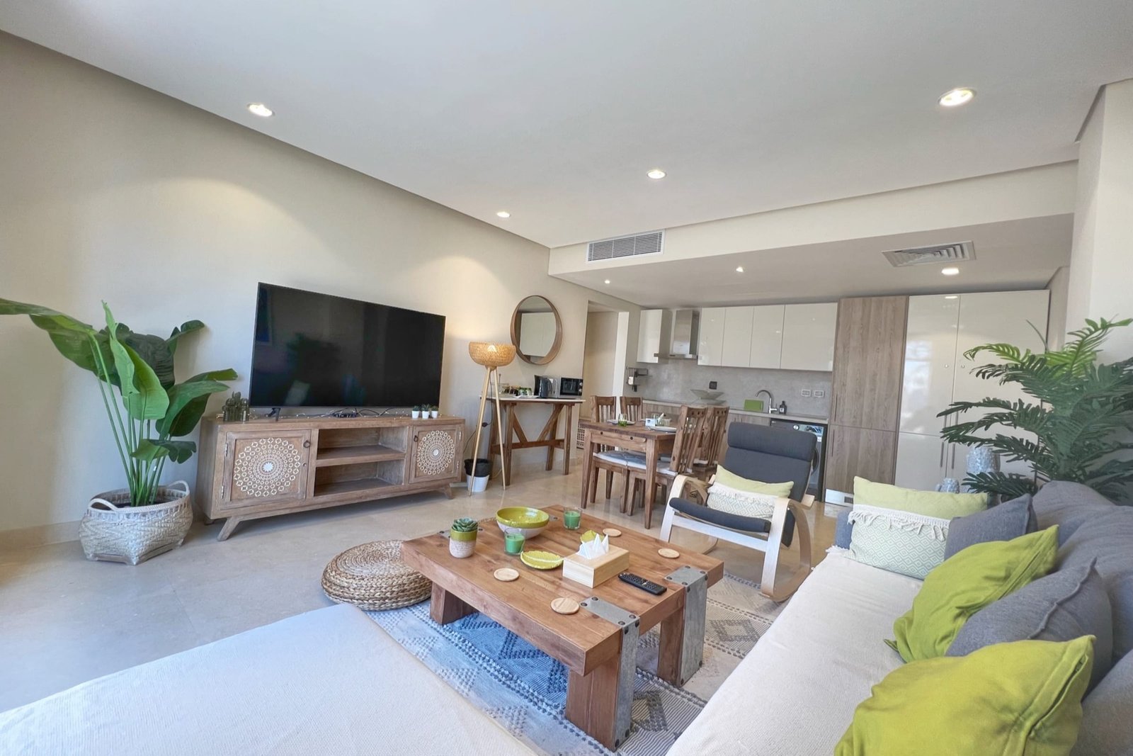 This summery 2 bedroom apartment is located in Gouna’s only beachfront residence – Mangroovy with a free pool and beach access. Mangroovy is closest to the Marina (10 min walk). The apartment is on the ground floor and features an open plan fully equipped kitchen, 1 bathrooms (one ensuite) and a living room. There is also a bright and enjoyable outdoor furnished terrace, perfect for your morning coffee or late night relaxation. The apartment consists of two bedrooms, one with a queen size bed and the other bedroom includes a bunk bed that can sleep two additional guests. It also features a 55 inch smart TV with Airplay and cable channels, washing machine, a Nespresso machine, kettle and a microwave. The apartment is great for couples & small families. The styling of the apartment is tailored to give the guests an exotic and happy vibe. Neighborhood: -Mangroovy residence is uniquely located 800 meters from Marina El Gouna. Guests will be able to walk 10 minutes and get to it. -‘Bright Star’ supermarket is right in front of the residence towards the Marina. -Mangroovy is home to the famous ‘Noi’ beach lounge (located at Mangroovy’s beach) – ‘The Smokery’, a local favorite is also located 450 meters from the residence. Transit: Free outdoor parking is available. Tuktuks are available to take you anywhere in El Gouna