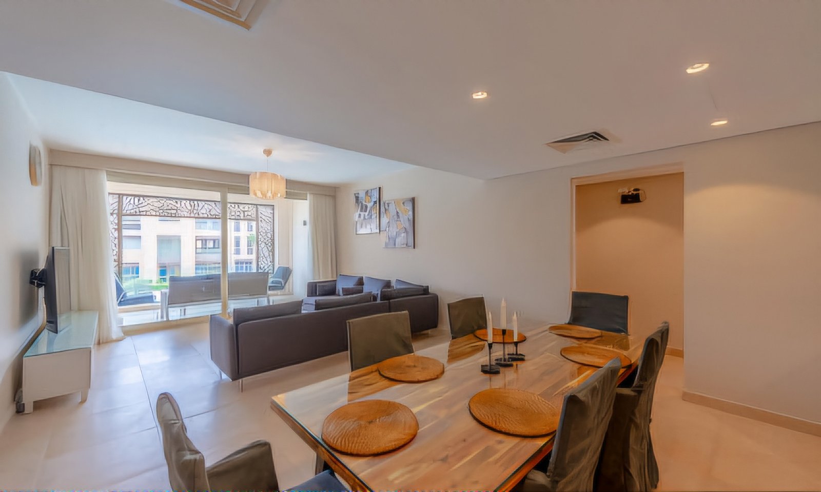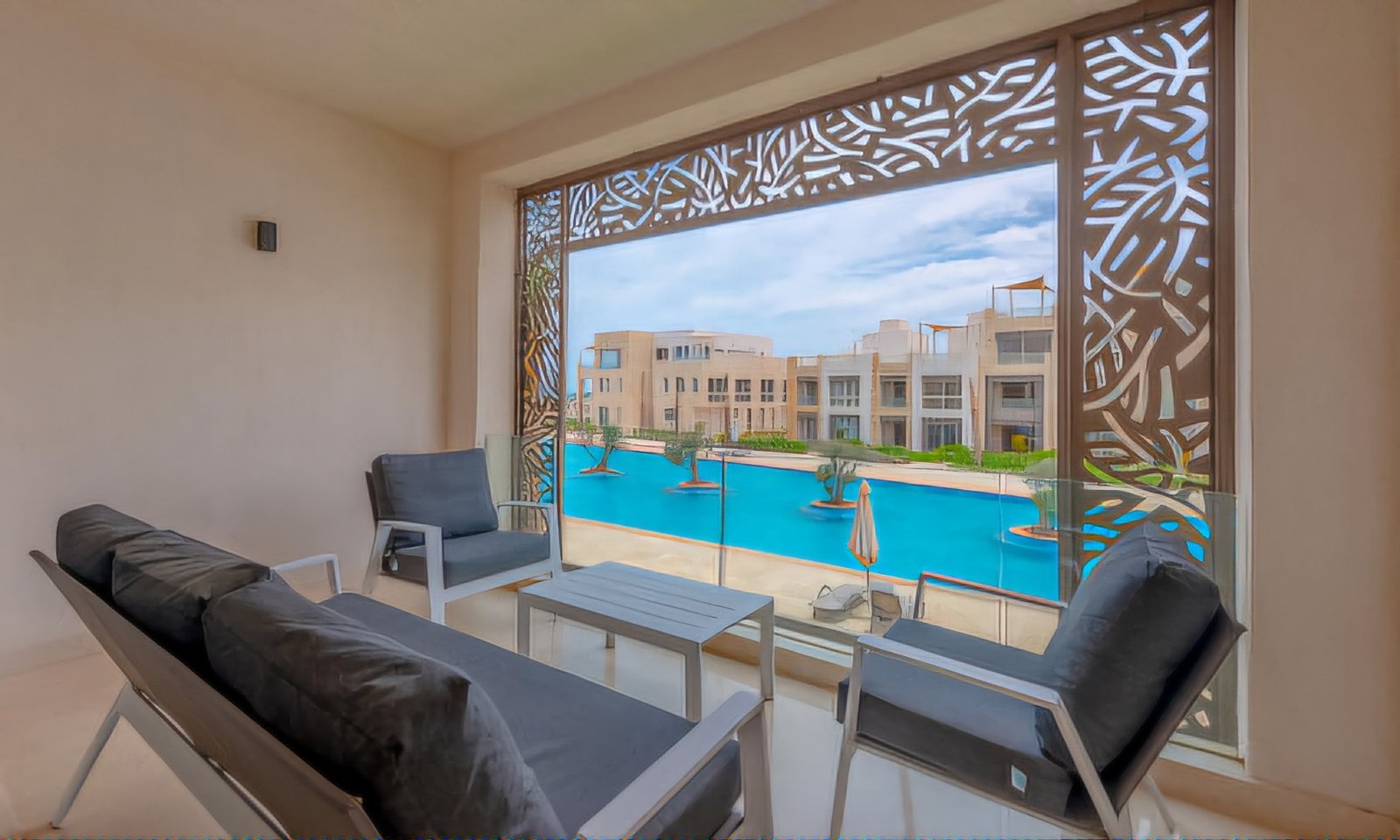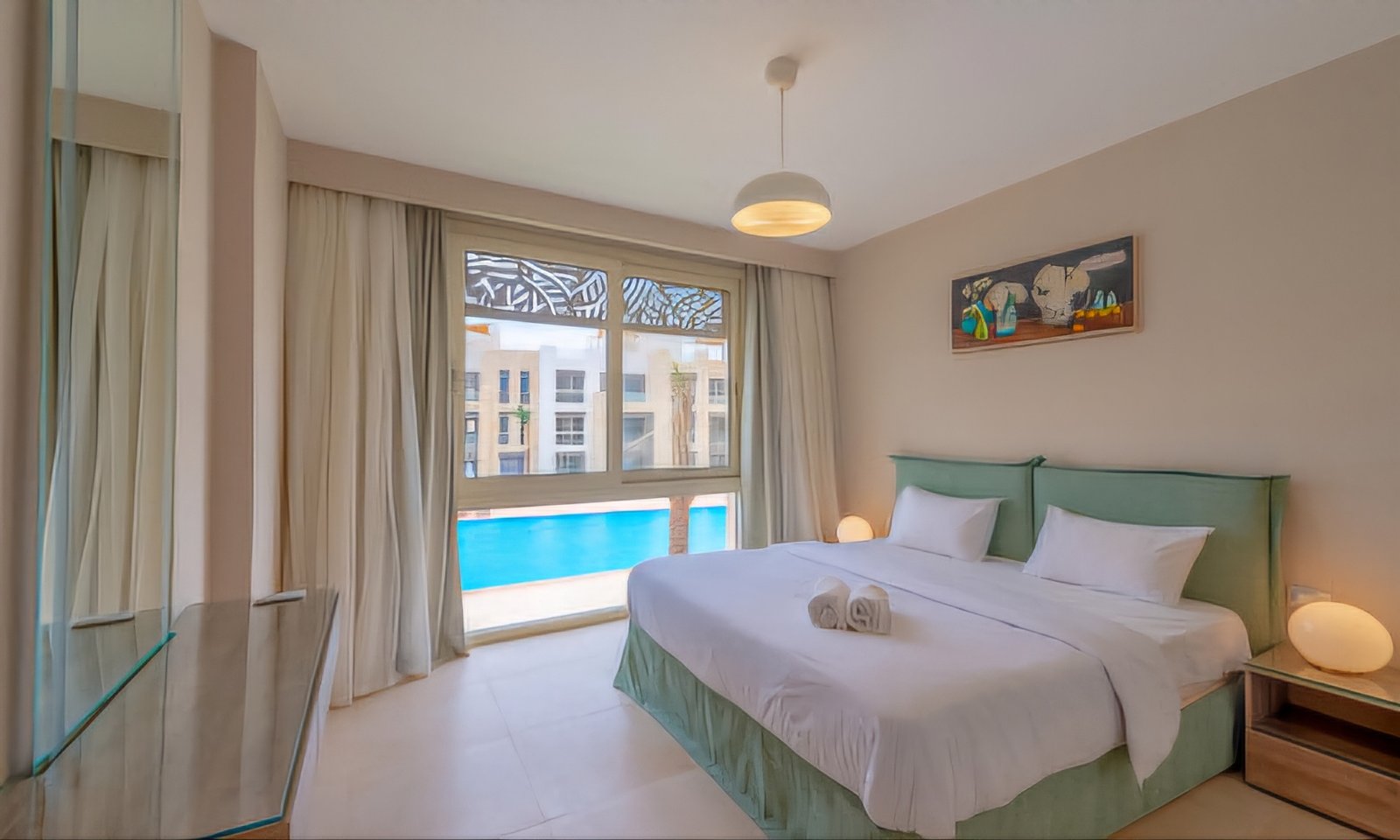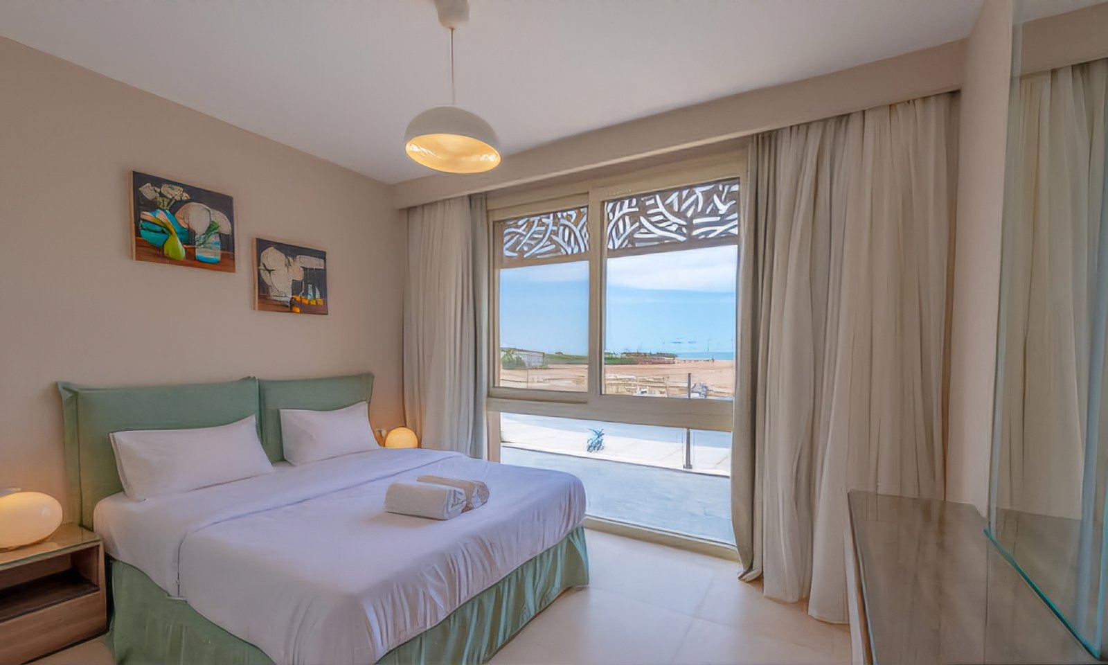 Classy, two-bedroom apartment located by the beautiful, sandy beach, right on the Red Sea coast. Both bedrooms and living open space with terrace are made to enjoy delightful sunsets and views on the Sea and the pool, just a few steps away all for you to explore. This brand new apartment is fully air-conditioned and equipped. Comfy seating area by the TV and large dining table are like an invitation to spend some time with your friends and family after an active day outside. Each bed is Queen size, there are 2 bathrooms with shower; washing machine & dryer, hairdryer, ironing facilities. The kitchen features among other essentials an oven, a 4-burner plate and a coffee maker (capsule machine). WiFi connection across all of the property and free parking are provided for your convenience. Situated in one of the most prominent residential beachfront projects in Gouna, Mangroovy Residence: -1st Floor with terrace & seating set -Elegant, minimalist interior design -2 Queen bed bedrooms with wardrobes and AC -Spacious sitting room with large dining table and seating area -2 Bathrooms with shower -Fully equipped kitchen -Smart TV -Free WiFi -Washing machine & dryer -Hairdryer -Ironing facilities -Direct and easy access to the beach and seaside -Free swimming pool access -Free parking Only 3 min walk to Red Sea Zone and KBC Club (Kitesurfing centers), 10 min walk to Abu Tig Marina, the heart of El Gouna’s dining, shopping and nightlife. 3 min drive to Downtown, Closest supermarket 200m away.