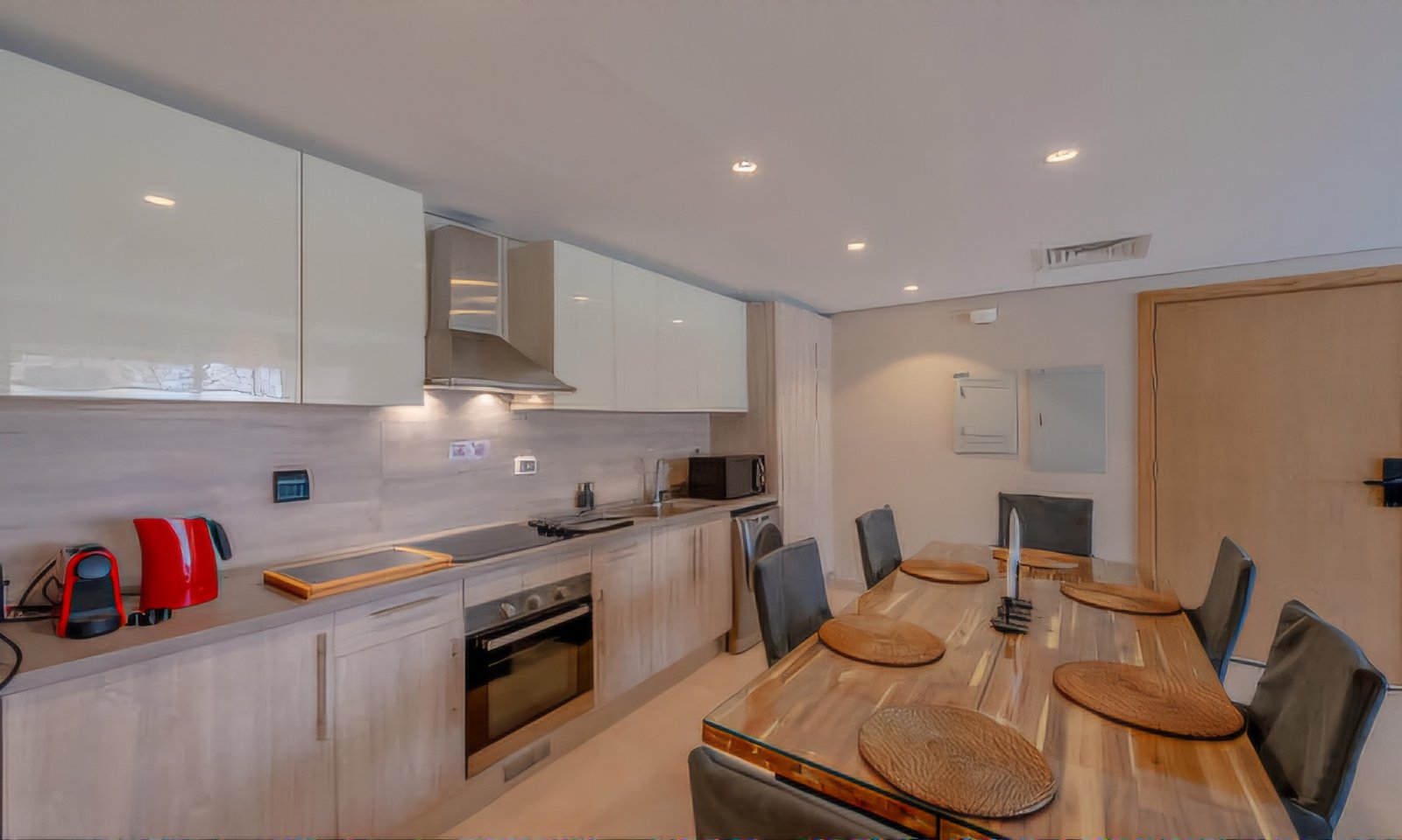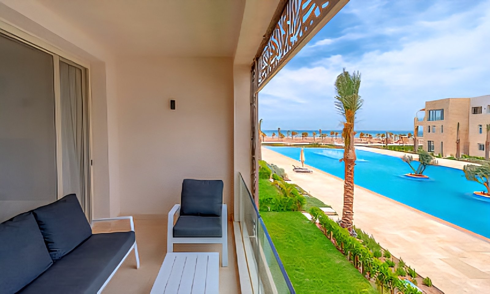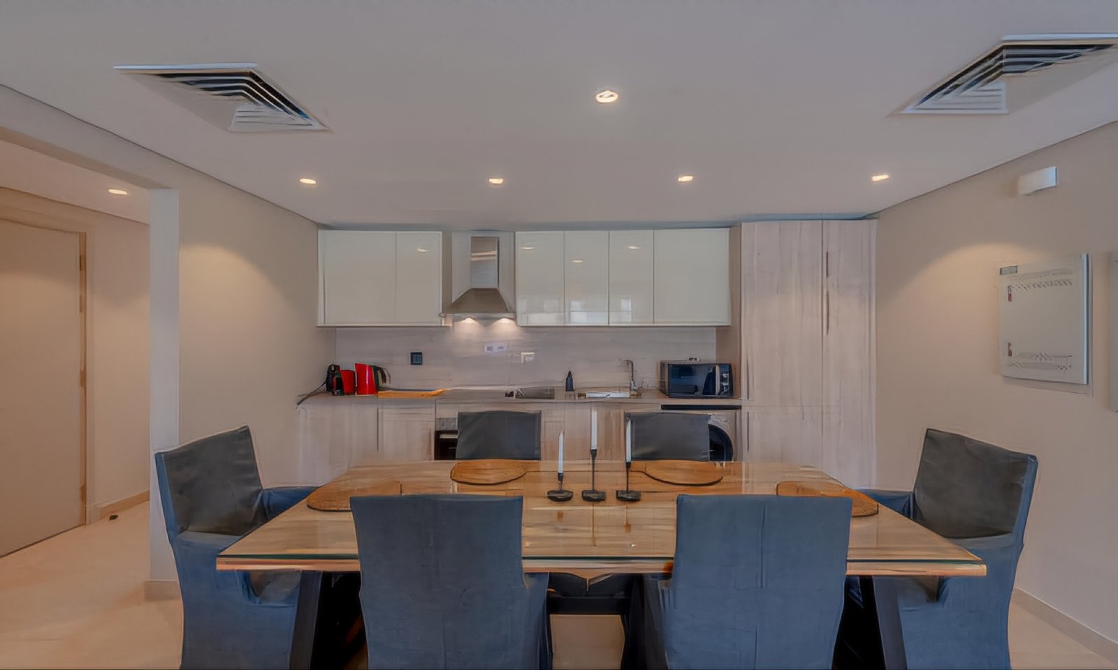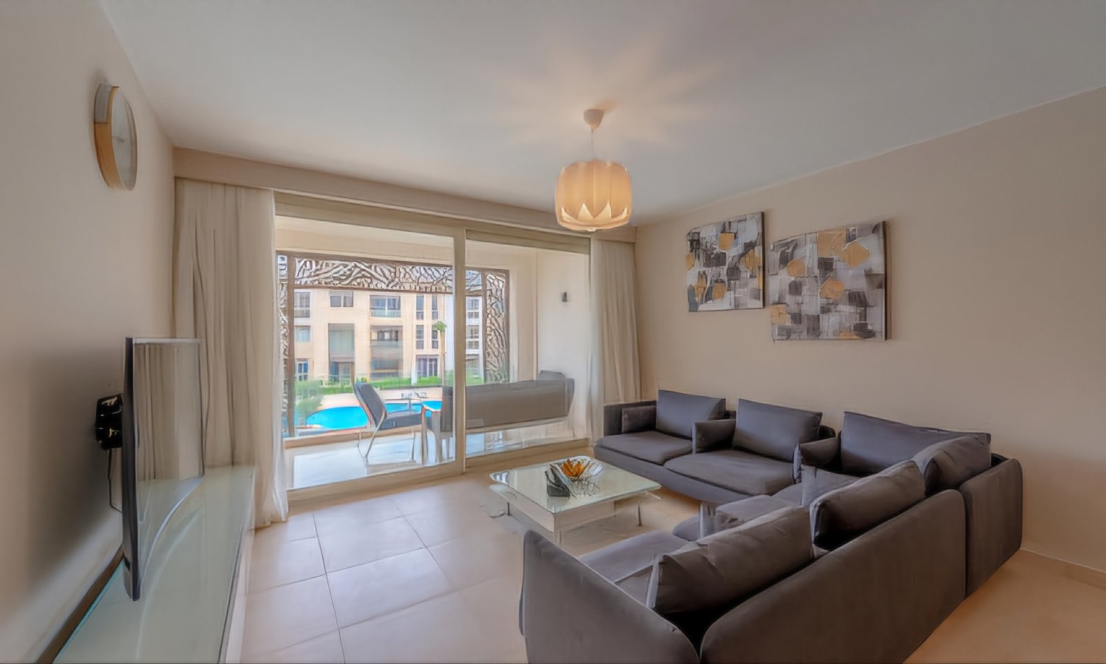 Classy, two-bedroom apartment located by the beautiful, sandy beach, right on the Red Sea coast. Both bedrooms and living open space with terrace are made to enjoy delightful sunsets and views on the Sea and the pool, just a few steps away all for you to explore. This brand new apartment is fully air-conditioned and equipped. Comfy seating area by the TV and large dining table are like an invitation to spend some time with your friends and family after an active day outside. Each bed is Queen size, there are 2 bathrooms with shower; washing machine & dryer, hairdryer, ironing facilities. The kitchen features among other essentials an oven, a 4-burner plate and a coffee maker (capsule machine). WiFi connection across all of the property and free parking are provided for your convenience. Situated in one of the most prominent residential beachfront projects in Gouna, Mangroovy Residence: -1st Floor with terrace & seating set -Elegant, minimalist interior design -2 Queen bed bedrooms with wardrobes and AC -Spacious sitting room with large dining table and seating area -2 Bathrooms with shower -Fully equipped kitchen -Smart TV -Free WiFi -Washing machine & dryer -Hairdryer -Ironing facilities -Direct and easy access to the beach and seaside -Free swimming pool access -Free parking Only 3 min walk to Red Sea Zone and KBC Club (Kitesurfing centers), 10 min walk to Abu Tig Marina, the heart of El Gouna’s dining, shopping and nightlife. 3 min drive to Downtown, Closest supermarket 200m away.