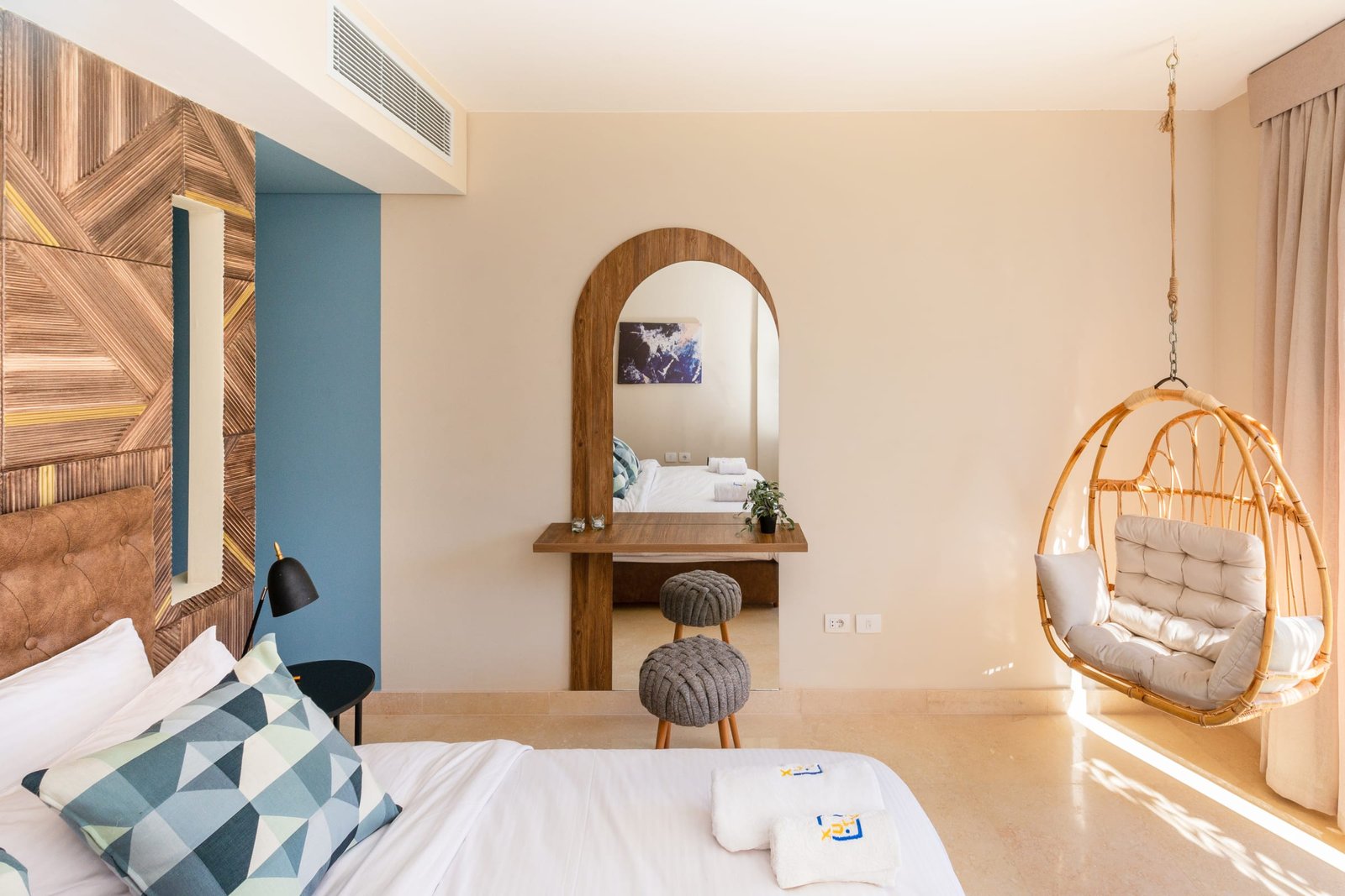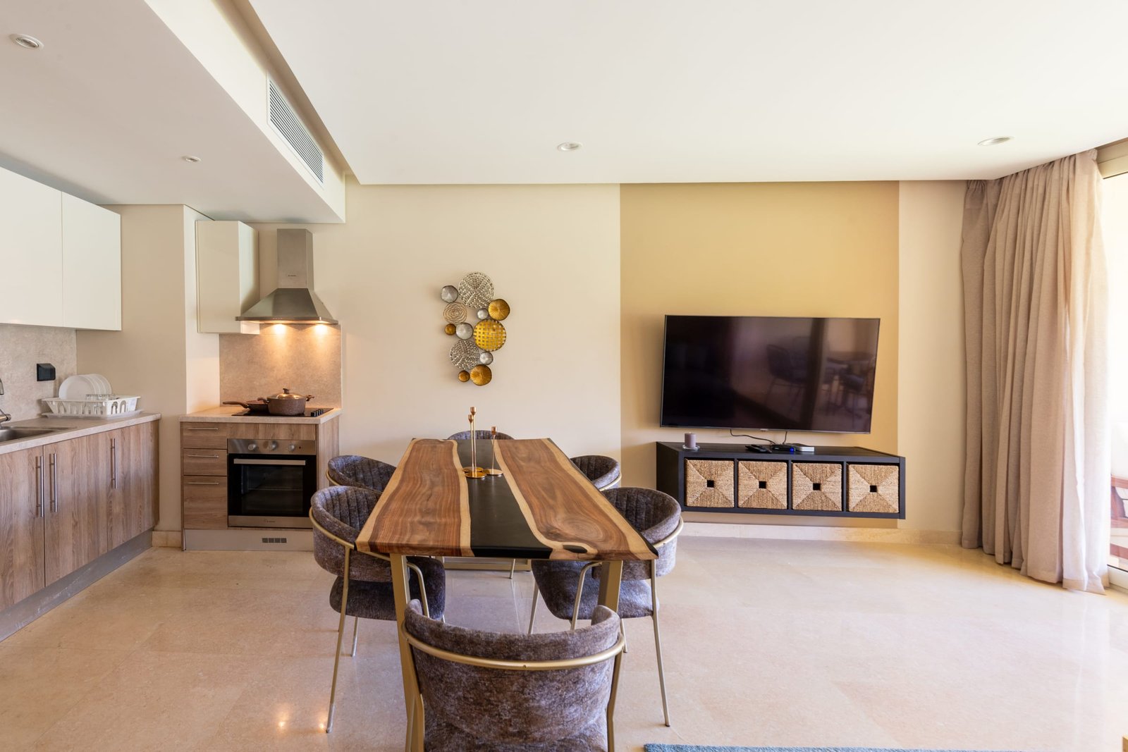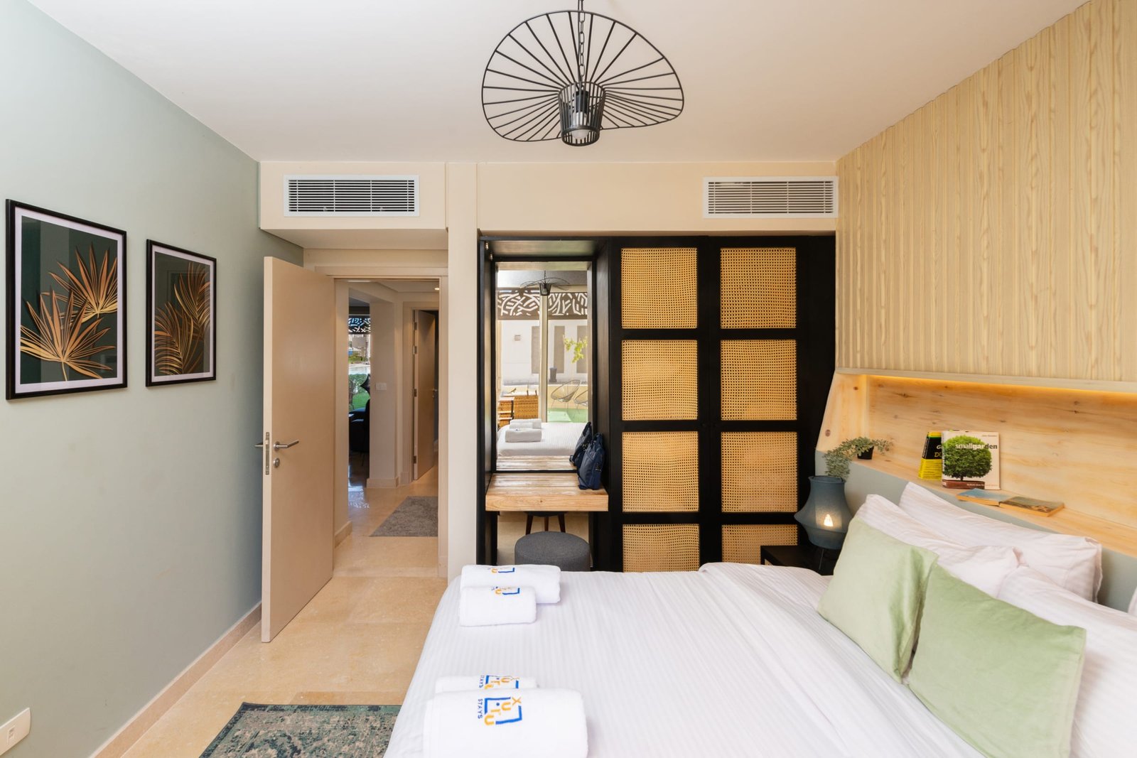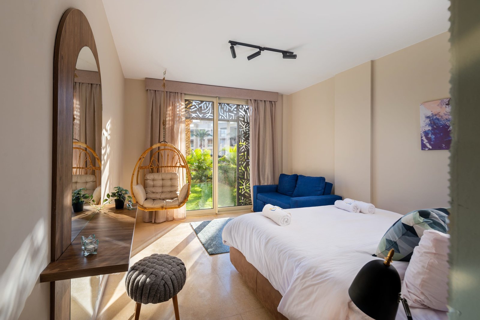 This secluded 2 bedroom apartment is located in Gouna’s only beachfront residence – Mangroovy with a 24/7 free pool and beach access. Mangroovy is closest to the Marina (10 min walk). The 2 bed apartment comes with an open plan fully equipped kitchen, 2 full bathrooms with 1 ensuite and a living room with a large sofa that can sleep 1 additional guest, not to mention a beautiful large terrance overlooking the pool. It also features a 65 inch smart TV with Airplay and cable channels, washing machine, a Nespresso machine, kettle and a microwave. The apartment is great for couples & families. The styling is made with a minimal boho approach to follow the color schemes seen across the beautiful city of El Gouna. Neighborhood: -Mangroovy residence is uniquely located 800 meters from Abu Tig Marina. Guests will be able to walk 10 minutes and get to it. -‘Bright Star’ supermarket is right in front of the residence towards the Marina. -Mangroovy is home to the famous ‘Noi’ beach lounge (located at Mangroovy’s beach) – ‘The Smokery’, a local favorite is also located 450 meters from the residence. Transit: Free outdoor parking is available. Tuktuks are available to take you anywhere in El Gouna