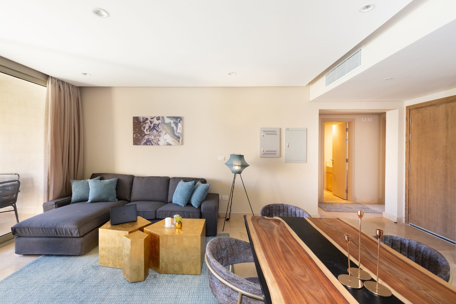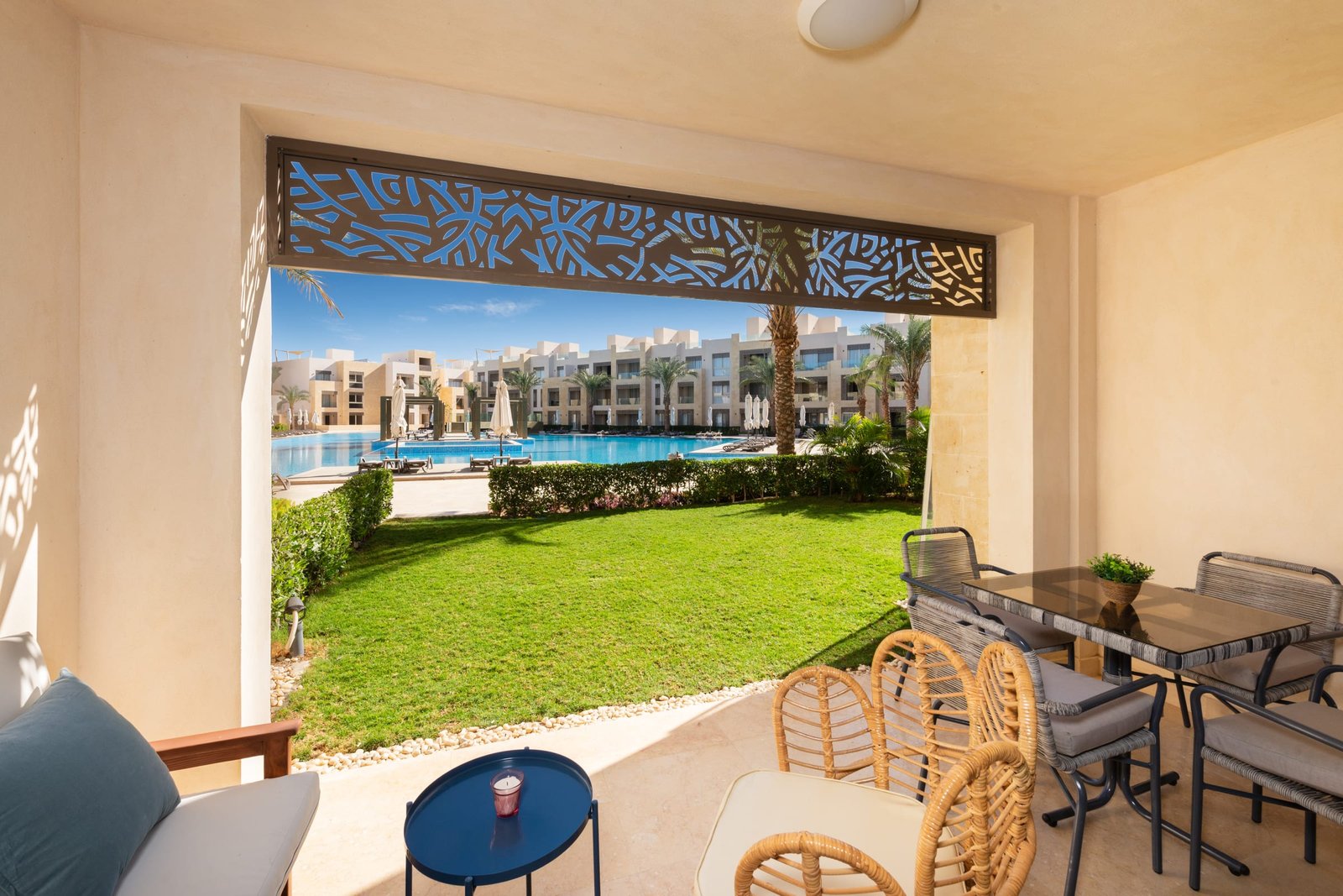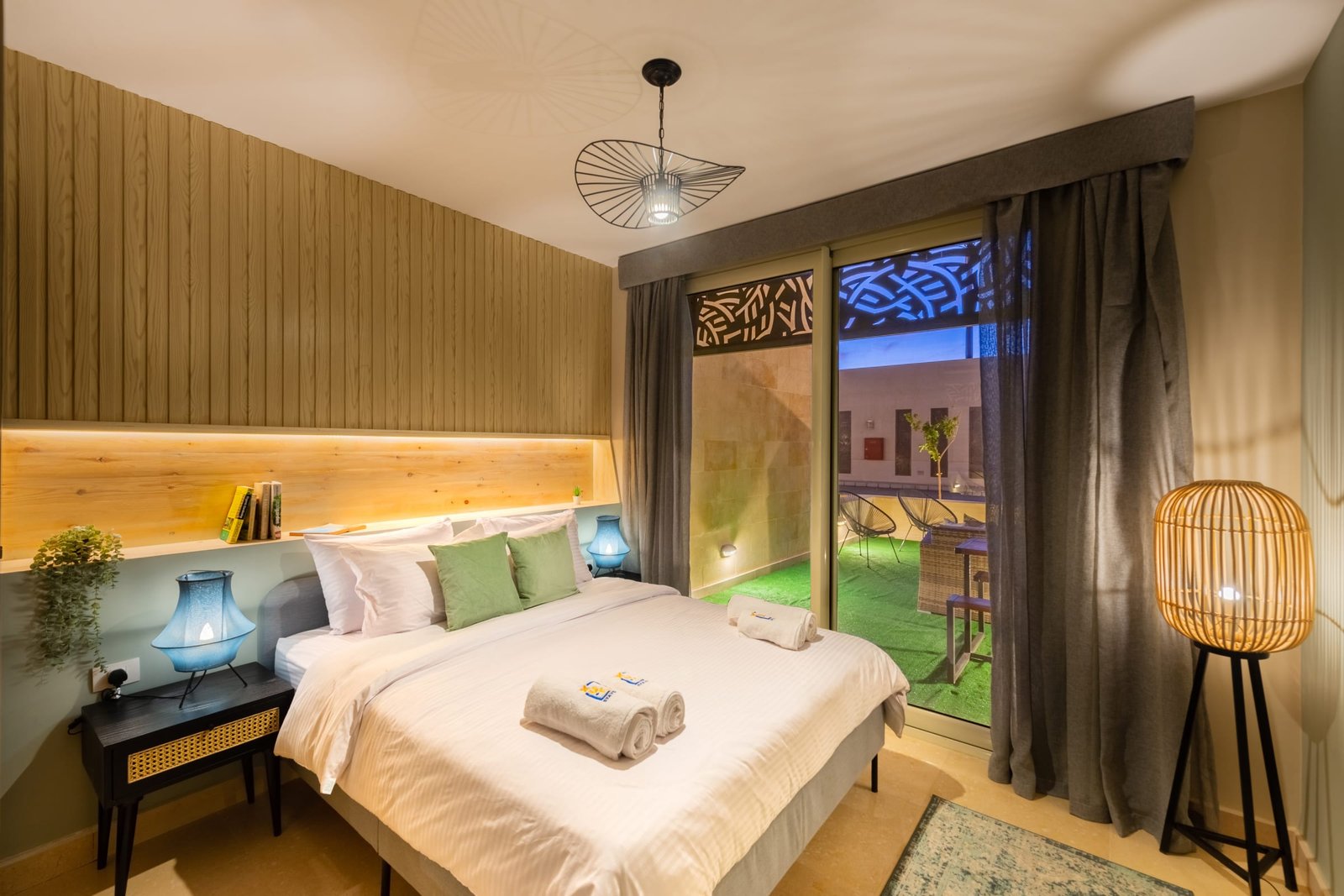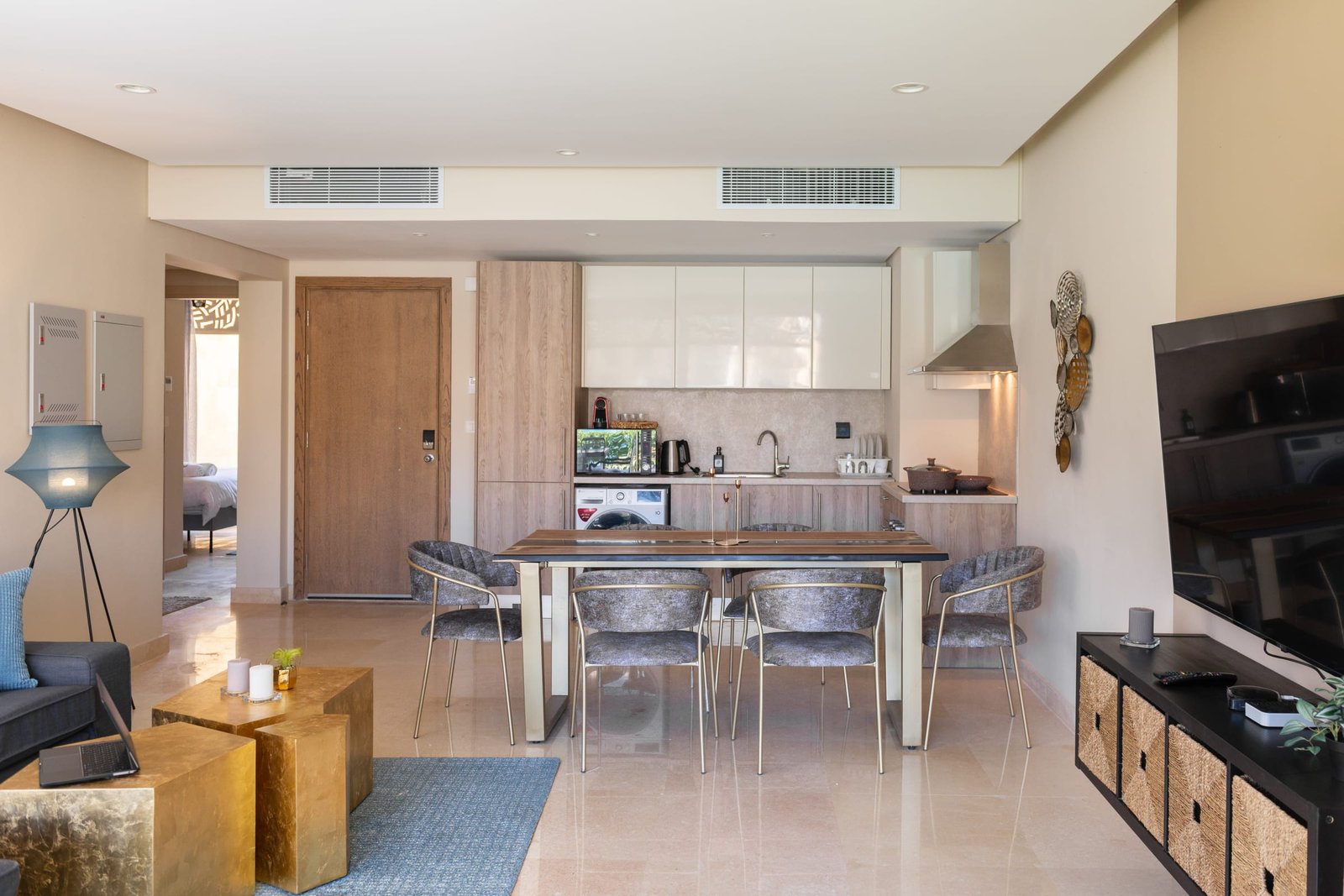 This secluded 2 bedroom apartment is located in Gouna’s only beachfront residence – Mangroovy with a 24/7 free pool and beach access. Mangroovy is closest to the Marina (10 min walk). The 2 bed apartment comes with an open plan fully equipped kitchen, 2 full bathrooms with 1 ensuite and a living room with a large sofa that can sleep 1 additional guest, not to mention a beautiful large terrance overlooking the pool. It also features a 65 inch smart TV with Airplay and cable channels, washing machine, a Nespresso machine, kettle and a microwave. The apartment is great for couples & families. The styling is made with a minimal boho approach to follow the color schemes seen across the beautiful city of El Gouna. Neighborhood: -Mangroovy residence is uniquely located 800 meters from Abu Tig Marina. Guests will be able to walk 10 minutes and get to it. -‘Bright Star’ supermarket is right in front of the residence towards the Marina. -Mangroovy is home to the famous ‘Noi’ beach lounge (located at Mangroovy’s beach) – ‘The Smokery’, a local favorite is also located 450 meters from the residence. Transit: Free outdoor parking is available. Tuktuks are available to take you anywhere in El Gouna