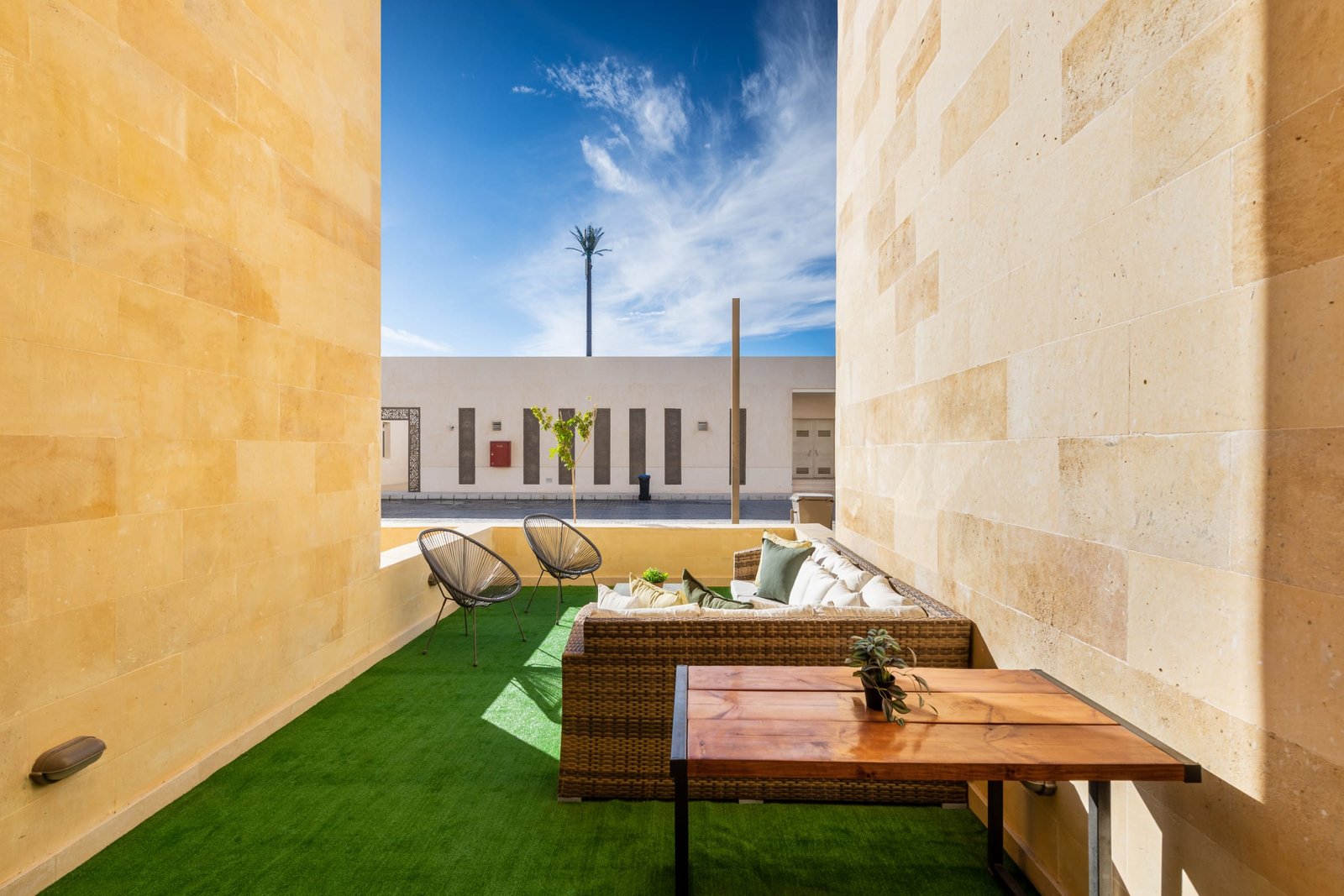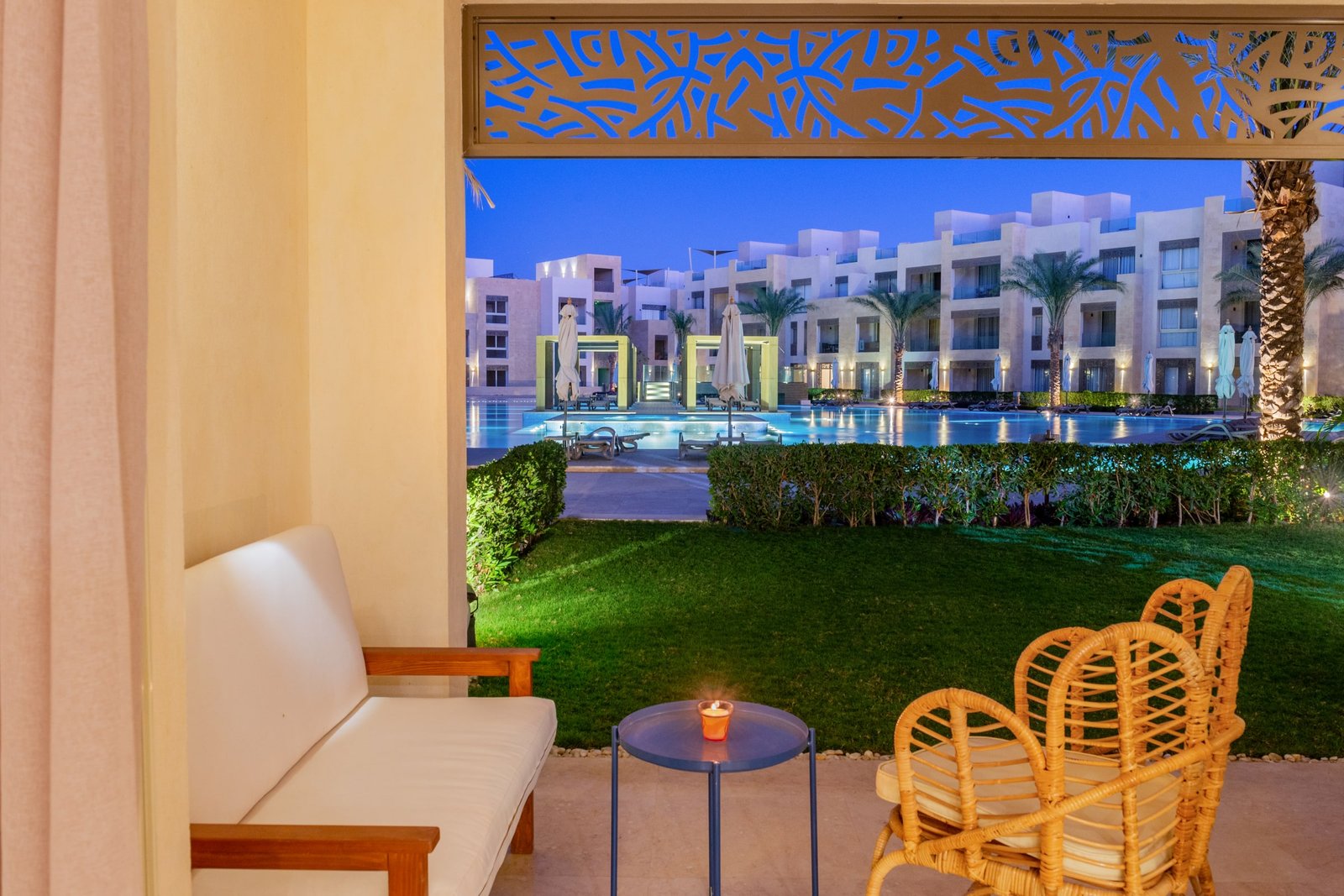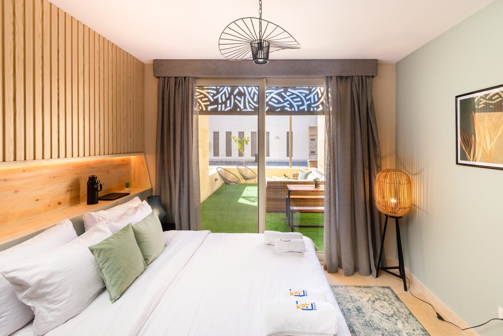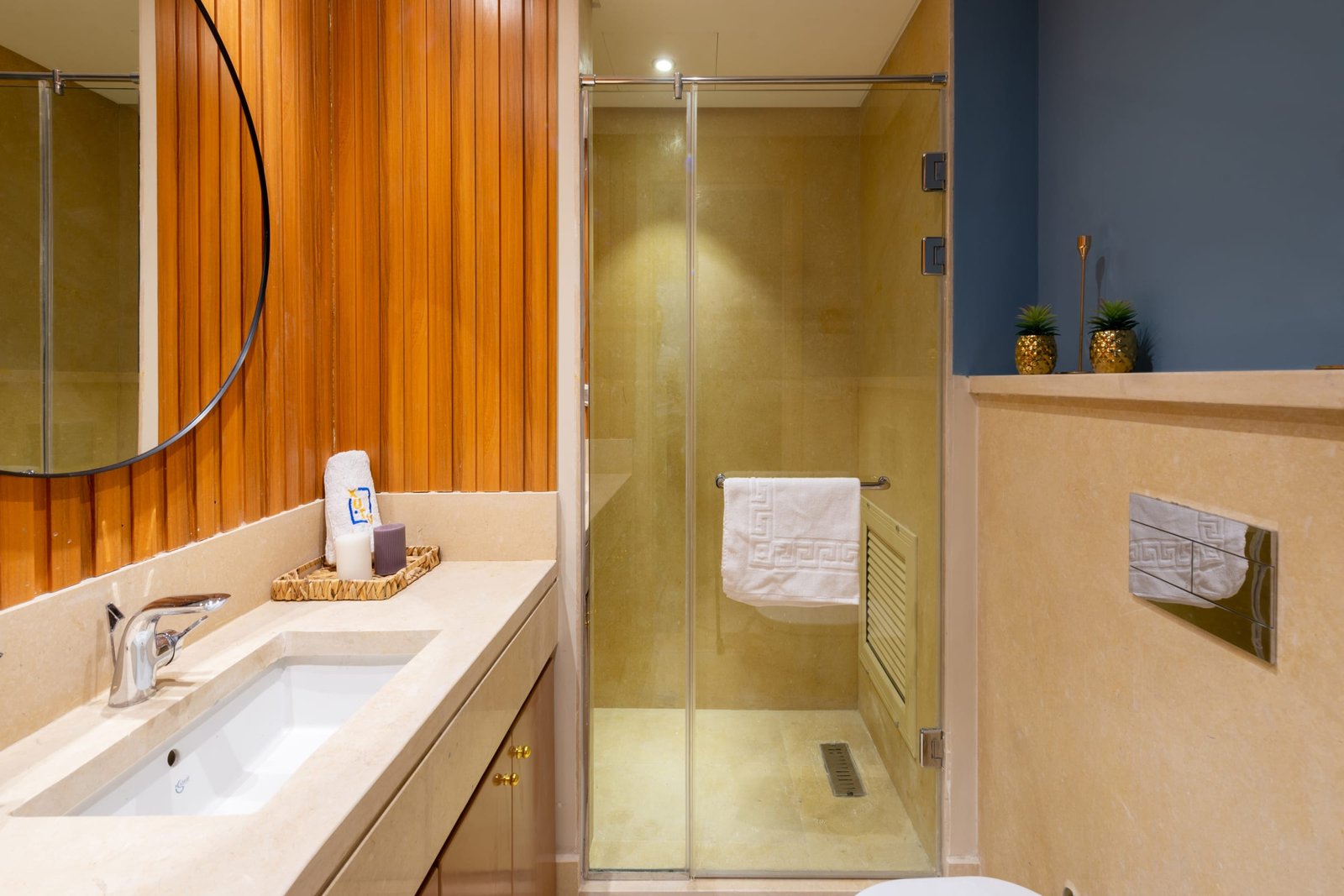 This secluded 2 bedroom apartment is located in Gouna’s only beachfront residence – Mangroovy with a 24/7 free pool and beach access. Mangroovy is closest to the Marina (10 min walk). The 2 bed apartment comes with an open plan fully equipped kitchen, 2 full bathrooms with 1 ensuite and a living room with a large sofa that can sleep 1 additional guest, not to mention a beautiful large terrance overlooking the pool. It also features a 65 inch smart TV with Airplay and cable channels, washing machine, a Nespresso machine, kettle and a microwave. The apartment is great for couples & families. The styling is made with a minimal boho approach to follow the color schemes seen across the beautiful city of El Gouna. Neighborhood: -Mangroovy residence is uniquely located 800 meters from Abu Tig Marina. Guests will be able to walk 10 minutes and get to it. -‘Bright Star’ supermarket is right in front of the residence towards the Marina. -Mangroovy is home to the famous ‘Noi’ beach lounge (located at Mangroovy’s beach) – ‘The Smokery’, a local favorite is also located 450 meters from the residence. Transit: Free outdoor parking is available. Tuktuks are available to take you anywhere in El Gouna