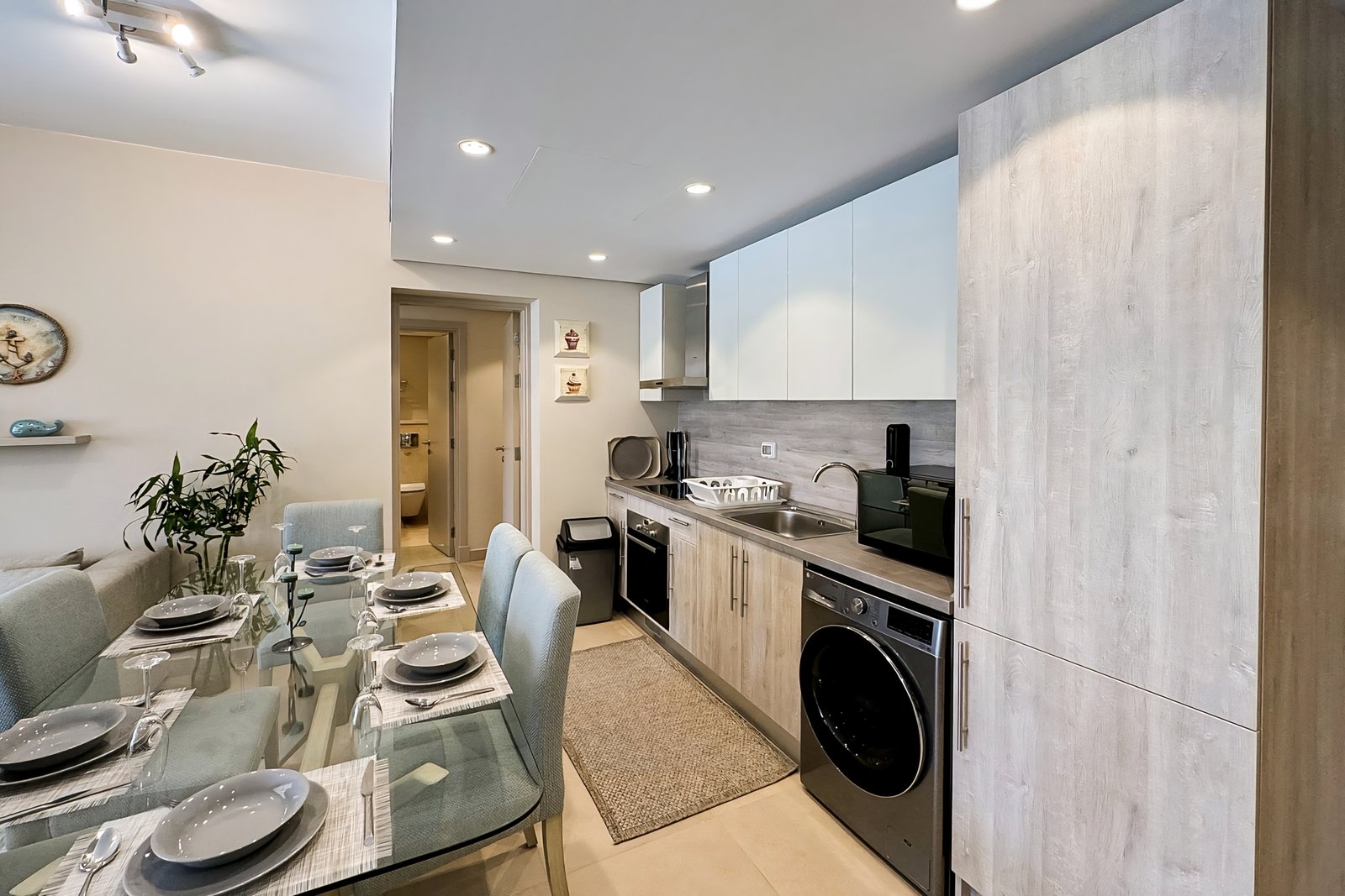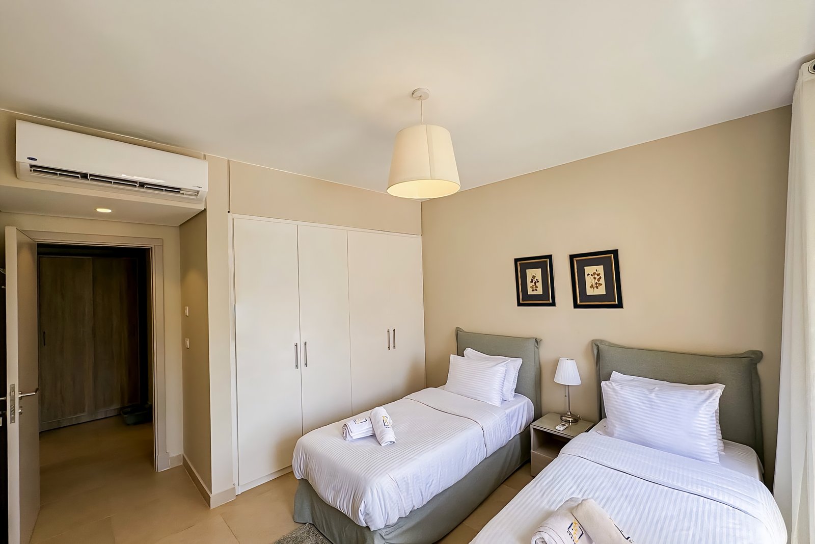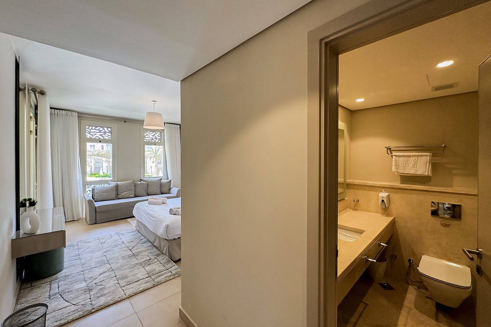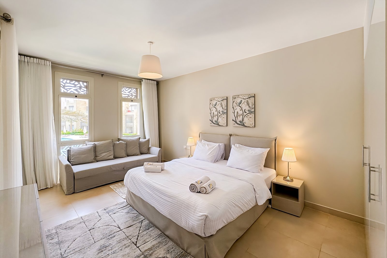 This chilled 2 bedroom apartment is located in Gouna’s only beachfront residence – Mangroovy with a 24/7 free pool and beach access. Mangroovy is closest to the Marina (10 min walk). The apartment is on the first floor and features an open plan fully equipped kitchen, 2 bathrooms (one ensuite) and a living room with a sofa bed that can sleep up to 2 additional guests. It also features a 65 inch smart TV with Airplay and cable channels, washing machine, a Nespresso machine, kettle and a microwave. The apartment is great for couples & small families. The styling of the apartment is tailored to give the guests a serene and calming vibe. Neighborhood: -Mangroovy residence is uniquely located 800 meters from Marina El Gouna. Guests will be able to walk 10 minutes and get to it. -‘Bright Star’ supermarket is right in front of the residence towards the Marina. -Mangroovy is home to the famous ‘Noi’ beach lounge (located at Mangroovy’s beach) – ‘The Smokery’, a local favorite is also located 450 meters from the residence. Transit: Free outdoor parking is available. Tuktuks are available to take you anywhere in El Gouna