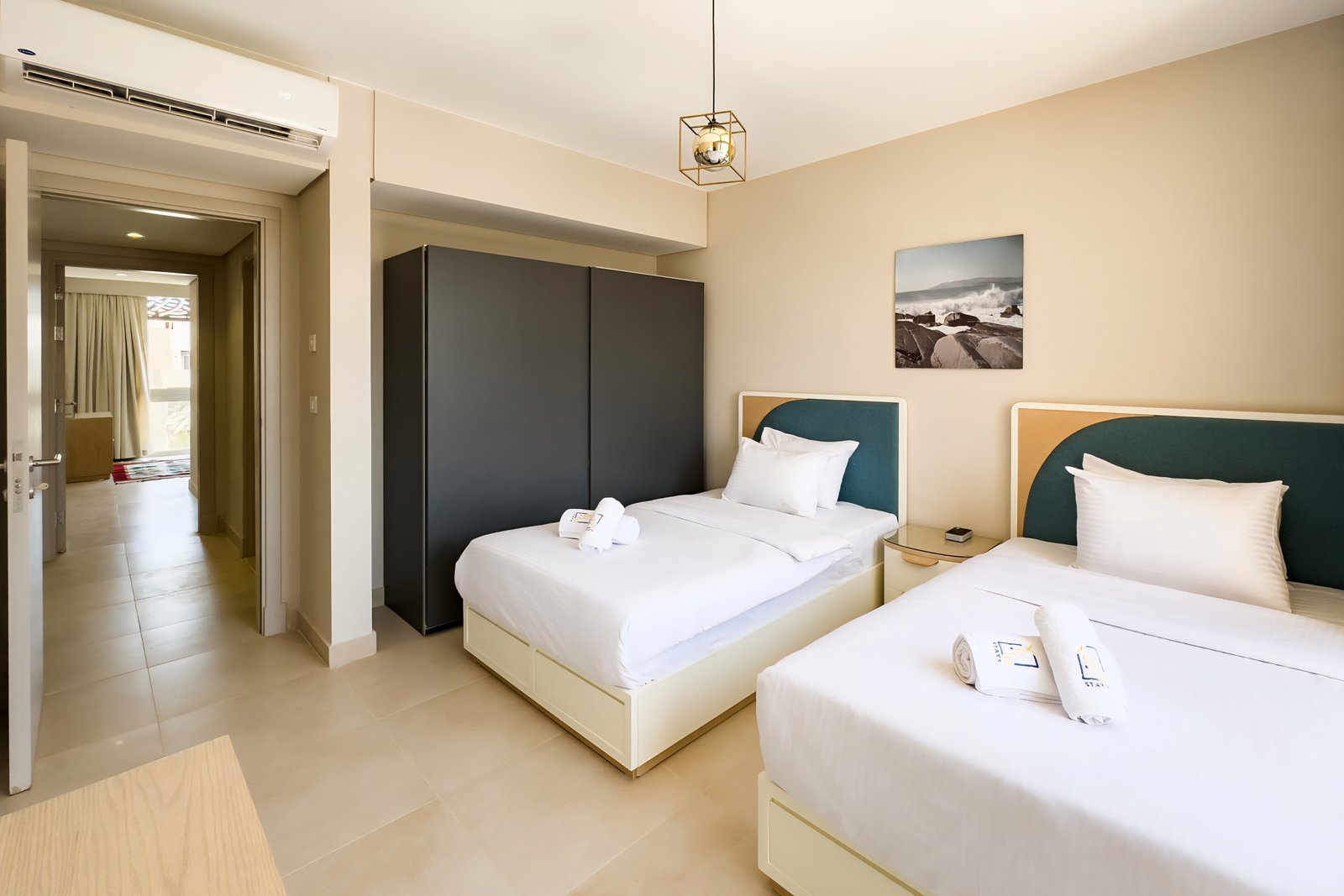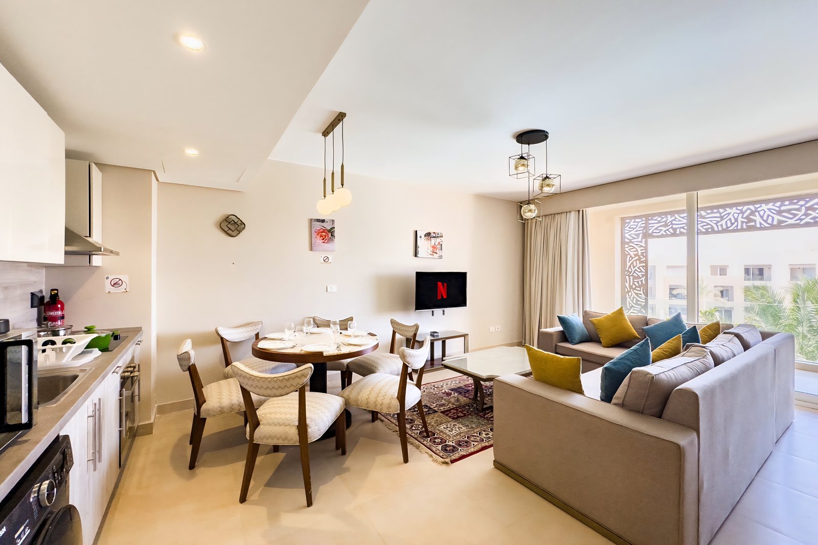 This trendy 2 bedroom apartment is located in Gouna’s only beachfront residence – Mangroovy with free pool and beach access. Mangroovy is closest to the Marina (10 min walk). The 2 bedroom apartment comes with an open plan fully equipped kitchen, 2 full bathrooms, with 1 and a living room. It also features a 55 inch smart TV with Airplay and cable channels, washing machine, a Nespresso machine, kettle and a microwave. The apartment is great for couples. The styling is made with a modish and calming taste to ensure guests have a wonderful and relaxing experience. Neighborhood: -Mangroovy residence is uniquely located 800 meters from Abu Tig Marina. Guests will be able to walk 10 minutes and get to it. -‘Bright Star’ supermarket is right in front of the residence towards the Marina. -Mangroovy is home to the ‘Zouni’ beach lounge (located at Mangroovy’s beach) – ‘The Smokery’, a local favorite is also located 450 meters from the residence. Transit: Free outdoor parking is available. Tuktuks are available to take you anywhere in El Gouna.