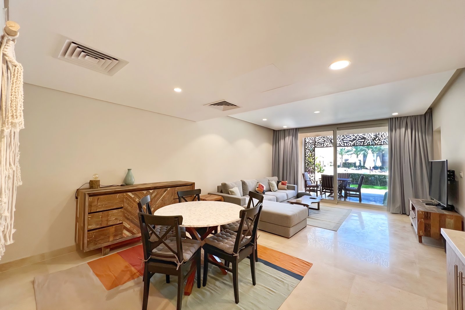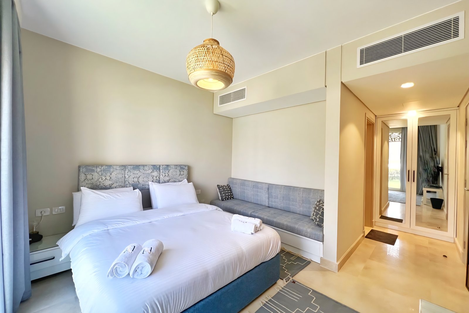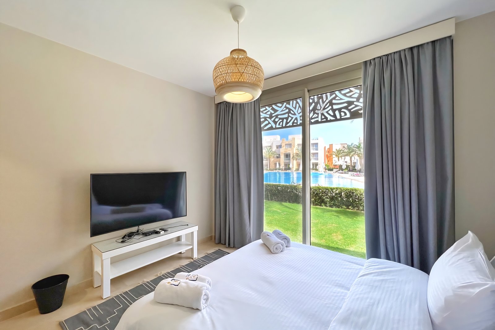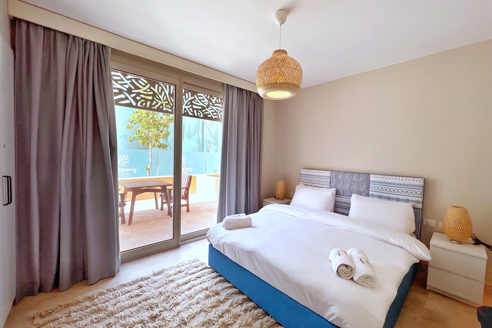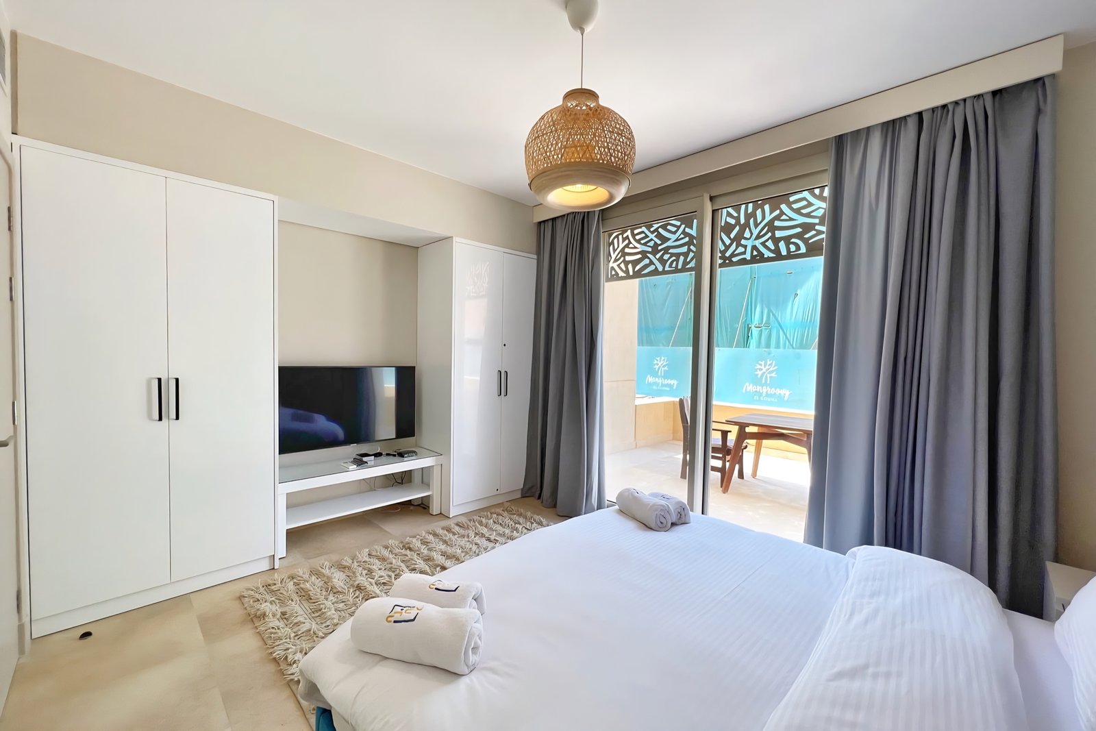 This waterfront 2 bedroom apartment is located in Gouna’s only beachfront residence – Mangroovy with a 24/7 free pool and beach access. Mangroovy is closest to the Marina (10 min walk). The 2 bed apartment comes with an open plan fully equipped kitchen, 2 full bathrooms with 1 ensuite and a living room with a large sofa not to mention a beautiful large terrance overlooking the pool. It also features a 65 inch smart TV with Airplay and cable channels in the living room and a TV in each bedroom as well. There is a washing machine, a Nespresso machine, kettle and a microwave. The apartment is great for couples & families. The styling is made with a functional approach to deliver a great relaxing vibe for the guests. Neighborhood: -Mangroovy residence is uniquely located 800 meters from Abu Tig Marina. Guests will be able to walk 10 minutes and get to it. -‘Bright Star’ supermarket is right in front of the residence towards the Marina. -Mangroovy is home to the famous ‘Zouni’ beach lounge (located at Mangroovy’s beach) – ‘The Smokery’, a local favorite is also located 450 meters from the residence. Transit: Free outdoor parking is available. Tuktuks are available to take you anywhere in El Gouna.