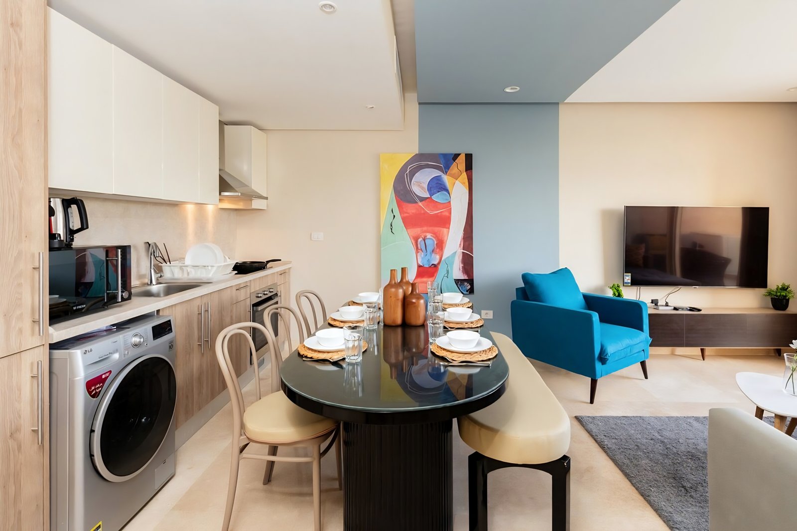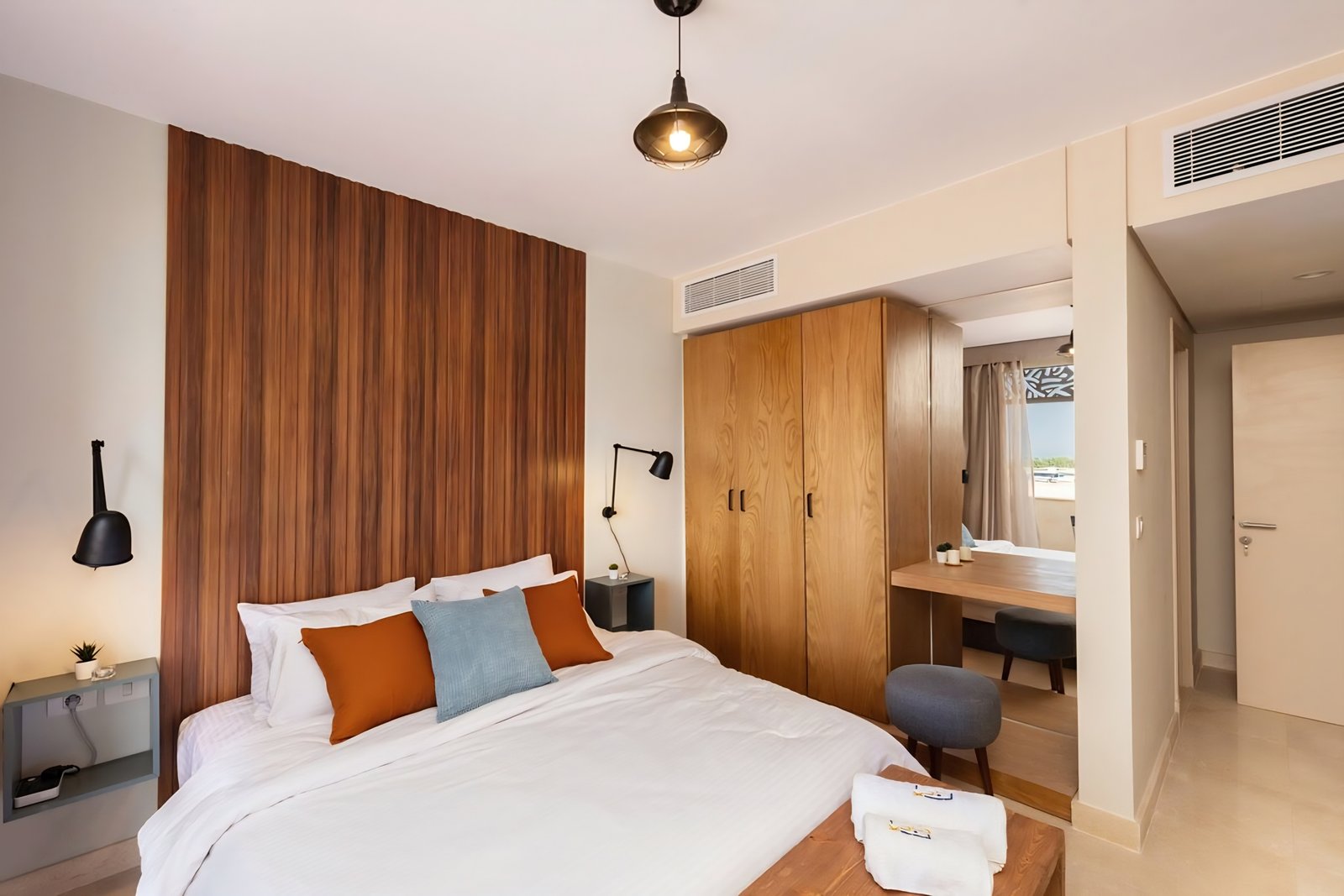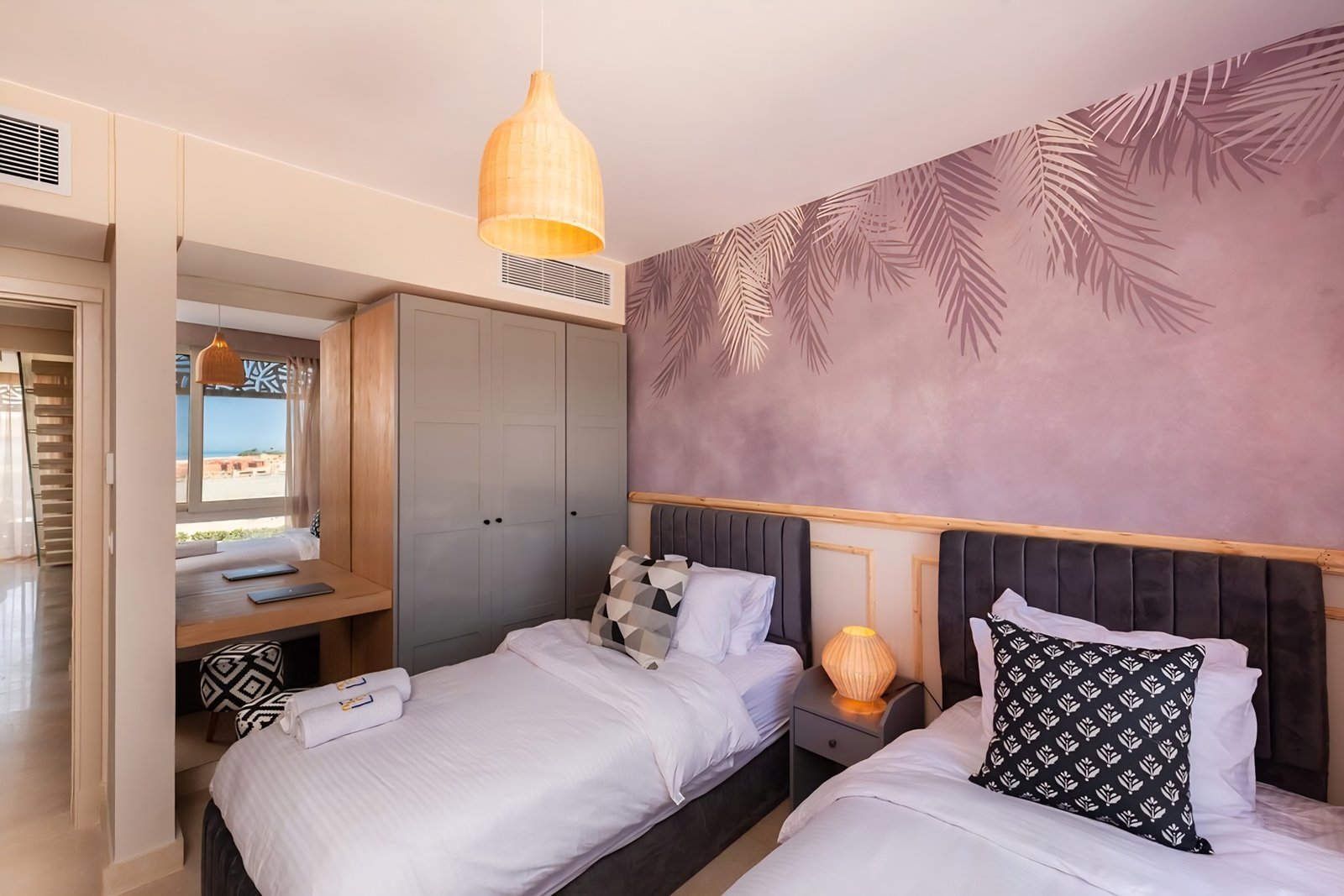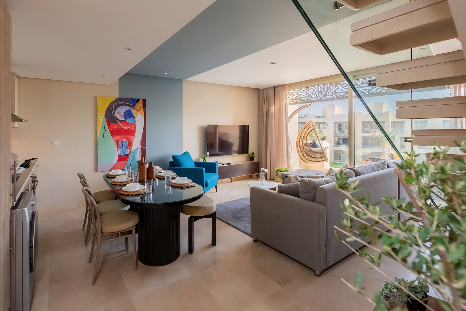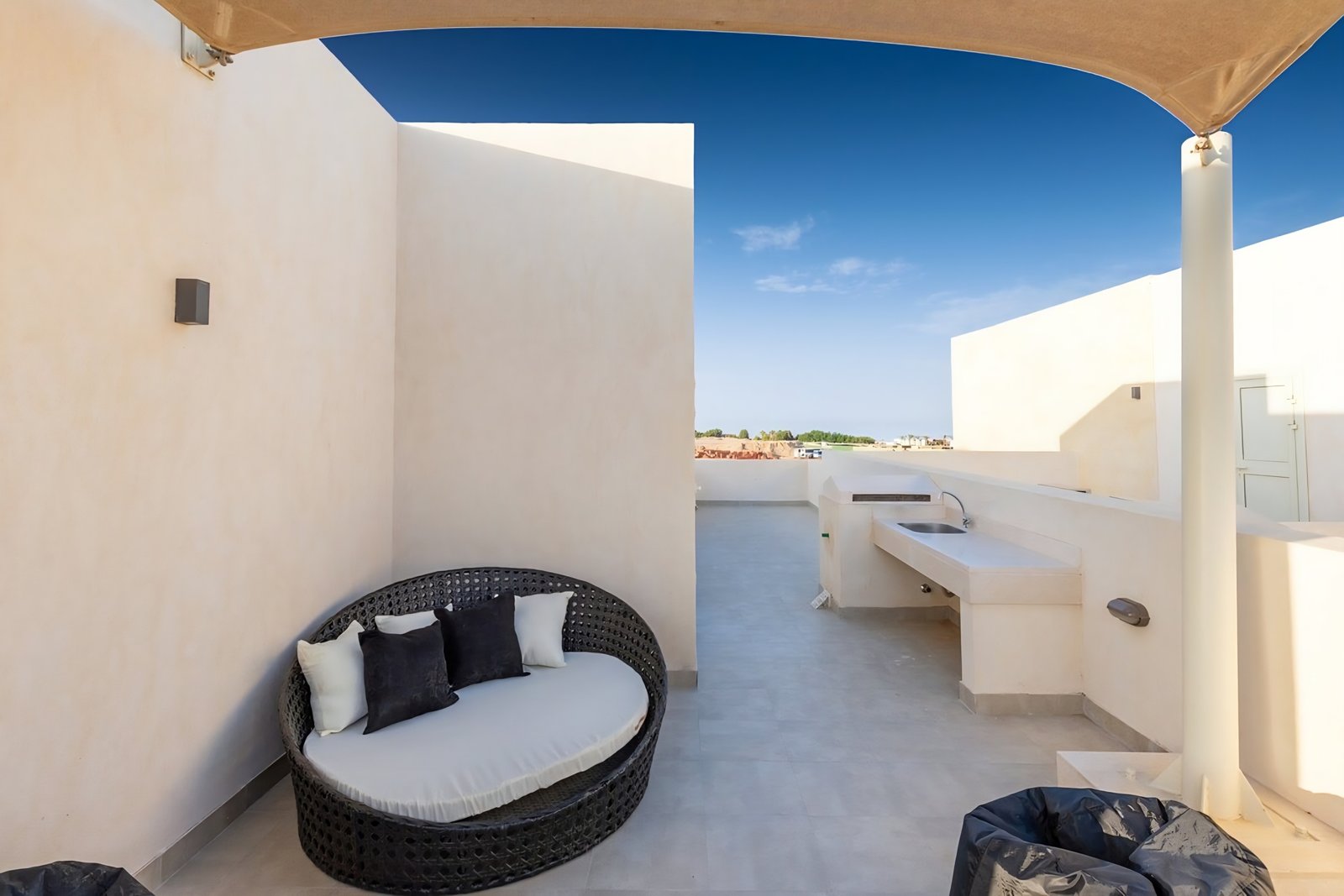 This untroubled 2 bedroom apartment is located in Gouna’s only beachfront residence – Mangroovy with a free pool and beach access. Mangroovy is closest to the Marina (10 min walk). The 2 bed apartment comes with an open plan fully equipped kitchen, 2 full bathrooms with 1 ensuite and a living room with a large sofa bed that can sleep 2 additional guest, not to mention a beautiful large balcony and a private rooftop overlooking the pool. It also features a 65 inch smart TV with Airplay and cable channels, washing machine, a Nespresso machine, kettle and a microwave. The apartment is great for couples & families. The styling is made with a modern and voguish approach to ensure guests have a wonderful and relaxing experience. Neighborhood: -Mangroovy residence is uniquely located 800 meters from Abu Tig Marina. Guests will be able to walk 10 minutes and get to it. -‘Bright Star’ supermarket is right in front of the residence towards the Marina. -Mangroovy is home to the famous ‘Zouni ‘ beach lounge (located at Mangroovy’s beach) – ‘The Smokery’, a local favorite is also located 450 meters from the residence. Transit: Free outdoor parking is available. Tuktuks are available to take you anywhere in El Gouna
