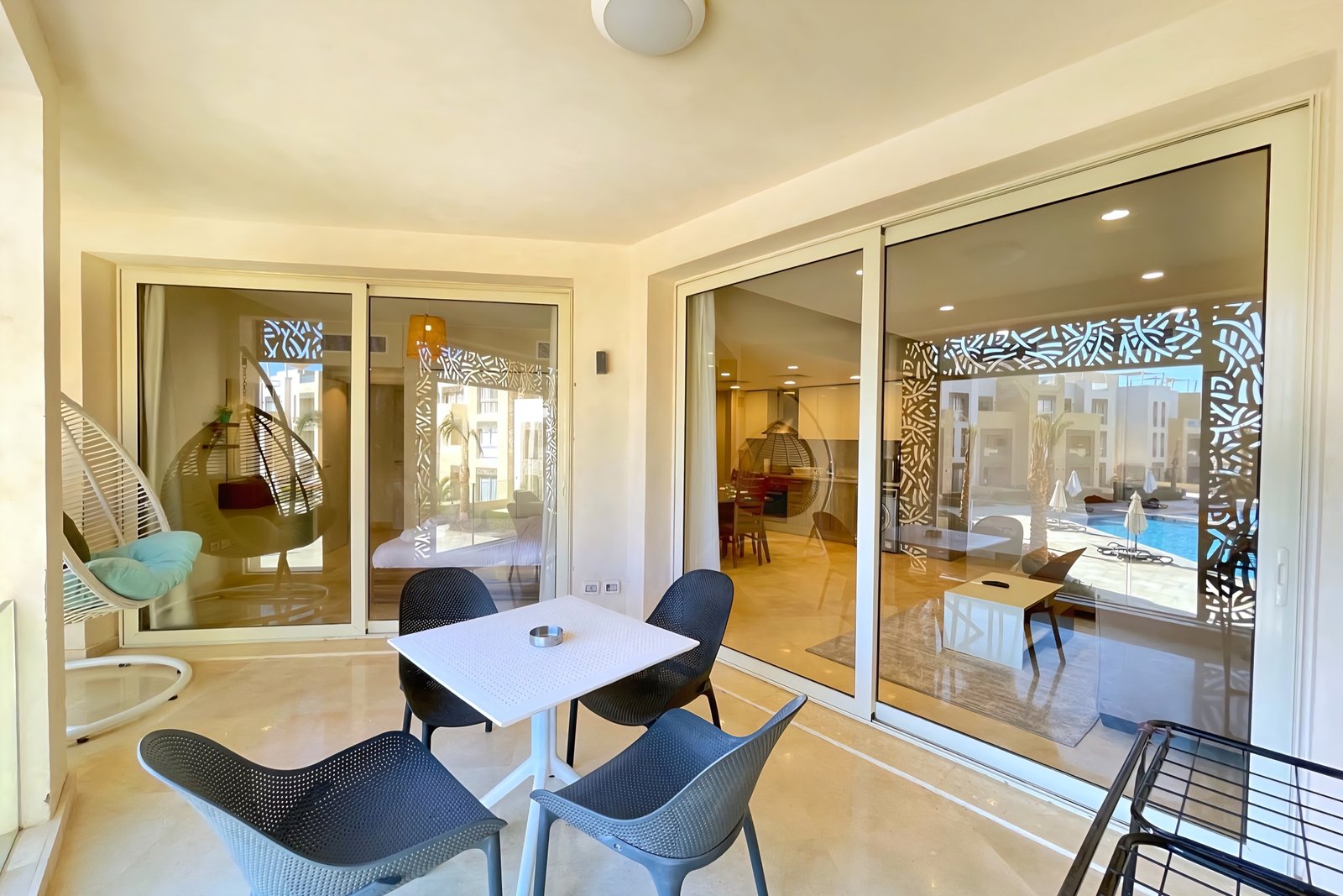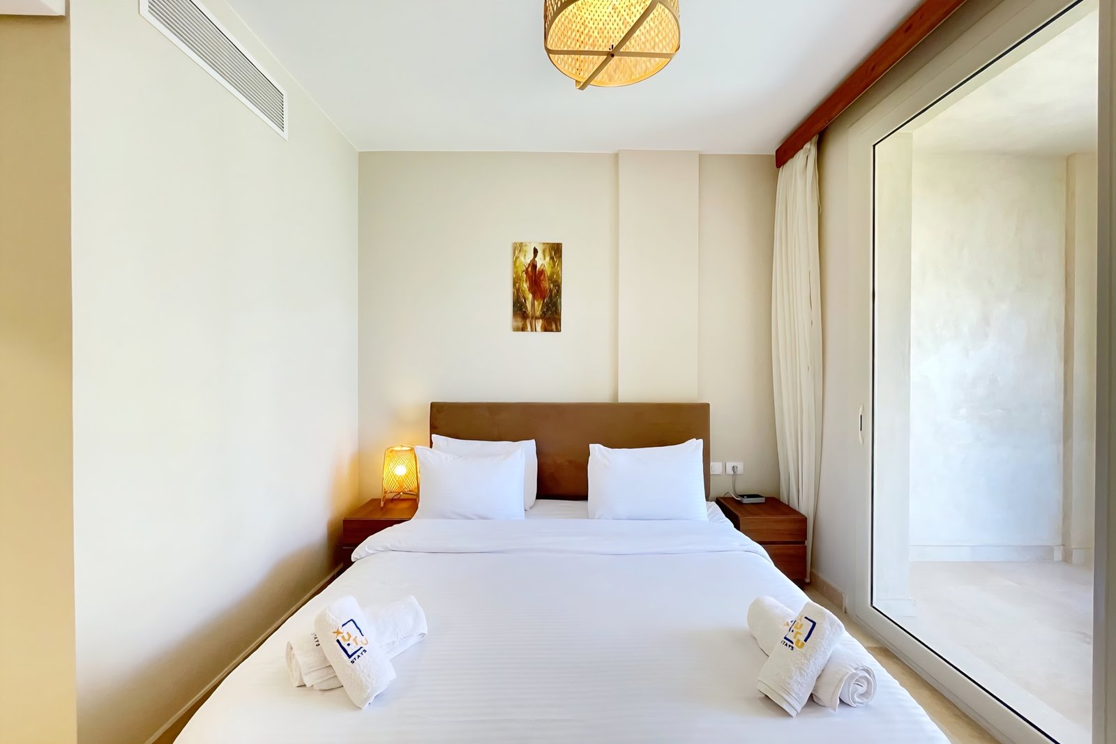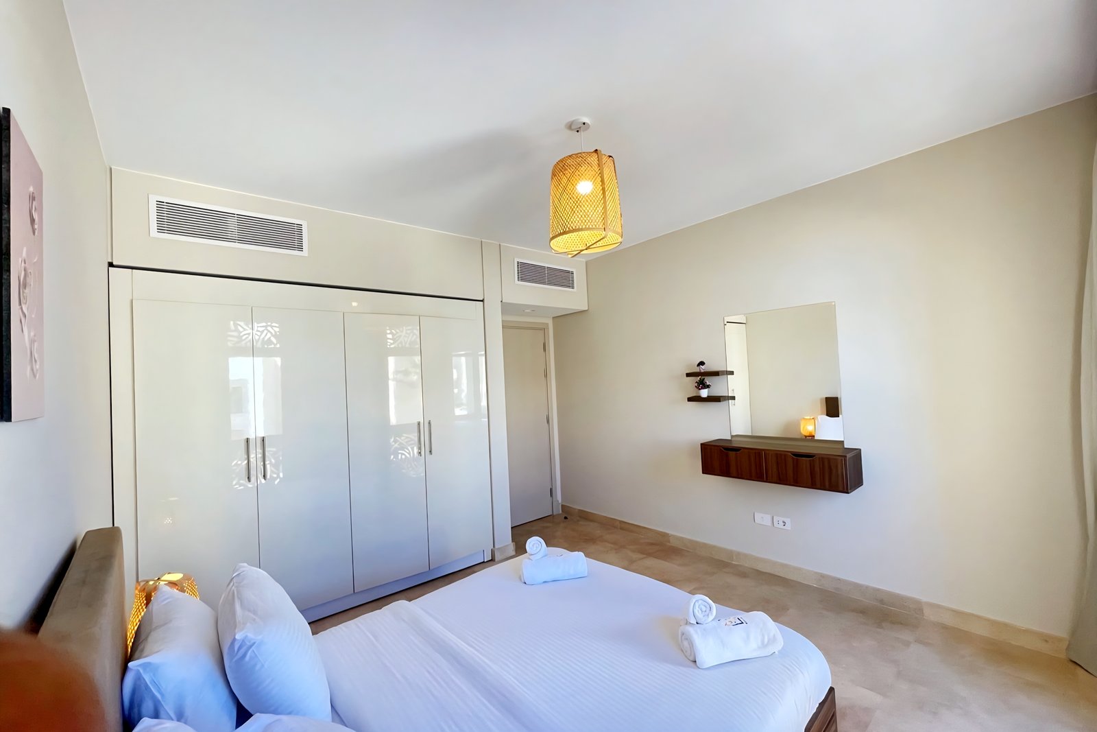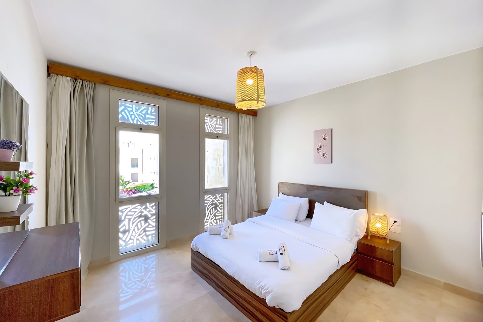 This prime 3 bedroom apartment is located in Gouna’s only beachfront residence – Mangroovy with free pool and beach access. Mangroovy is closest to the Marina (10 min walk). The 3 bedroom apartment comes with an open plan fully equipped kitchen, 2 full ensuite bathrooms with 1 guest bathroom. It also features a living room with a large sofa, not to mention a beautiful panoramic balcony overlooking the pool at cluster M7 which closest to the beach. It also features a 65 inch smart TV with Airplay and cable channels, washing machine, a Nespresso machine, kettle and a microwave. The apartment is great for couples & families. The styling is basic yet relaxing to ensure guests have a wonderful and serene experience. Neighborhood: -Mangroovy residence is uniquely located 800 meters from Abu Tig Marina. Guests will be able to walk 10 minutes and get to it. -‘Bright Star’ supermarket is right in front of the residence towards the Marina. -Mangroovy is home to ‘Zouni’ beach lounge (located at Mangroovy’s beach) – ‘The Smokery’, a local favorite is also located 450 meters from the residence. Transit: Free outdoor parking is available. Tuktuks are available to take you anywhere in El Gouna.