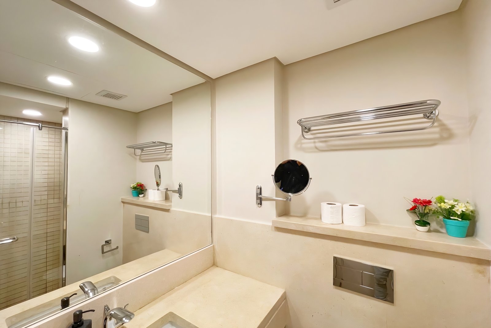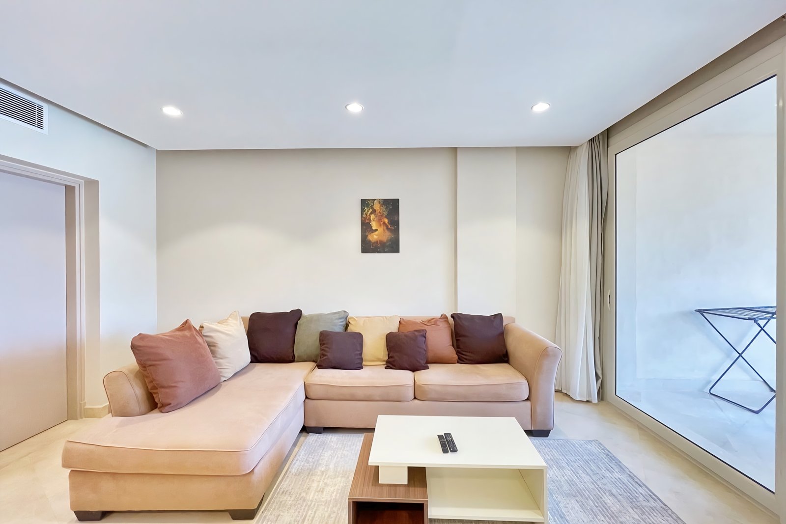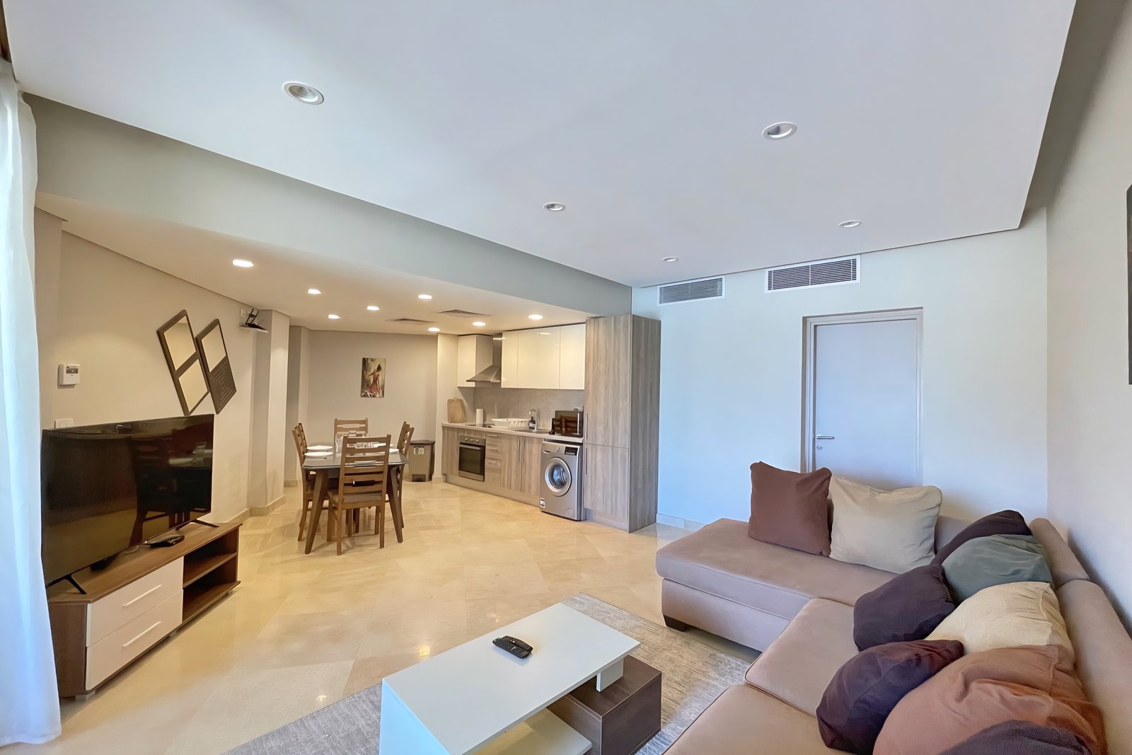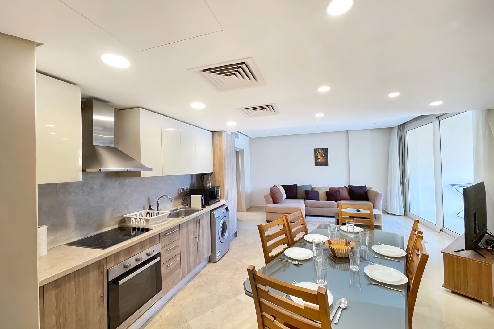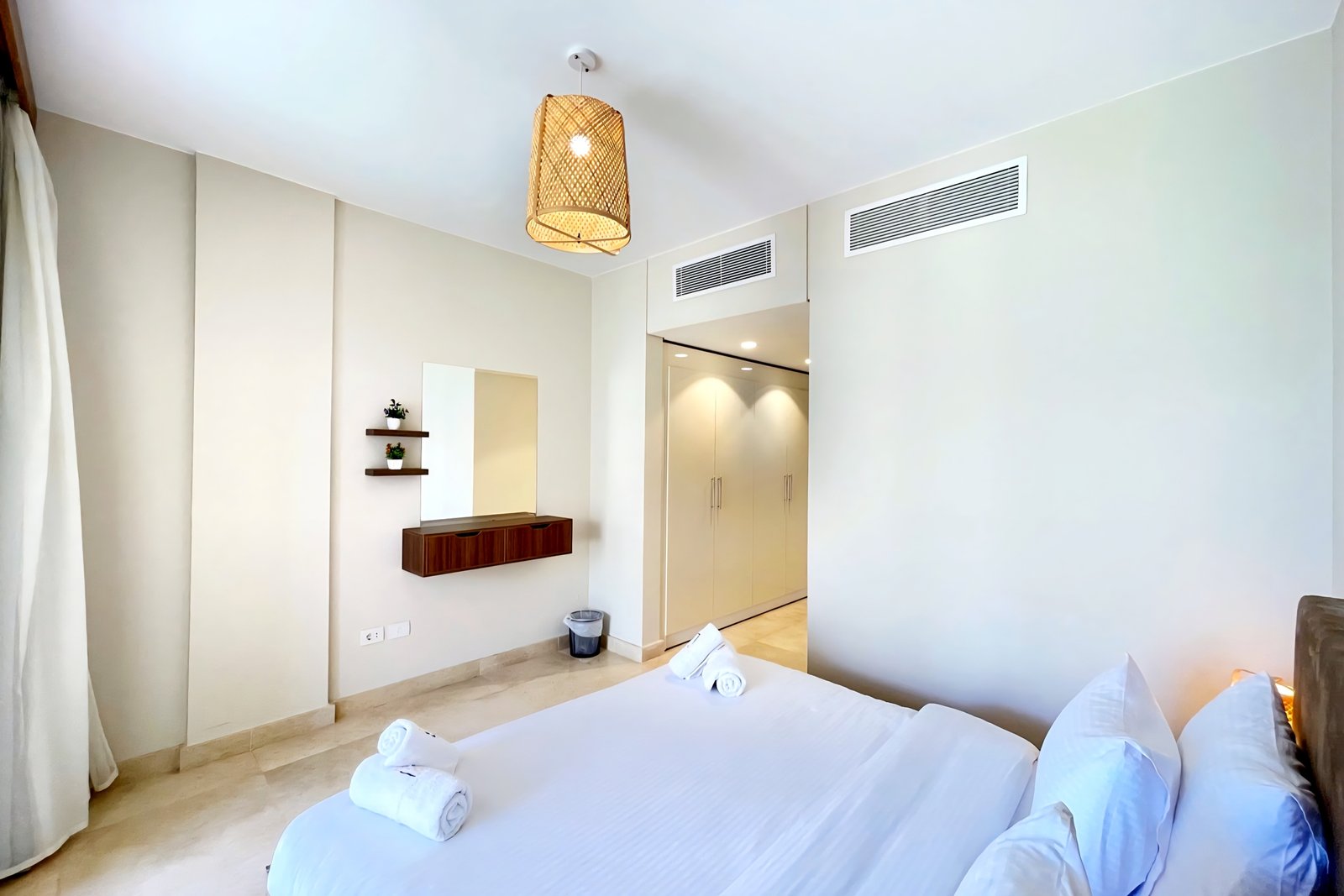 This prime 3 bedroom apartment is located in Gouna’s only beachfront residence – Mangroovy with free pool and beach access. Mangroovy is closest to the Marina (10 min walk). The 3 bedroom apartment comes with an open plan fully equipped kitchen, 2 full ensuite bathrooms with 1 guest bathroom. It also features a living room with a large sofa, not to mention a beautiful panoramic balcony overlooking the pool at cluster M7 which closest to the beach. It also features a 65 inch smart TV with Airplay and cable channels, washing machine, a Nespresso machine, kettle and a microwave. The apartment is great for couples & families. The styling is basic yet relaxing to ensure guests have a wonderful and serene experience. Neighborhood: -Mangroovy residence is uniquely located 800 meters from Abu Tig Marina. Guests will be able to walk 10 minutes and get to it. -‘Bright Star’ supermarket is right in front of the residence towards the Marina. -Mangroovy is home to ‘Zouni’ beach lounge (located at Mangroovy’s beach) – ‘The Smokery’, a local favorite is also located 450 meters from the residence. Transit: Free outdoor parking is available. Tuktuks are available to take you anywhere in El Gouna.