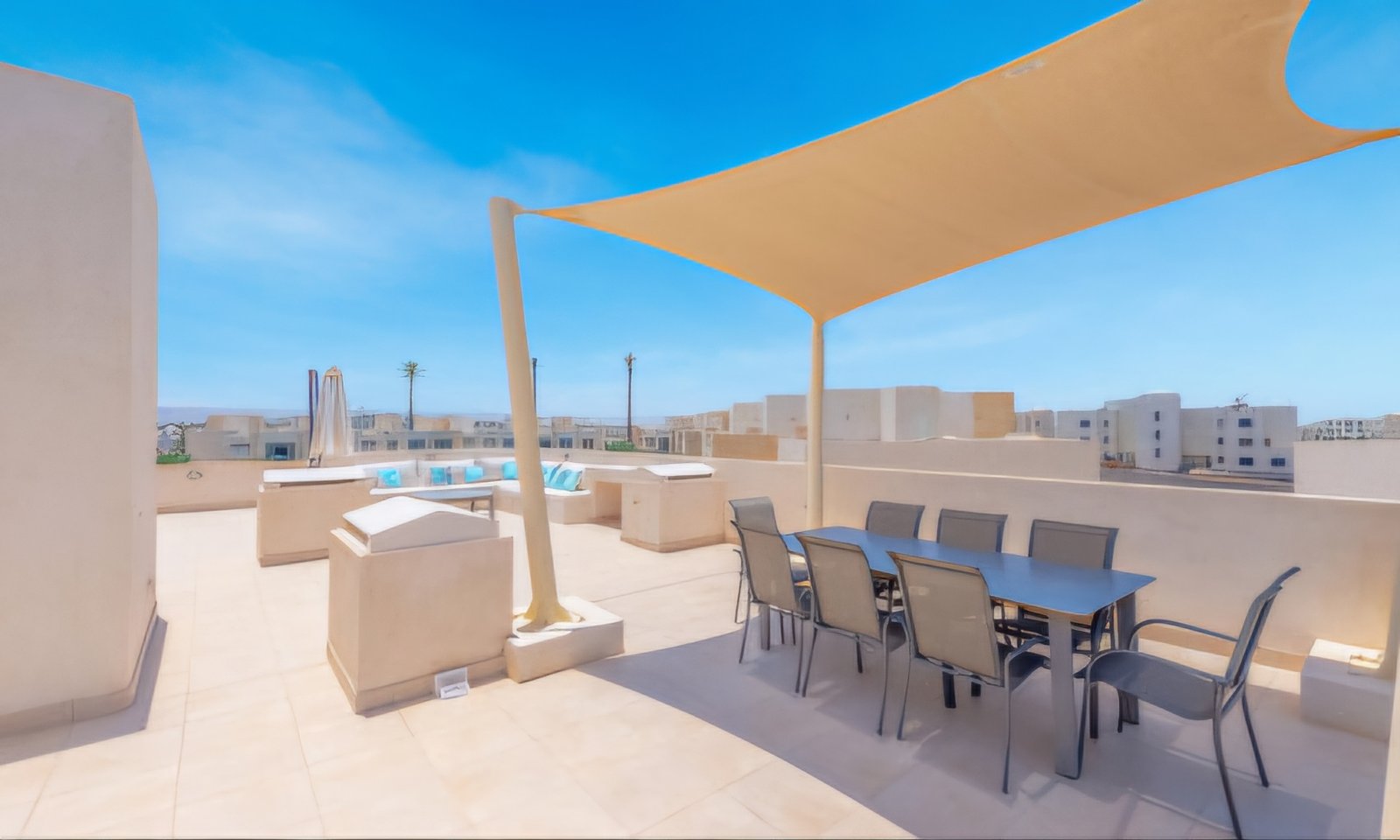 3-Bedroom apartment with an indoor staircase to the private rooftop terrace. Located in Mangroovy Residence, just by the Red Sea coast and Marina Abu Tig. Spacious and over basically equipped with an access to the shared Mangroovy pools is a perfect choice for families with children or friends serene retreat. ▶ 2nd Floor ▶ 2 Levels ▶ Private Rooftop Terrace (staircase inside the house) feat. outdoor kitchen, dining area, relaxation zone & top views ▶ 3 Bedrooms (2 x queen size, 1 x double sofa-bed) ▶ 3 Bathrooms with shower ▶ Stylish open-plan living room ▶ Guest toilet ▶ Seating area by the TV ▶ Smart TV ▶ Furnished balcony with pool view ▶ Over basically equipped kitchen: fridge & freezer, stove, oven, microwave, coffeemaker (nespresso), kettle… ▶ Large dining table ▶ Wi-Fi ▶ ACs ▶ Extra room for 1, “Nanny room” with private bathroom ▶ Washing machine ▶ Pool access ▶ Beach access ▶ Free parking The apartment is strategically located in Mangroovy Residence project: Distance to all main attractions: The Red Sea – less than 350m Closest kitesurfing centers – Red Sea Zone and KBC – approximately 250m Closest grocery shop – Bright Start Supermarket – approximately 250m Marina – less than 1km El Gouna’s Downtown – up to 7 minutes drive with car or a tuc-tuc.