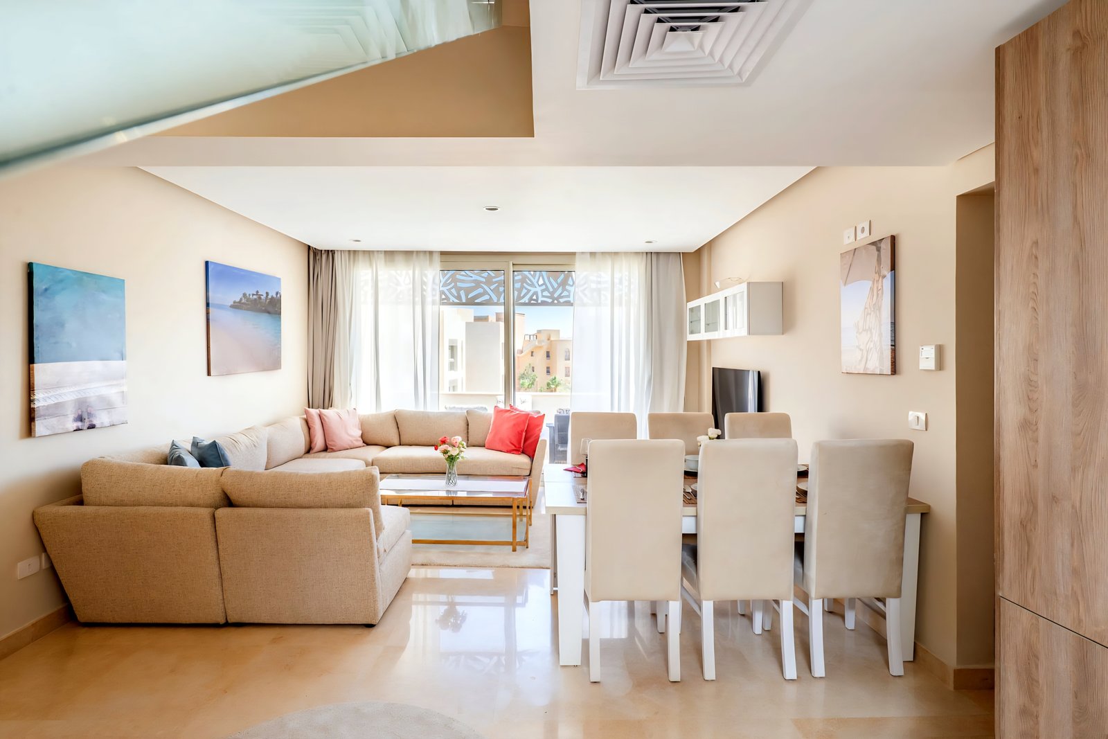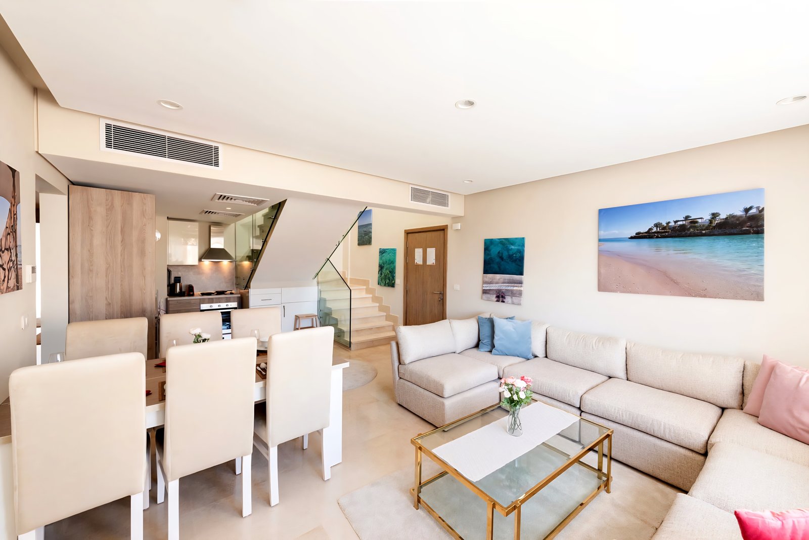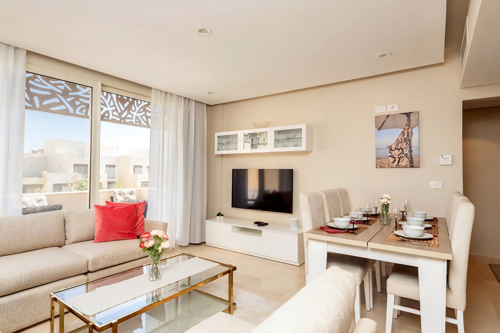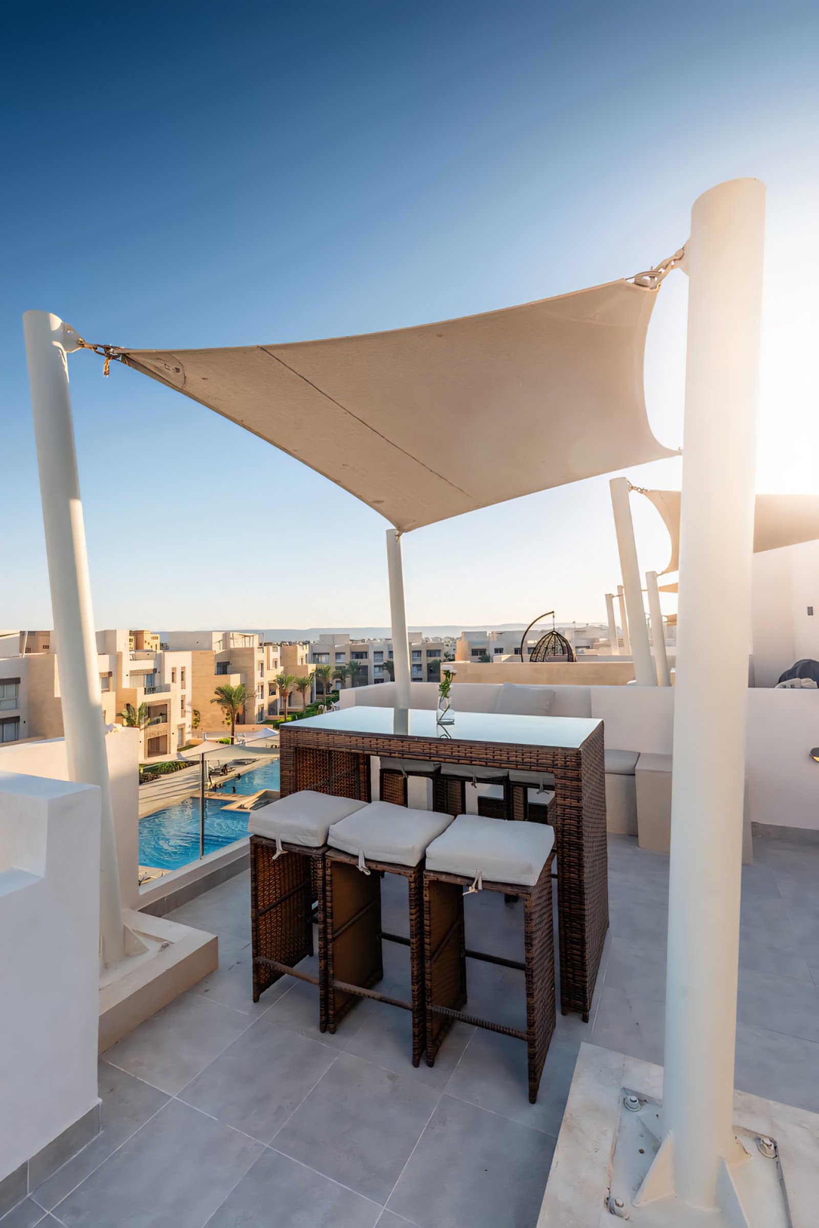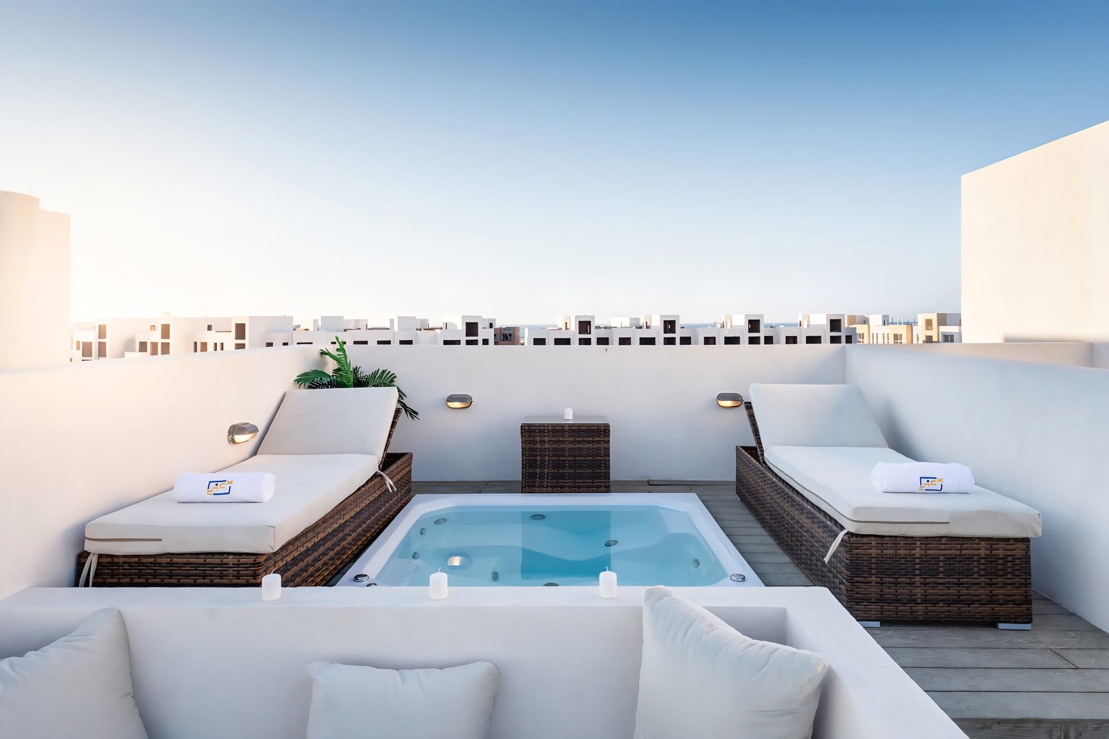 This posh & fancy 3 bedroom apartment is located in Gouna’s only beachfront residence – Mangroovy with a 24/7 free pool and beach access. Mangroovy is closest to the Marina (10 min walk). The apartment is on the 2nd floor overlooking the pool and features a private rooftop with a jacuzzi – perfect for sun bathing and enjoying a drink! It also features an open plan fully equipped kitchen, 2 full bathrooms and a living room. There is a 55 inch smart TV with Airplay and cable channels, washing machine, a Nespresso machine, kettle and a microwave. The apartment is great for groups & big families. The elegant styling of the apartment, makes it one of a kind within its community. Neighborhood: -Mangroovy residence is uniquely located 800 meters from Marina El Gouna. Guests will be able to walk 10 minutes and get to it. -‘Bright Star’ supermarket is right in front of the residence towards the Marina. -Mangroovy is home to the famous ‘Noi’ beach lounge (located at Mangroovy’s beach) – ‘The Smokery’, a local favorite is also located 450 meters from the residence. Transit: Free outdoor parking is available. Tuktuks are available to take you anywhere in El Gouna