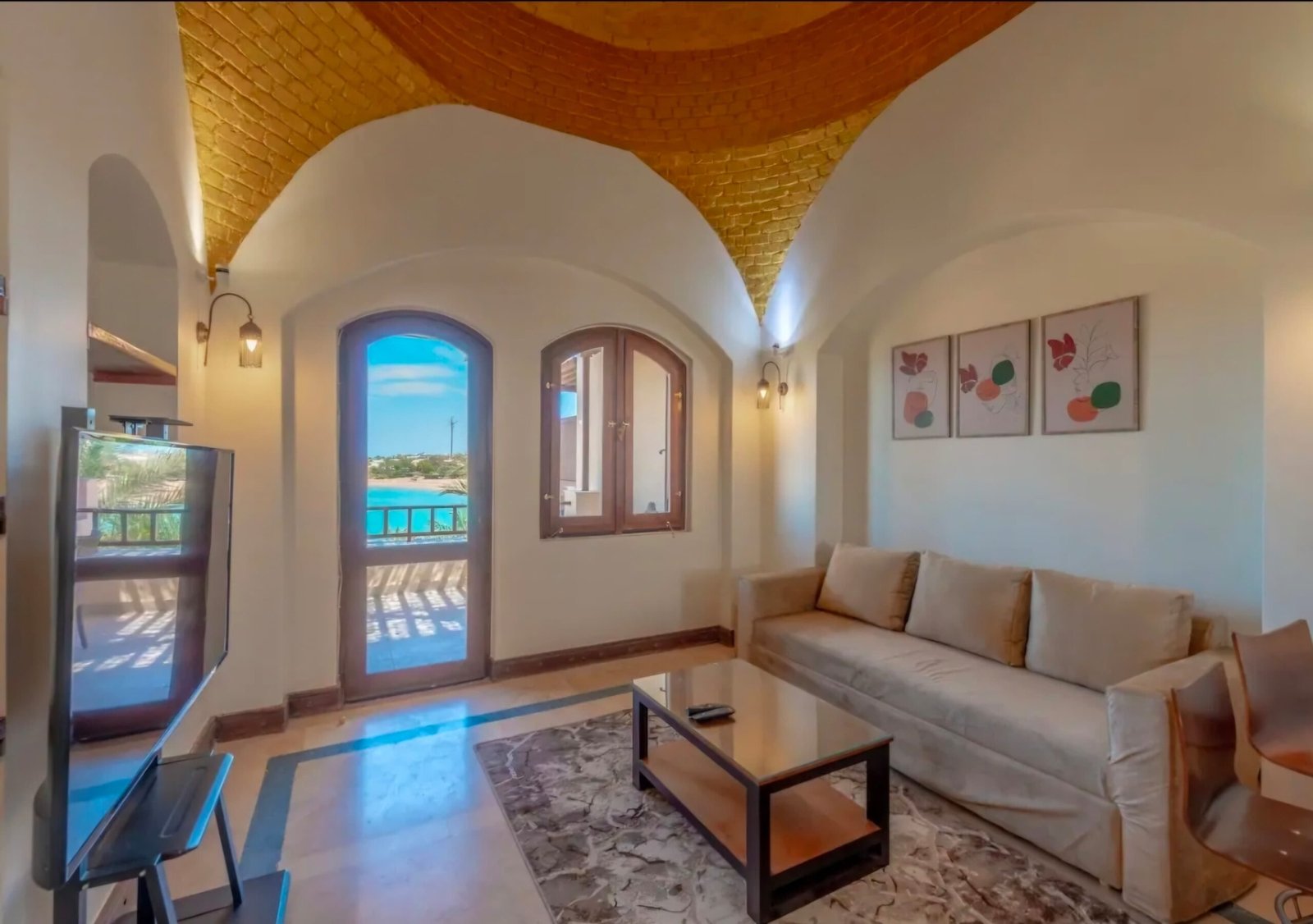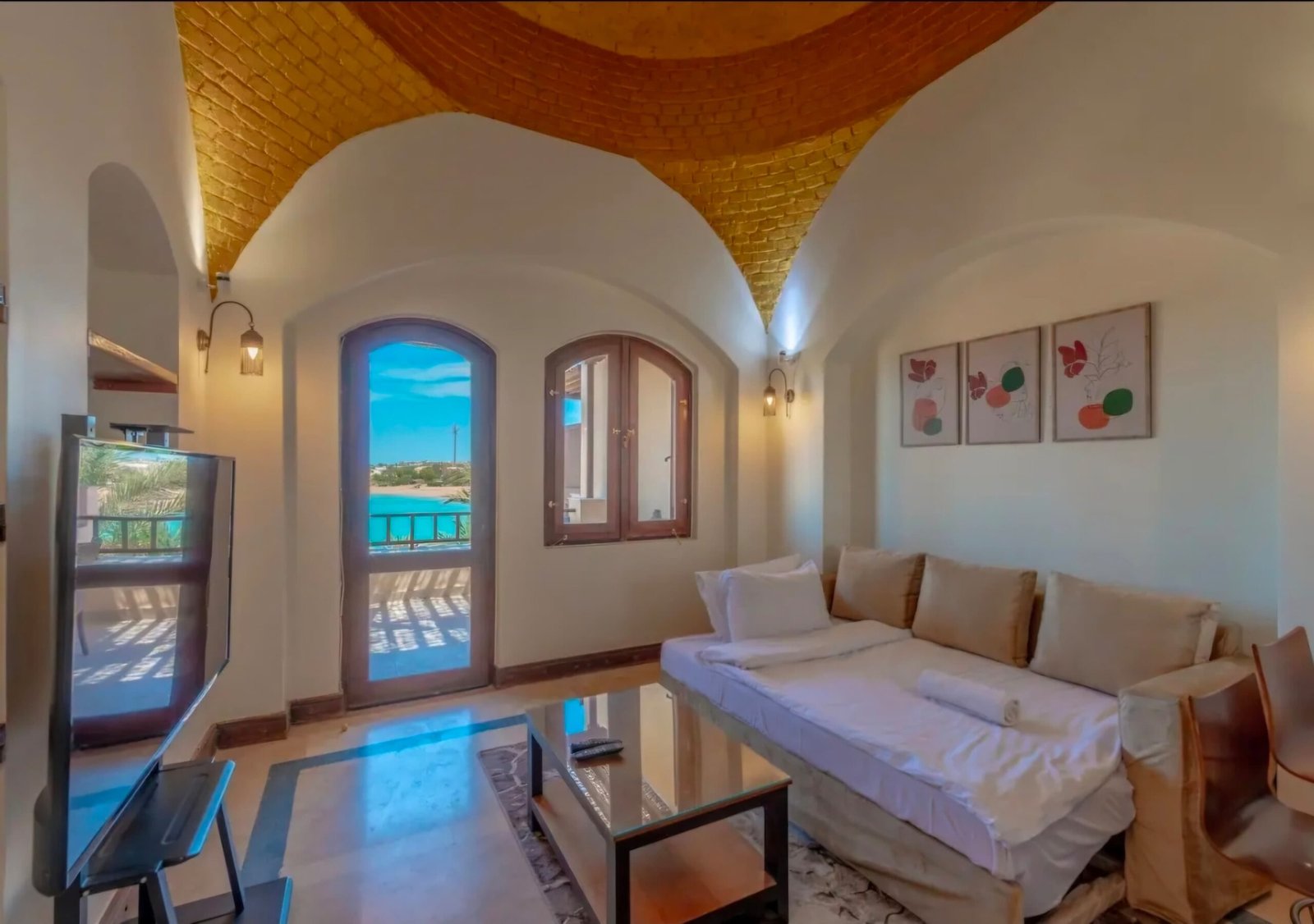 Located in the heart of El Gouna comfortable accommodation for a couple or single travelers. Directly facing the lagoon and mountains provides stunning views and top sunset experiences. Apartment consists of a stylish, high-ceiling living room with a sofa-bed and kitchen connected with a bar, queen-size bed bedroom, hallway with wardrobes and bathroom with a shower. There is also a private balcony with furniture and top views. High-ceilings, lighting, decor and Nubian style accents make it a truly unique place. Sofa in the living room extends into a single bed. Free street parking is at your disposal. Offer includes unlimited access to the swimmable lagoon.