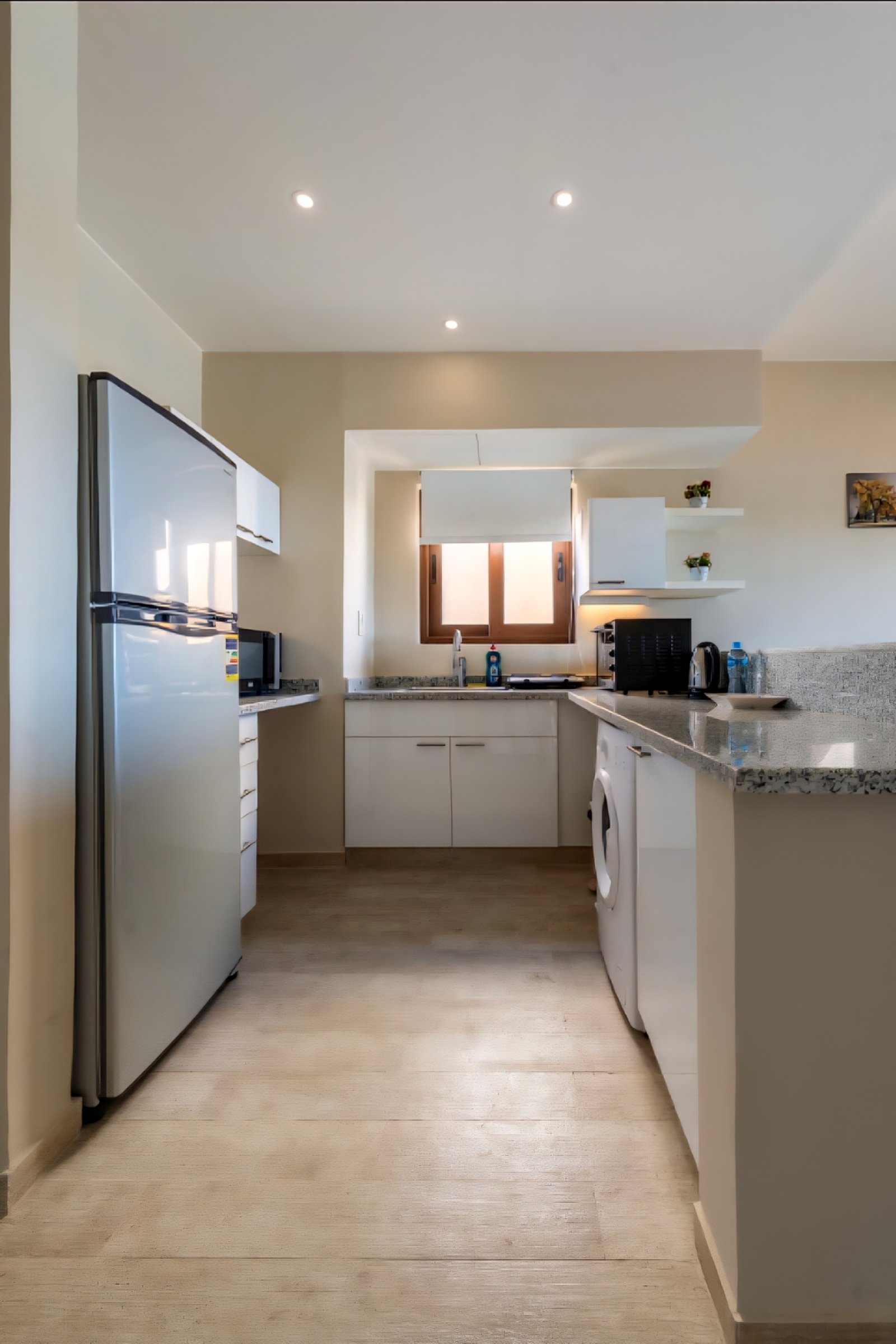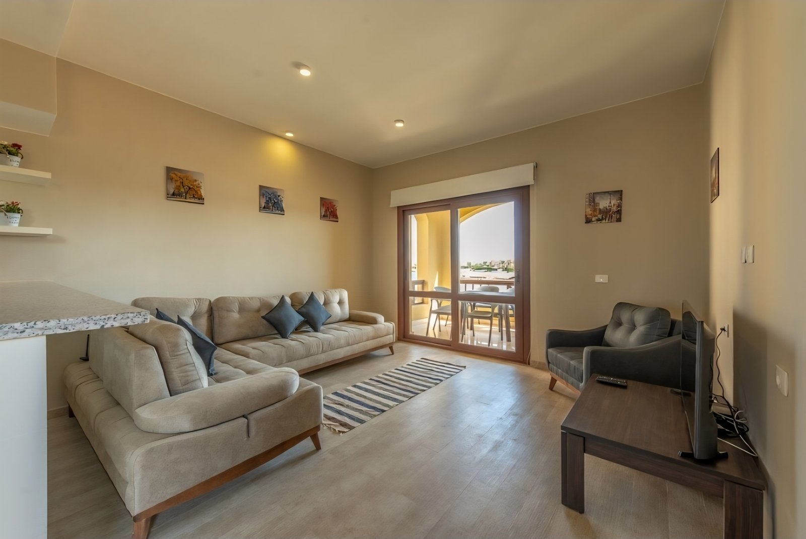 Sabina, El Gouna. A very fresh theme that comes with an access to the main pool. Guests enjoy our hotel services of housekeeping every 2 days, room service, Netflix and free Wi-Fi. Apartment Specs: 1BR, 1 Bathroom, Full Kitchen, Reception. Amenities: – Shared Pool – Housekeeping every 2 days – Wi-Fi (10GB max per day) – Netflix, AC, Private Parking