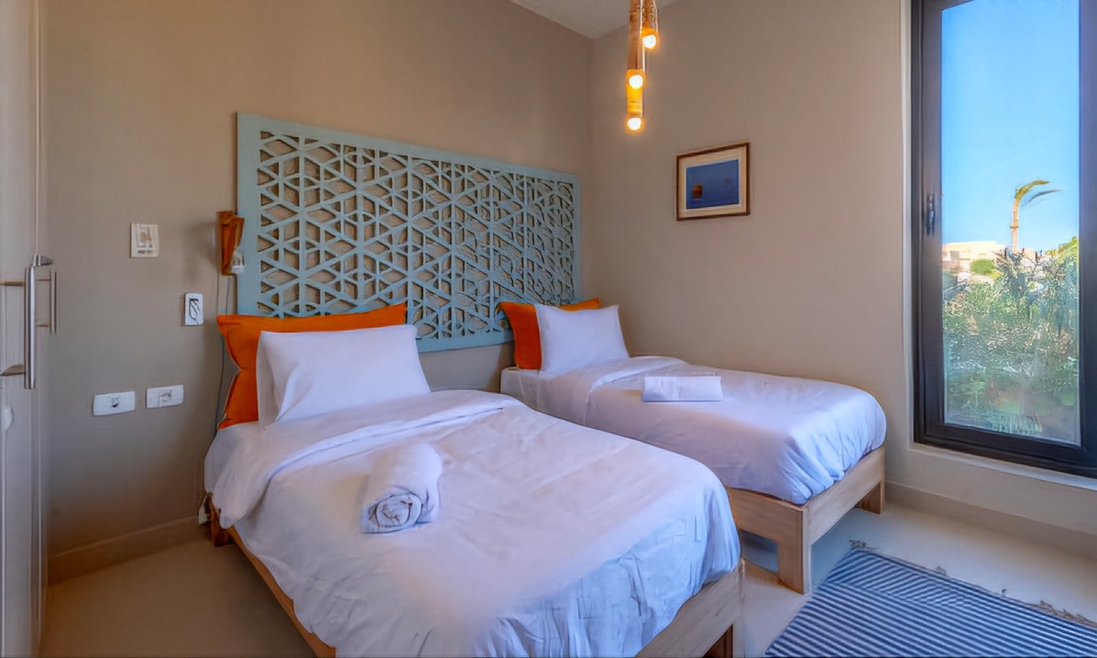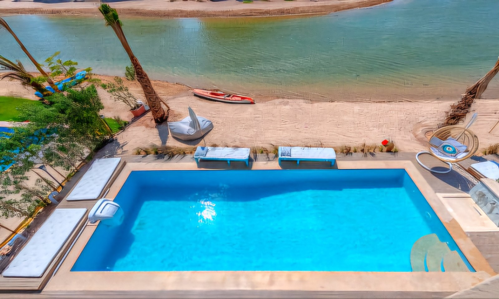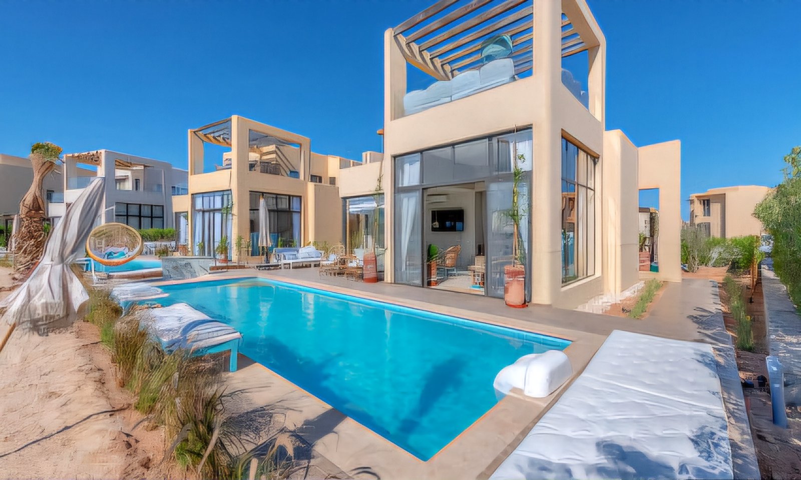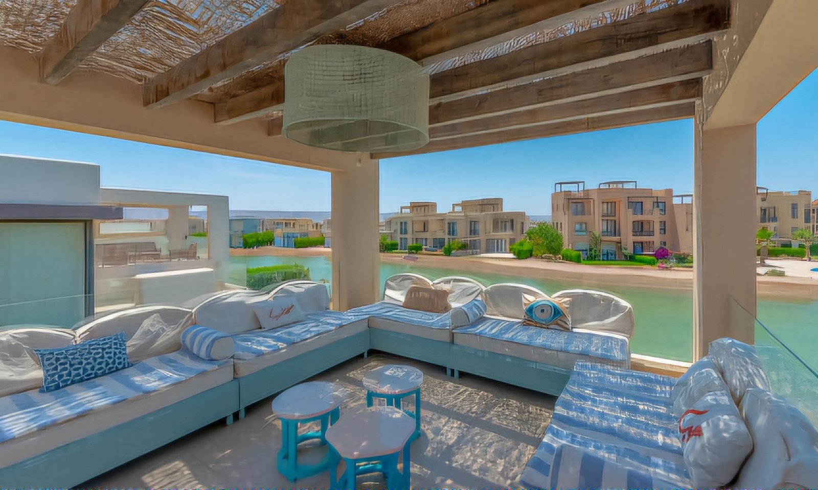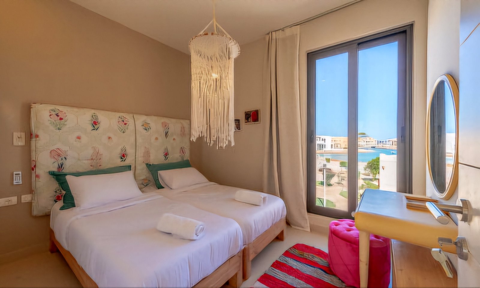 Enjoy your home on island in this new modern villa featuring 4 bedrooms, own heated pool, private lagoon waterfront, and breathtaking views. A serene surrounding and luxurious amenities to offer you a charming beach house in a peaceful cul-de-sac. Outdoor features you’ll enjoy: • Above standard private heated swimming pool (10m X 4m). • Patio kitchen for meals and drinks alfresco with electric grill, hob, and a mini fridge. • Your own sandy lagoon waterfront. • Outdoor wooden deck with seating, swing, and chaise lounge. Interior amenities you’ll love: • Modern open plan and large glazed area with abundant sunlight and airy ambiance. • Santorini rooftop lounge with stunning views for you and friends. • Banquette dining table for everyone at the same time with a living area that opens directly to pool and lagoon. • Kitchen and laundry top-notch appliances and ironing needs. • Master bedroom with ensuite, private terrace overlooking lagoon, and a swing to enjoy the scenery. • Total of 4 bedrooms (2 on each floor) and 3 bathrooms with showers. Comfort Facilities • Smart TV with Netflix and Orange triple play channels. • Free Wi-Fi. • Kitchenware, culinary, and essentials for coffee/tea. • Smoke detectors and fire extinguisher. • Possible extra nanny/driver room with shower, and A/C. • One complimentary housekeeping service for stays of 7 nights or more. • Towels provided at check-in. • Pool cleaning and outdoor sand shower. About Surroundings • Central location in Gouna’s well-desired Tawila compound (island 3) near the Marina and Downtown. Tawila has three islands that are connected by lagoons. • Close distance to Gourmet Supermarket. • The space is perfect for family, couples, and group of friends and accommodates up to 8 guests.