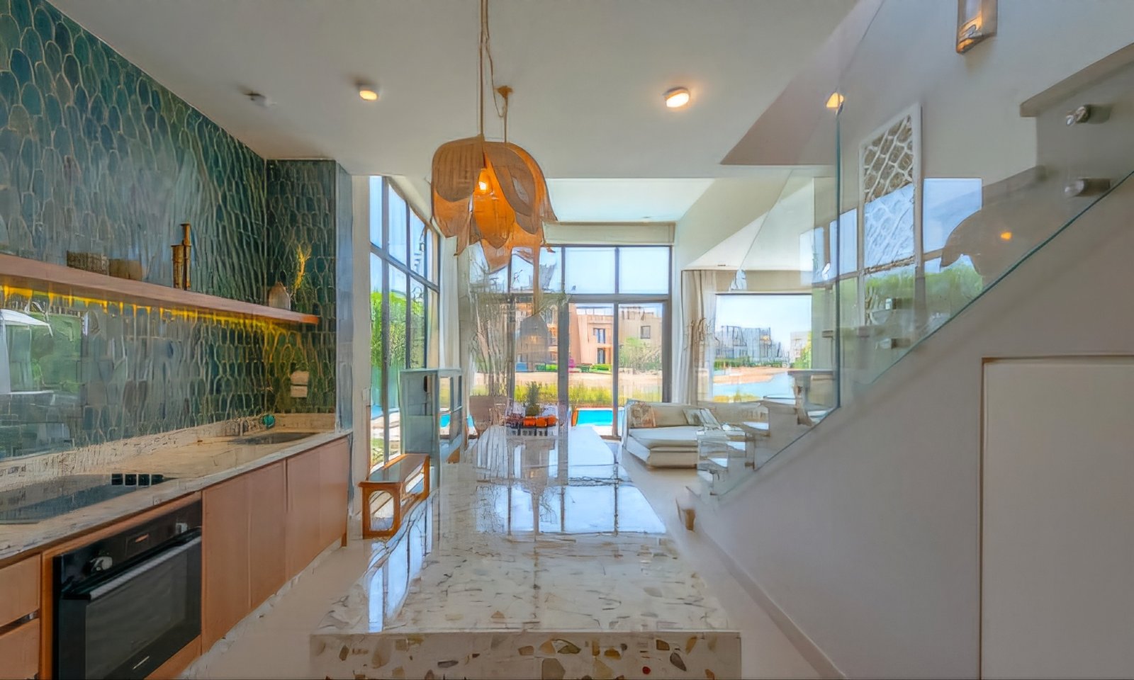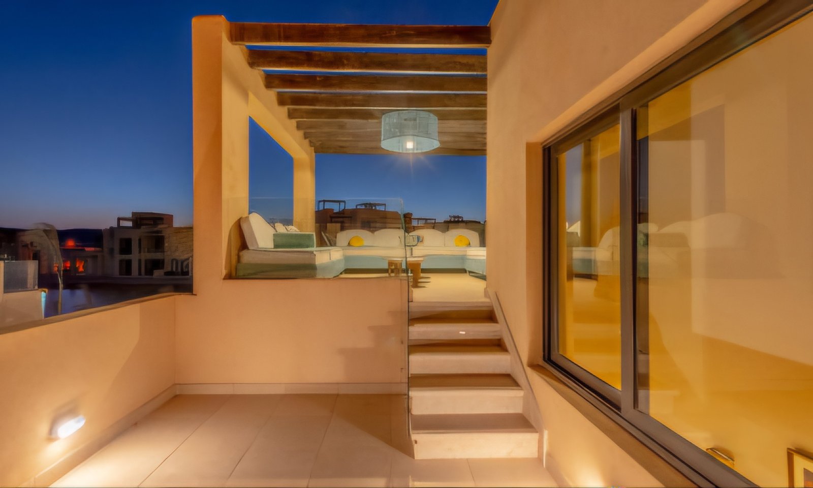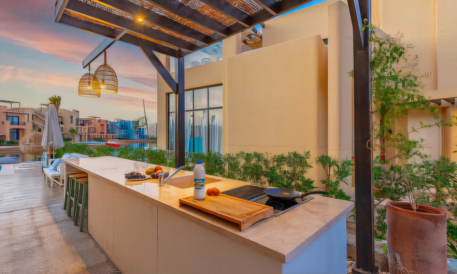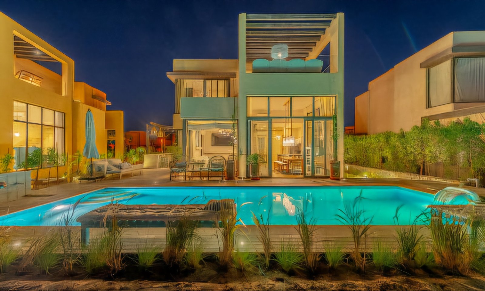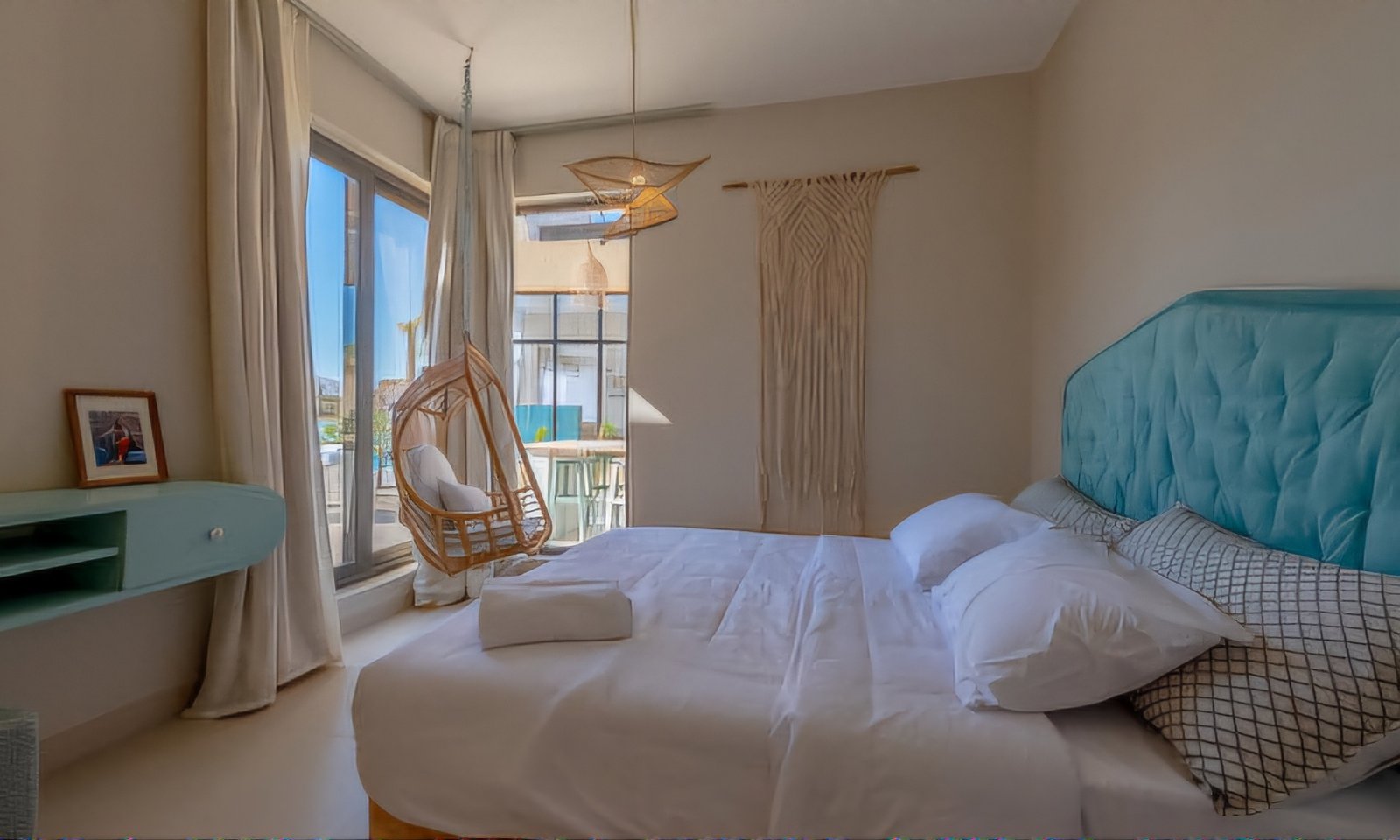 Enjoy your home on island in this new modern villa featuring 4 bedrooms, own heated pool, private lagoon waterfront, and breathtaking views. A serene surrounding and luxurious amenities to offer you a charming beach house in a peaceful cul-de-sac. Outdoor features you’ll enjoy: • Above standard private heated swimming pool (10m X 4m). • Patio kitchen for meals and drinks alfresco with electric grill, hob, and a mini fridge. • Your own sandy lagoon waterfront. • Outdoor wooden deck with seating, swing, and chaise lounge. Interior amenities you’ll love: • Modern open plan and large glazed area with abundant sunlight and airy ambiance. • Santorini rooftop lounge with stunning views for you and friends. • Banquette dining table for everyone at the same time with a living area that opens directly to pool and lagoon. • Kitchen and laundry top-notch appliances and ironing needs. • Master bedroom with ensuite, private terrace overlooking lagoon, and a swing to enjoy the scenery. • Total of 4 bedrooms (2 on each floor) and 3 bathrooms with showers. Comfort Facilities • Smart TV with Netflix and Orange triple play channels. • Free Wi-Fi. • Kitchenware, culinary, and essentials for coffee/tea. • Smoke detectors and fire extinguisher. • Possible extra nanny/driver room with shower, and A/C. • One complimentary housekeeping service for stays of 7 nights or more. • Towels provided at check-in. • Pool cleaning and outdoor sand shower. About Surroundings • Central location in Gouna’s well-desired Tawila compound (island 3) near the Marina and Downtown. Tawila has three islands that are connected by lagoons. • Close distance to Gourmet Supermarket. • The space is perfect for family, couples, and group of friends and accommodates up to 8 guests.