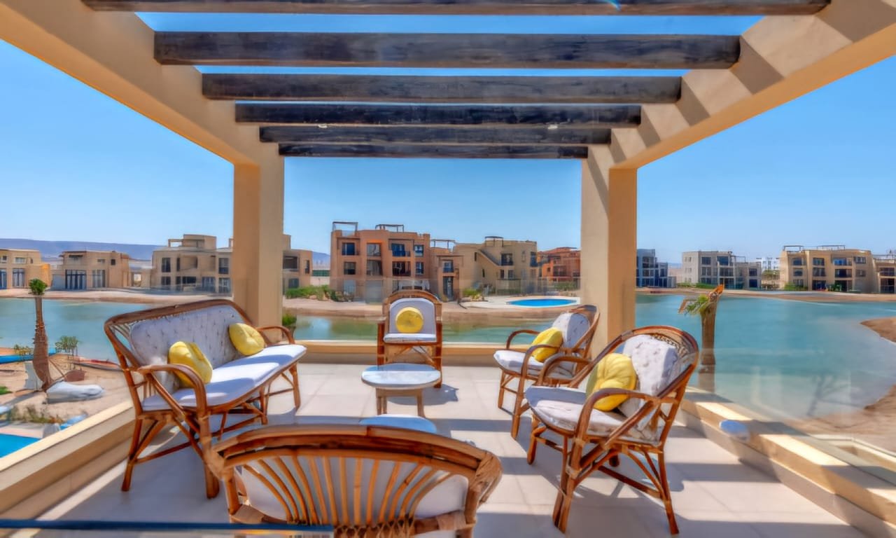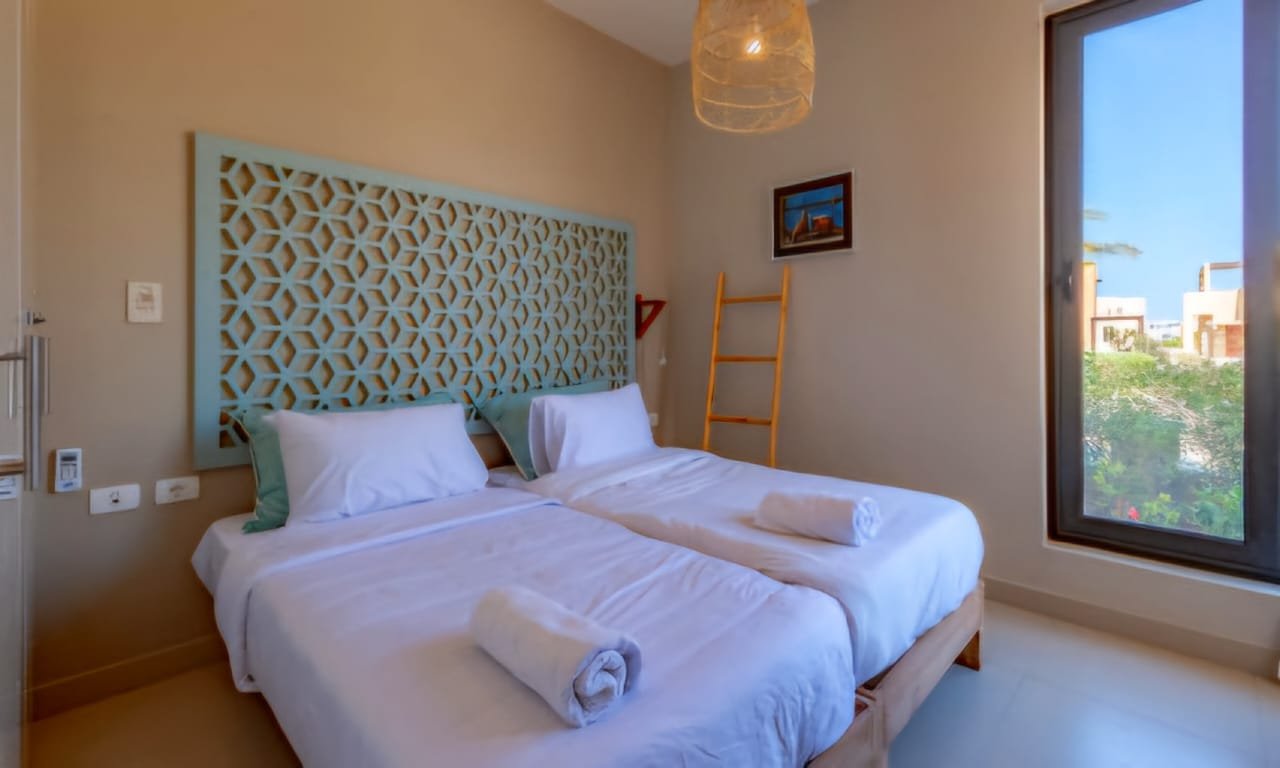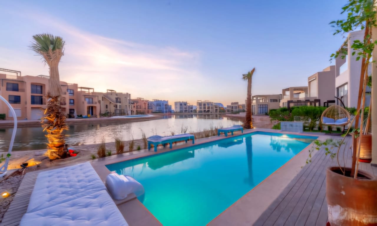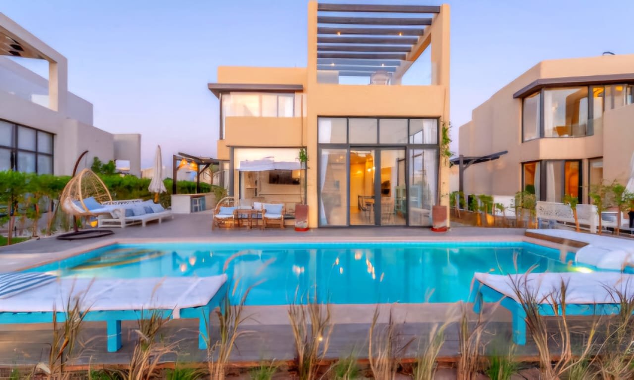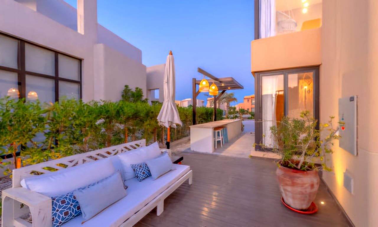 This ultra modern villa in Tawila offers 4 bedrooms, private heated pool, and breathtaking lagoon views. Every detail was carefully thought of to create the perfect vibes for an unmatched beach house. La Casa de Playa offers unrivaled amenities to ensure guests will enjoy a memorable stay: – An above standard private swimming pool (10m x 4m) with brand new heater, – Outdoor bar and entertaining area ideal for a gathering over a meal or drinks. The area is equipped with a high end grill, hob, and a mini-bar, – A landscaping designed by an international architect including a wooden deck leveled to the interiors with palm trees and modern lighting system to create the perfect sunset scenery, – The interior is designed and inspired to create an unforgettable stay. It comes with locally handcrafted pieces (vitrines, banquettes, chaises longues…) and modern art work from young and talented Egyptian artists, – Rooftop terrace with fancy lounge offering marvelous lagoon views, – Kitchen fully equipped with high end electrical appliances, – 4 Bedrooms, 3 bathrooms + extra guest room with bathroom – Capable to accommodate up to 8 guests