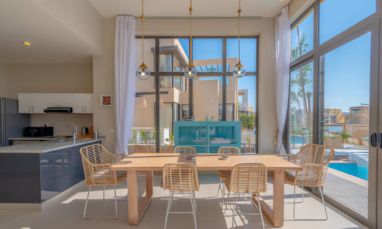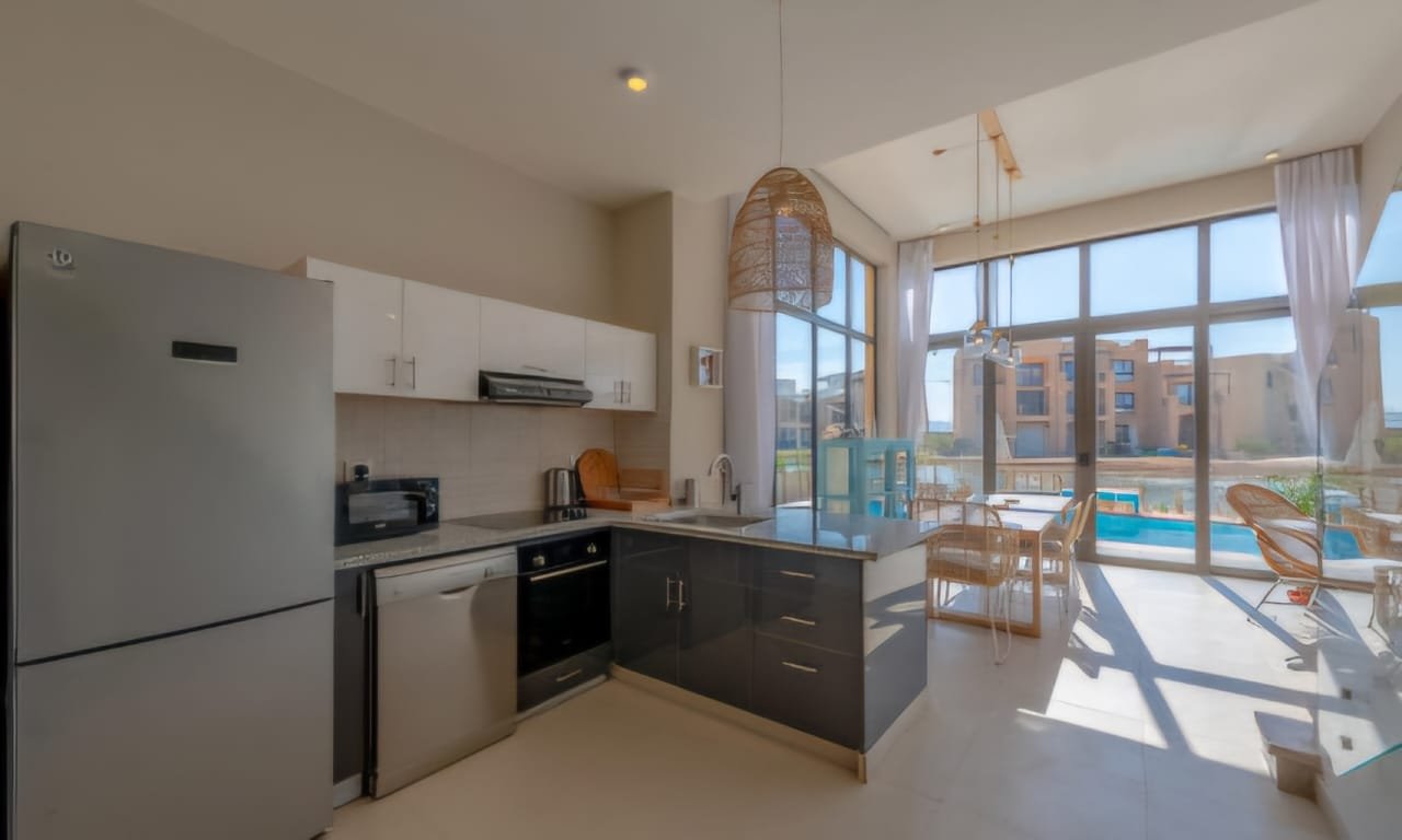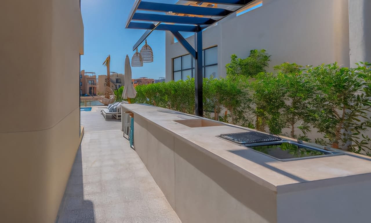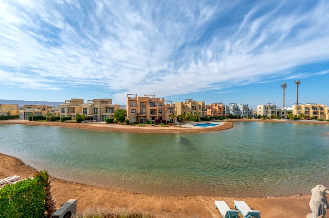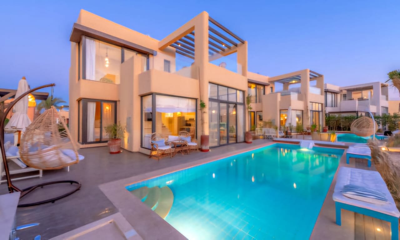 This ultra modern villa in Tawila offers 4 bedrooms, private heated pool, and breathtaking lagoon views. Every detail was carefully thought of to create the perfect vibes for an unmatched beach house. La Casa de Playa offers unrivaled amenities to ensure guests will enjoy a memorable stay: – An above standard private swimming pool (10m x 4m) with brand new heater, – Outdoor bar and entertaining area ideal for a gathering over a meal or drinks. The area is equipped with a high end grill, hob, and a mini-bar, – A landscaping designed by an international architect including a wooden deck leveled to the interiors with palm trees and modern lighting system to create the perfect sunset scenery, – The interior is designed and inspired to create an unforgettable stay. It comes with locally handcrafted pieces (vitrines, banquettes, chaises longues…) and modern art work from young and talented Egyptian artists, – Rooftop terrace with fancy lounge offering marvelous lagoon views, – Kitchen fully equipped with high end electrical appliances, – 4 Bedrooms, 3 bathrooms + extra guest room with bathroom – Capable to accommodate up to 8 guests