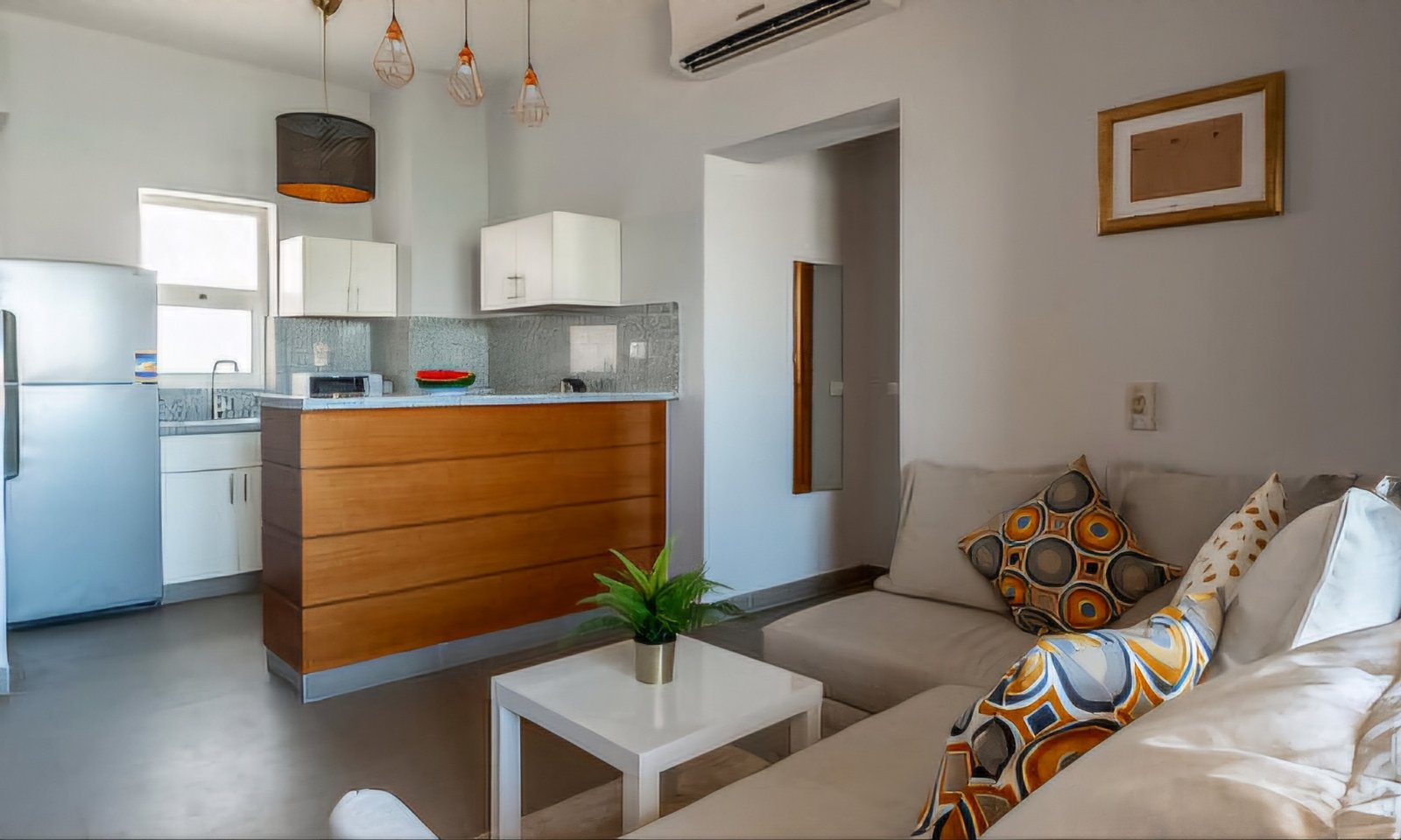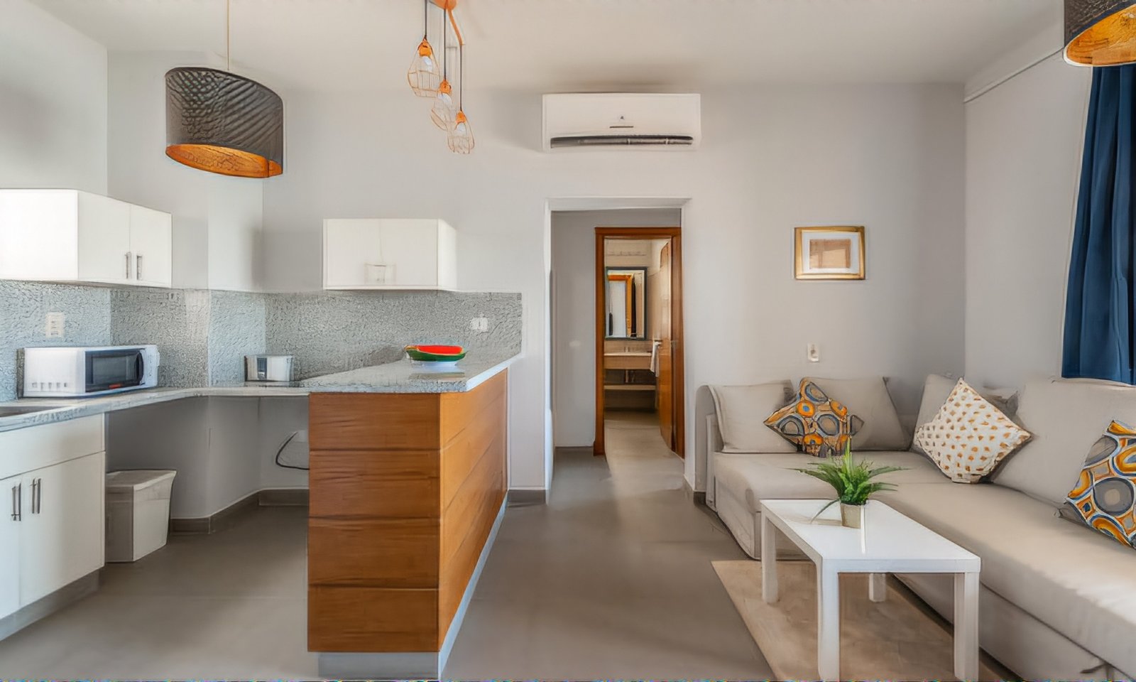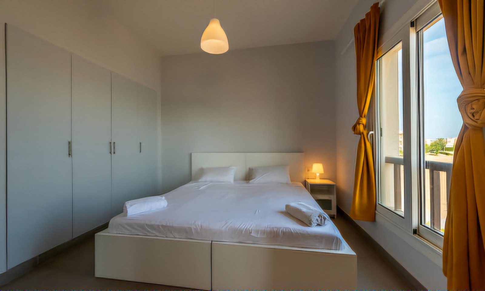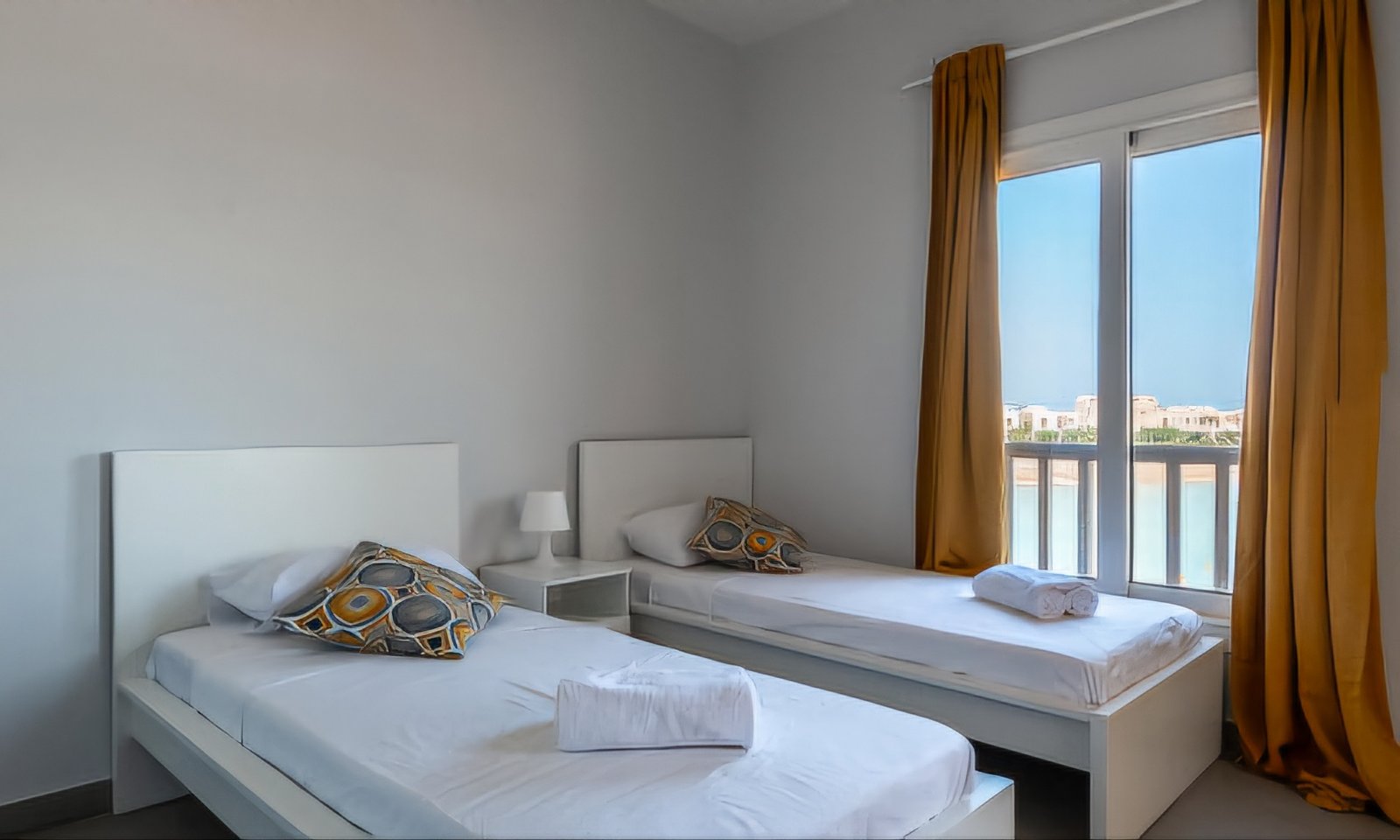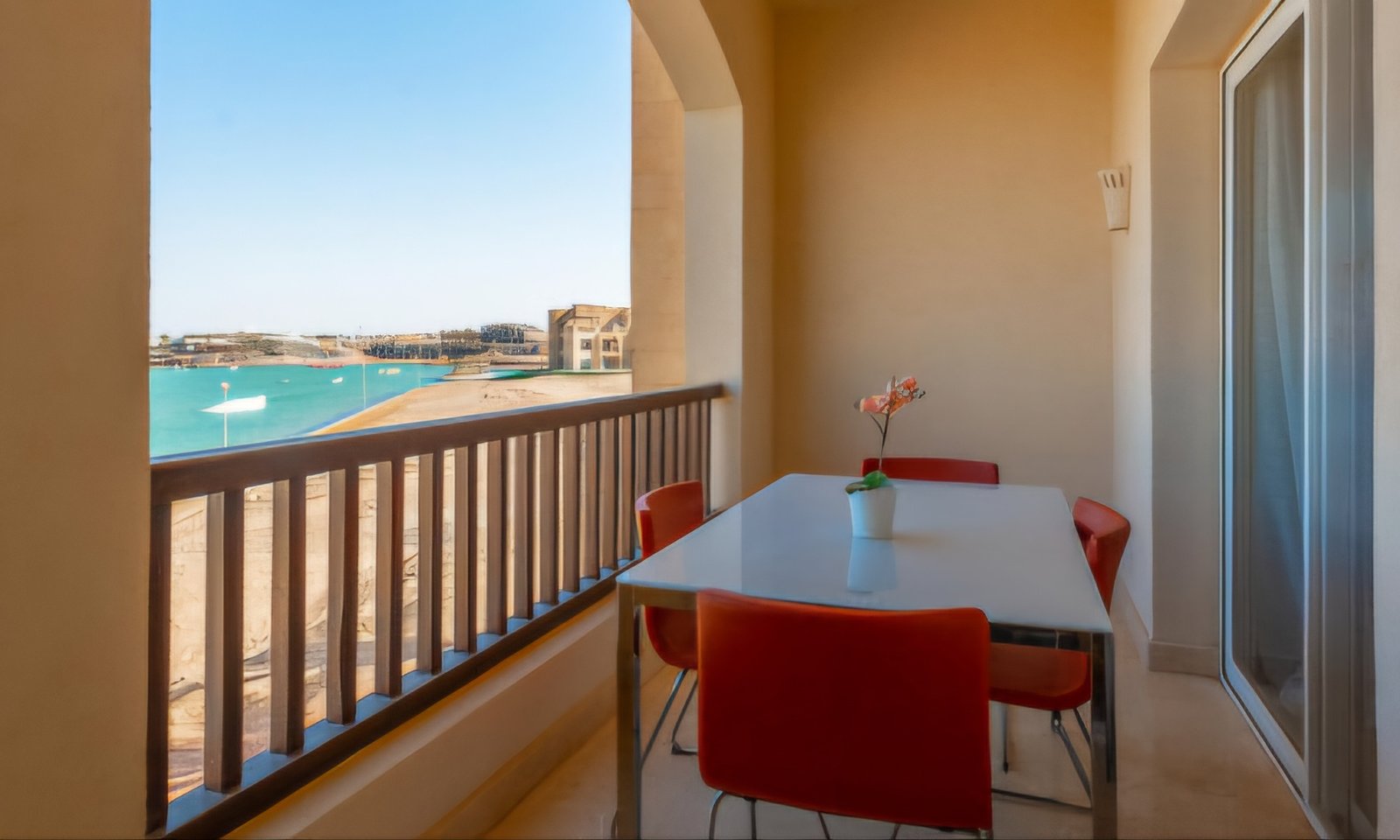 A recently built one bedroom apartment with swimming pool access in Waterside Condos compound located in El Gouna. Right next to the lagoon, the apartment has a spacious balcony with an extraordinary view on Wake Park and the lagoon. The living room is equipped with a dining table and a sofa bed (which is easily expandable into a double bed), so the apartment is a perfect choice for couples, groups of friends or families with children. TV receives both local and cable channels. Wi-Fi covers the entire property. There is a comfortable double bed in the master bedroom (optionally arranged as 2 single beds, just let us know the moment you book). Bathroom with shower right next to the bedroom. A kitchen with fridge, microwave, kettle, cooker and all essential kitchenware. Balcony with outdoor dining area and extraordinary view. Necessary amenities like washing machine, iron & ironing board, air conditioner etc. are provided. Baby crib can be available upon request.