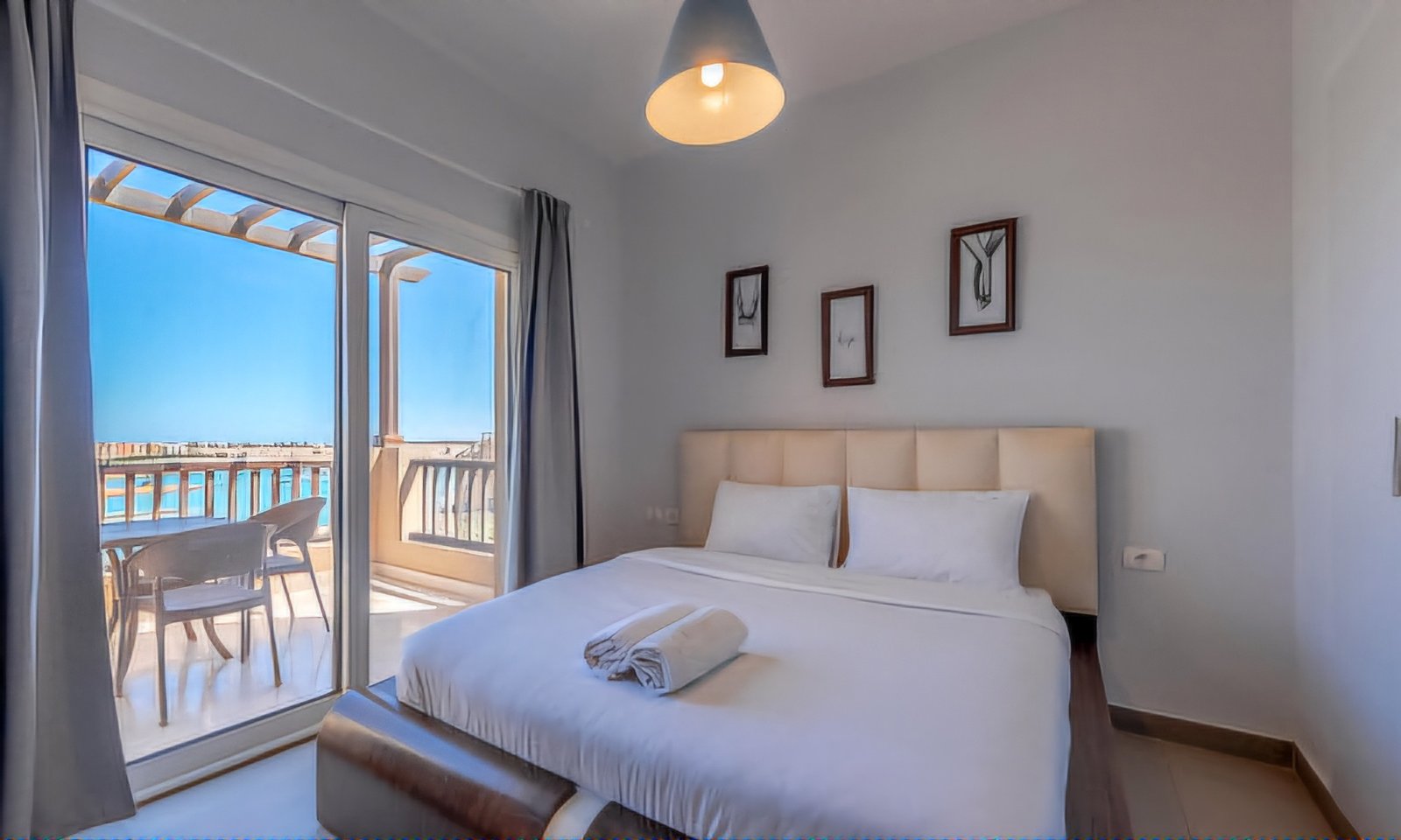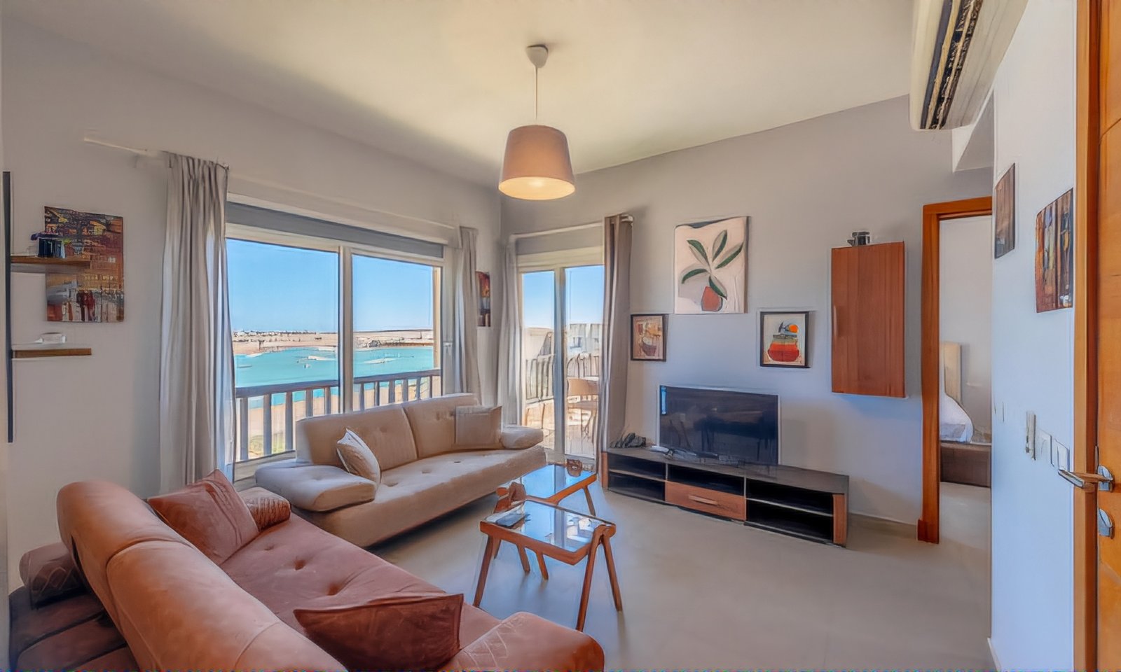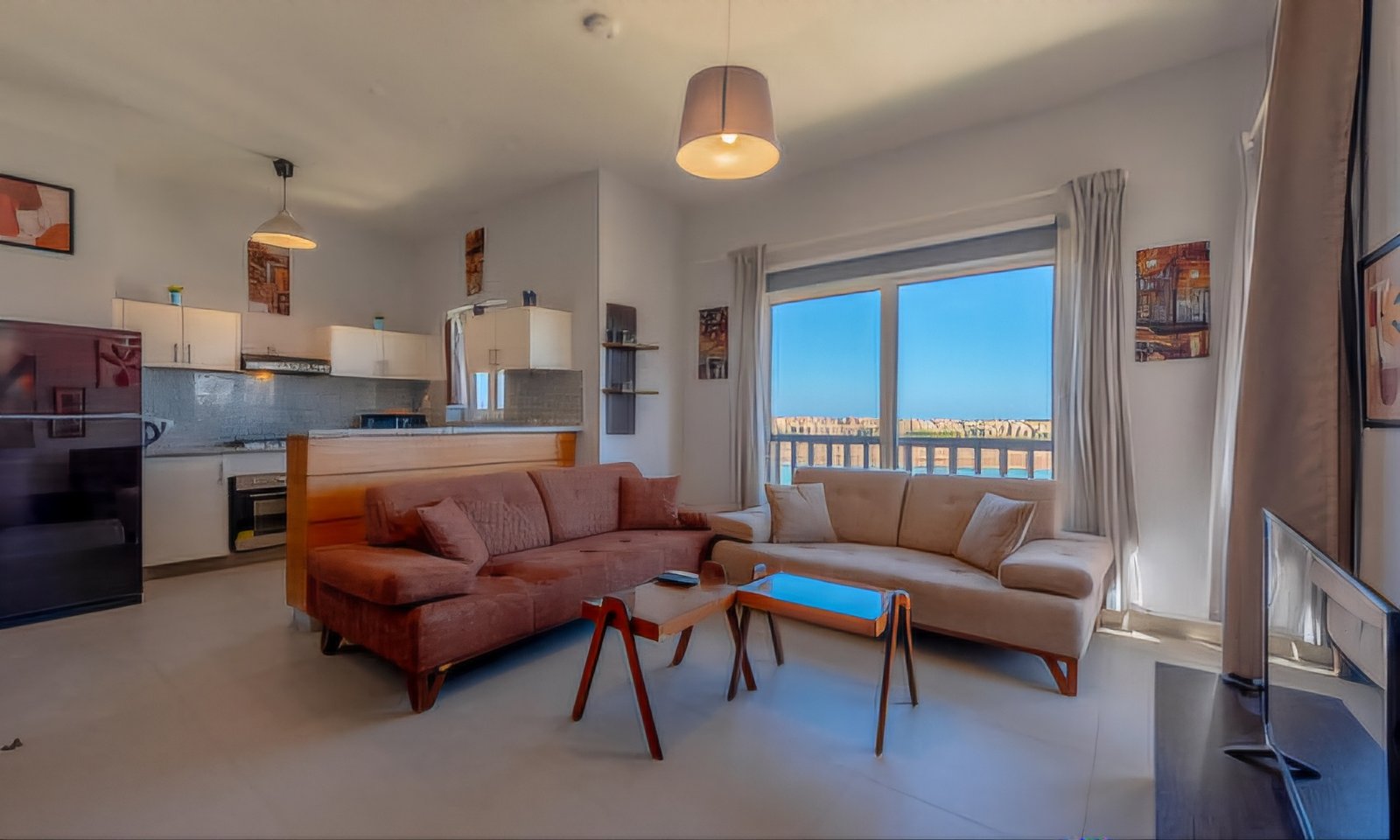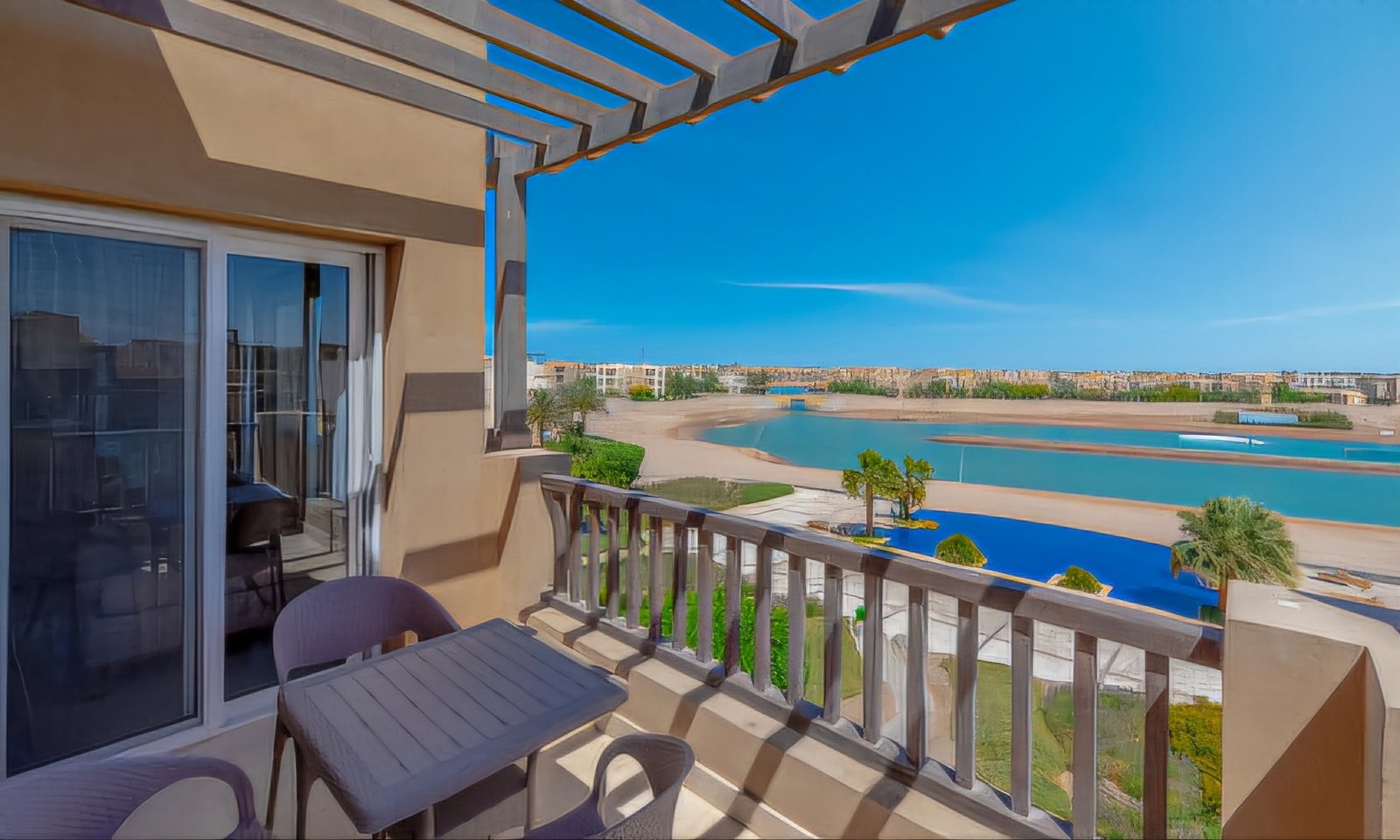 Bright and cozy, second floor 1-bedroom apartment with a beautiful infinity pool access located in Waterside, El Gouna. The apartment has a furnished balcony with an extraordinary view on the pool, lagoon & the wake park. In response to our guests needs, an outdoor dining set has been recently added. The living room is equipped with a dining table and 2 sofa beds, which are easily expandable to 2 single beds, so the apartment is perfect for couples, groups of friends or families with children There are 2 comfy sofas in the living room, with coffee tables and a TV. Sofas are easily expandable into 2 single beds, so the apartment is a perfect choice for both small families and group of friends. TV receives both local and cable channels. Free wireless internet covers the entire property. There is a comfortable double bed in the master bedroom. Bathroom with shower right next to the bedroom. A well equipped kitchen with fridge, microwave, kettle, cooker and all essential kitchenware. Both rooms are air-conditioned. Independent access 24h Free parking on premises.