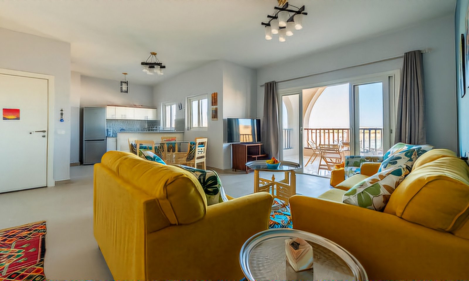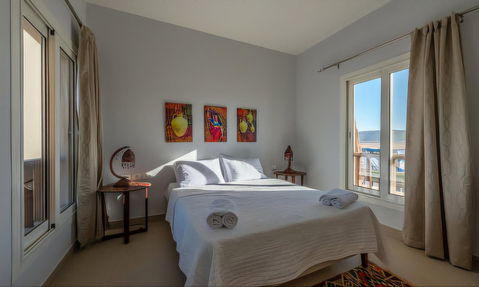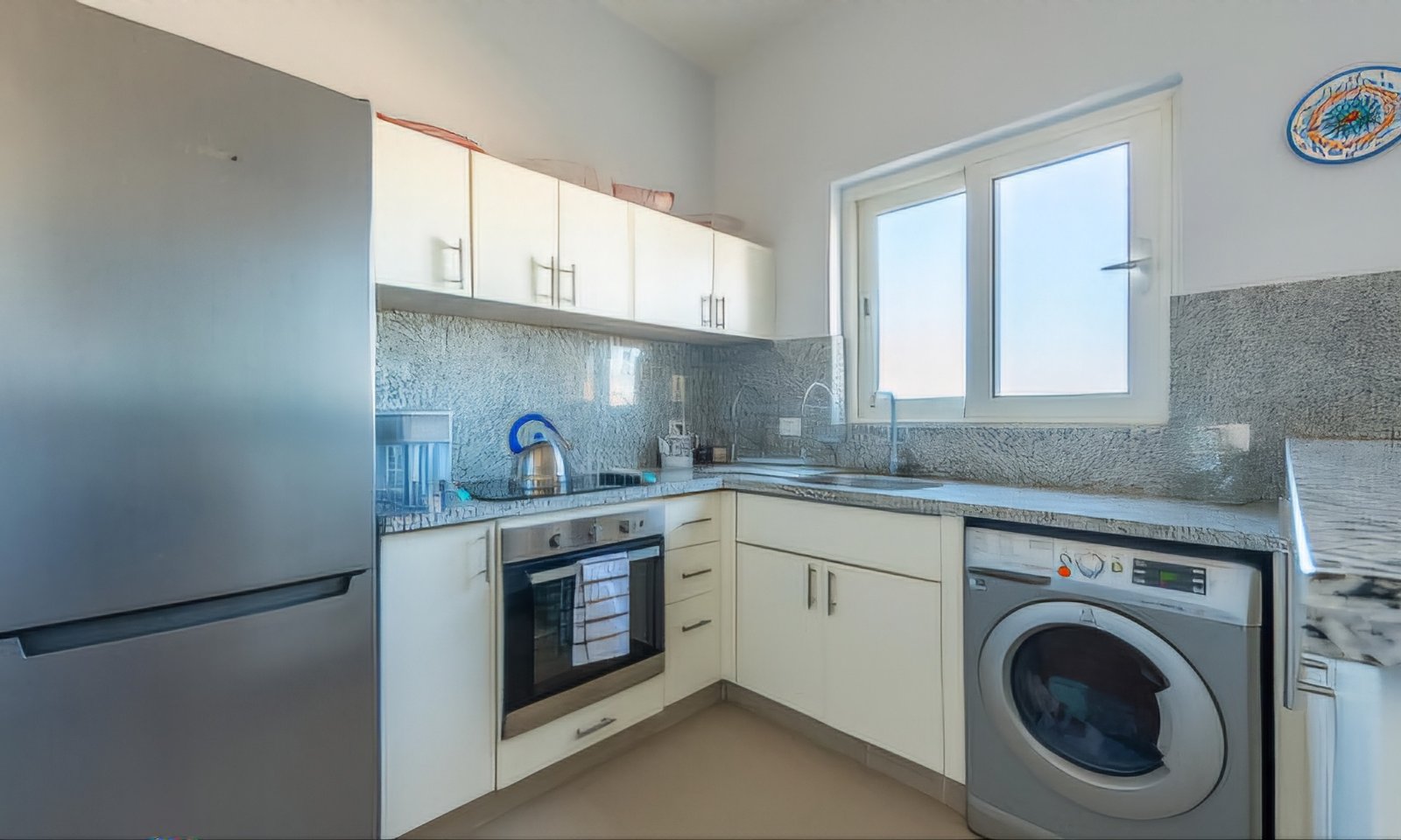 This spacious 3 bedroom apartment is located in newly built compound Waterside inside El Gouna, very attractive in location and view. The terrace, bedrooms and living room all share a breathtaking view, overlooking lagoon, pool and Sliders Cable Park. There are 3 bedrooms (two with a queen-sized bed, one with 2 bunk beds), 3 full bathrooms, maid room with an extra single bed, a cozy open-space living room, dining area, terrace with marvelous view and kitchen. The Apartment is primarily set up for 8 guests. The kitchen is fully equipped with brand new appliances: microwave, stove, oven, kettle, fridge, refrigerator and all necessary cooking tools.