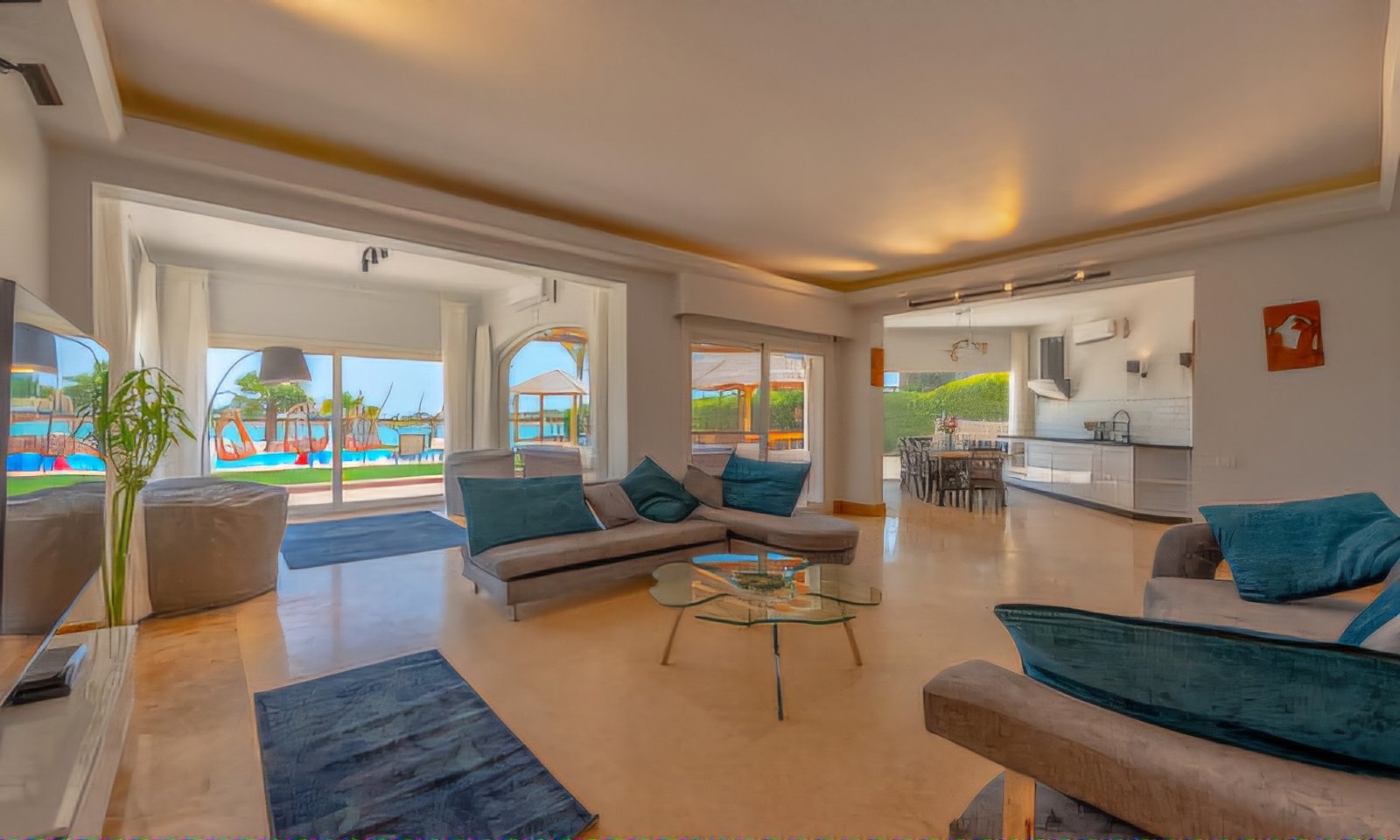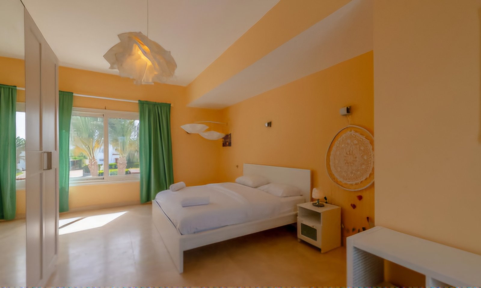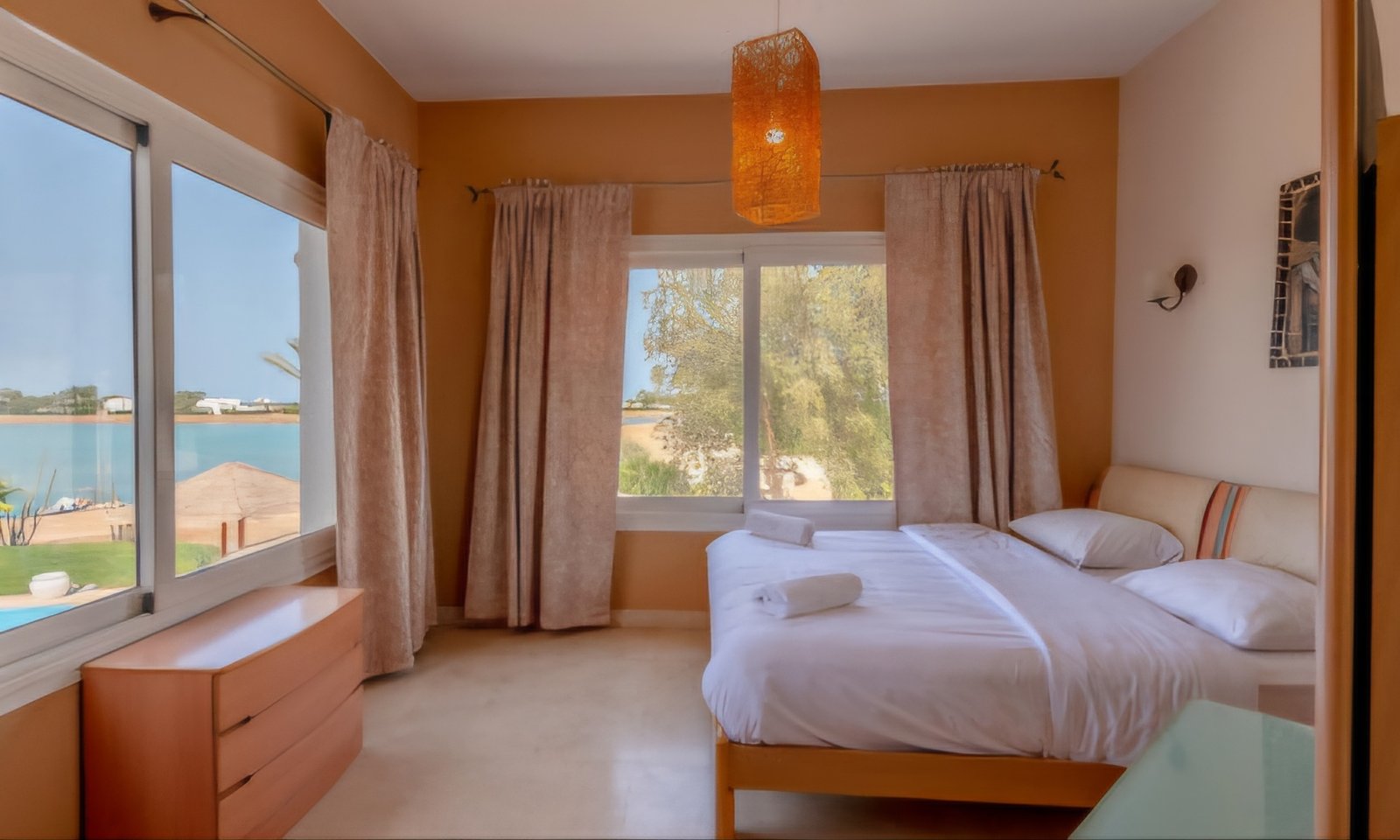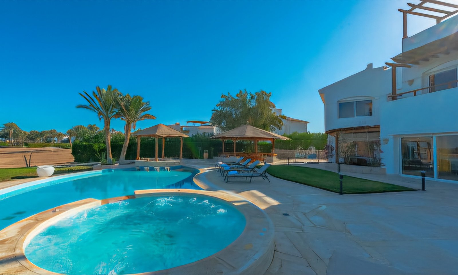 This beautiful 4 bedroom Villa with private heated pool and heated jacuzzi is located in Phase 4, White Villas, El Gouna. You can enjoy marvelous view overlooking lagoon. There is outside BBQ area with pergola and massive dining table. This spacious Villa has 4 bedrooms, each with private ensuite bathroom featuring shower. Each bedroom has a queen size bed, perfect for 4 couples, family or group of friends. Prime location with only 6 min drive to DownTown and Marina Abu Tig. The Villa features: Big swimming with shallow end for kids. There is brand new heater making sure the water is heated well. Jacuzzi with separate brand new heater, bubbles and hydro massage. Both Pool and Jacuzzi are cleaned daily early in the morning by expert. BBQ right next to pergola with massive dining table and chairs. Kitchen with : microwave, stove, oven, dish washer, kettle, fridge, refrigerator, pots, pans, plates, glasses and all necessary cooking tools. Spacious living room with big comfortable couches and Flat screen TV Free WIFI Terrace with comfortable outdoor sofas. 4 Master Bedrooms each with private bathroom and queen size bed. AC and wardrobe. One of the bedrooms is on the ground floor, 3 are on the first floor. 6 sunbeds by the pool. Parking for easily up to 5 cars (3 parking spaces are shaded with pergola) Washing machine, iron and ironing board are available. All rooms are equipped with AC. We want you to feel at home, so we provide fresh clean towels, sheets, pillows and duvet. All washed in professional laundry. The Villa is very quiet, classy and neat. There is outside driver’s / nanny’s room with bathroom and fridge. (Please request this option in advance) Please note that the entry to the ground floor bedroom is from the side of the Villa. This is originally a 5 bedroom house and it’s offered as a 4 bedroom as one of the rooms upstairs is closed. There is a sofa-bed in the 4th bedroom.